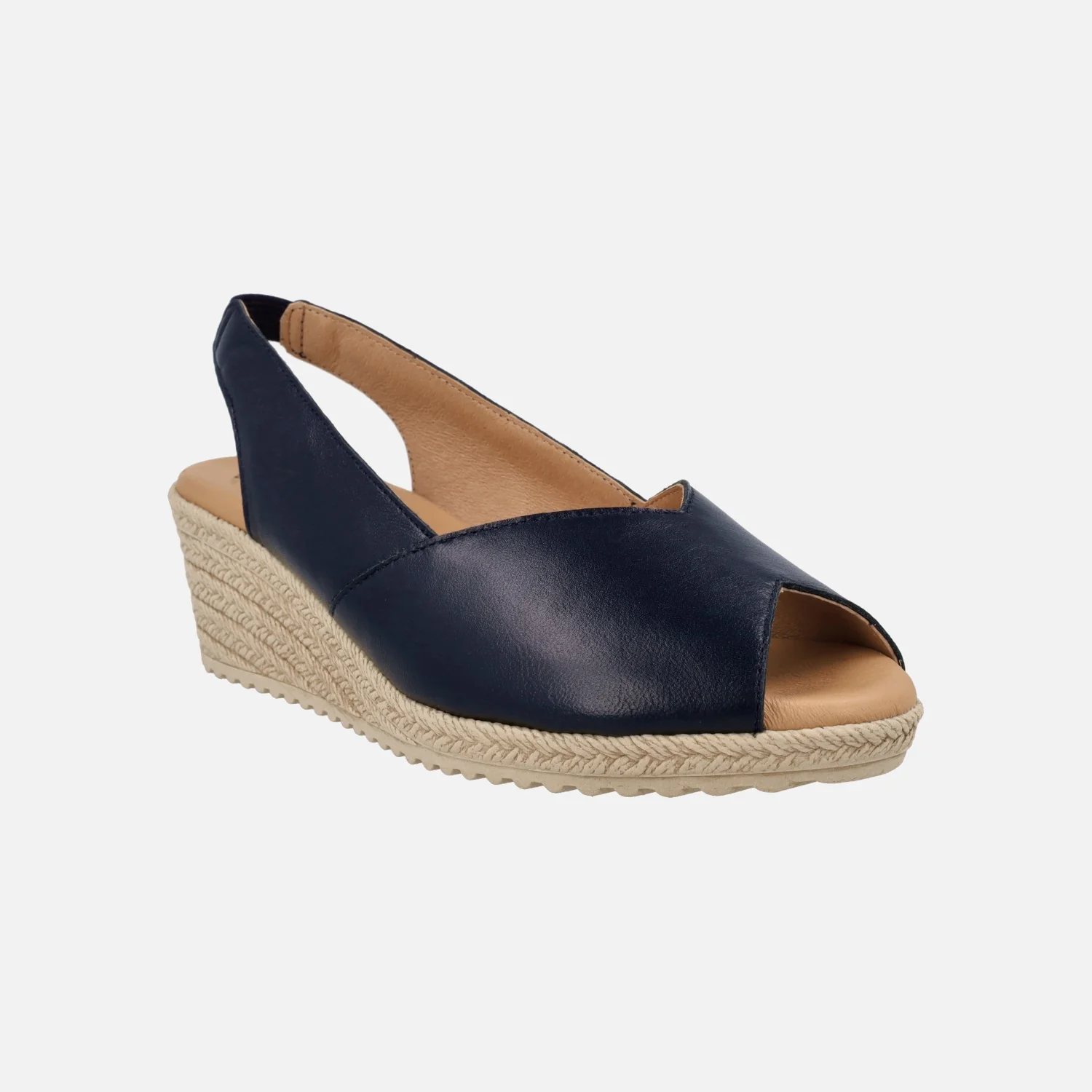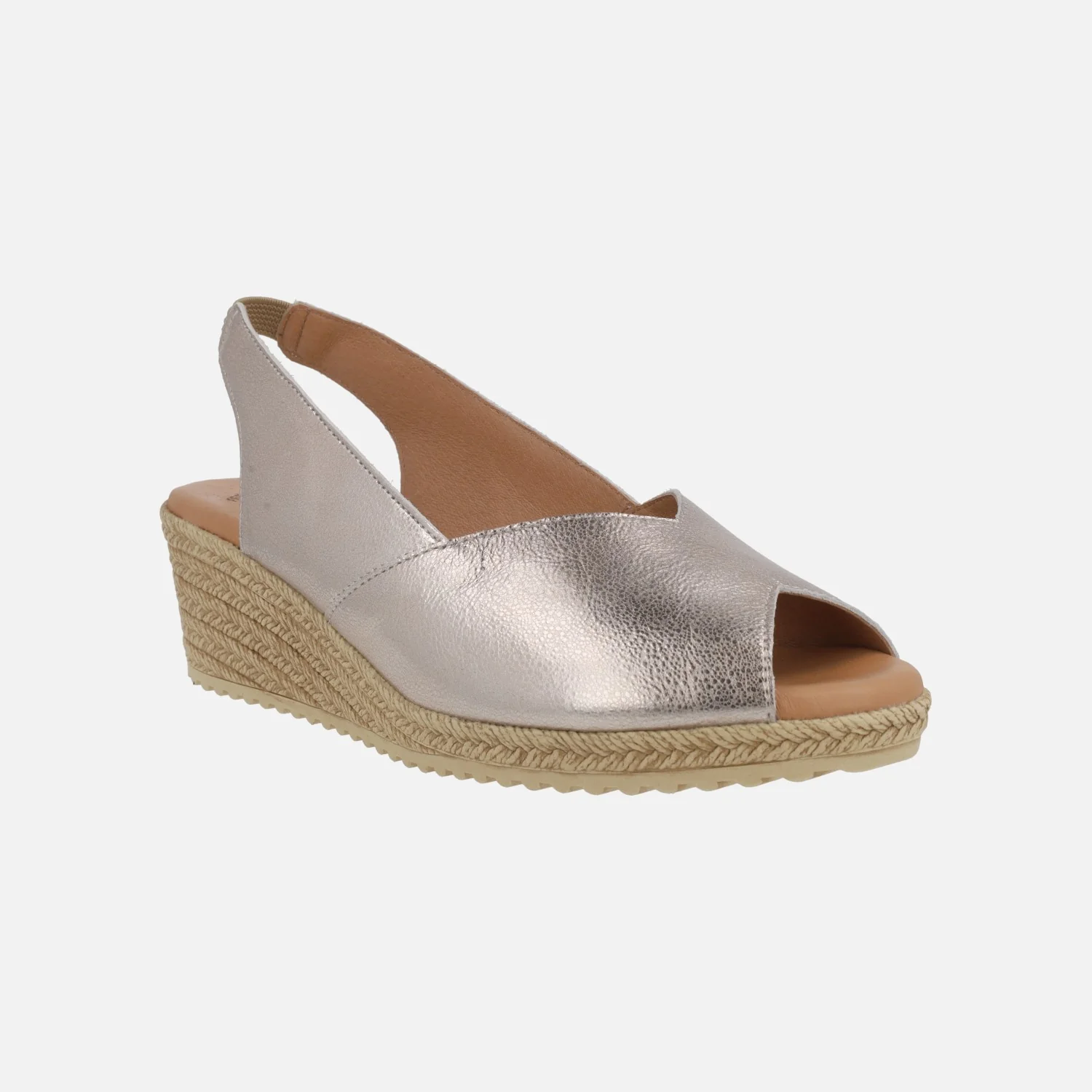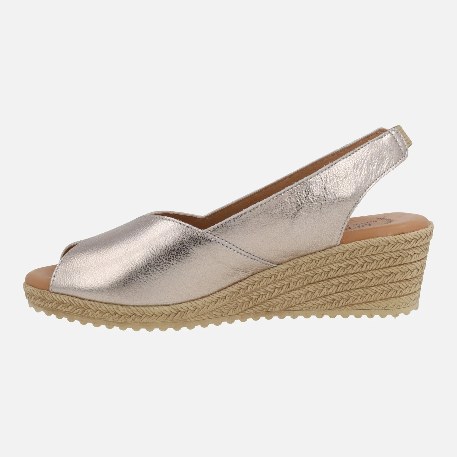 Sandalias de piel de la marca Kaola, modelo 193, disponibles en platino (oro claro) y azul marino. Sandalias abiertas de puntera y destalonadas, con elástico en la tira del talón para un mayor ajuste. Forro y planta de piel. Cuña de goma, imitando esparto, de 5,5 cm de altura trasera (1,5 cm parte delantera).