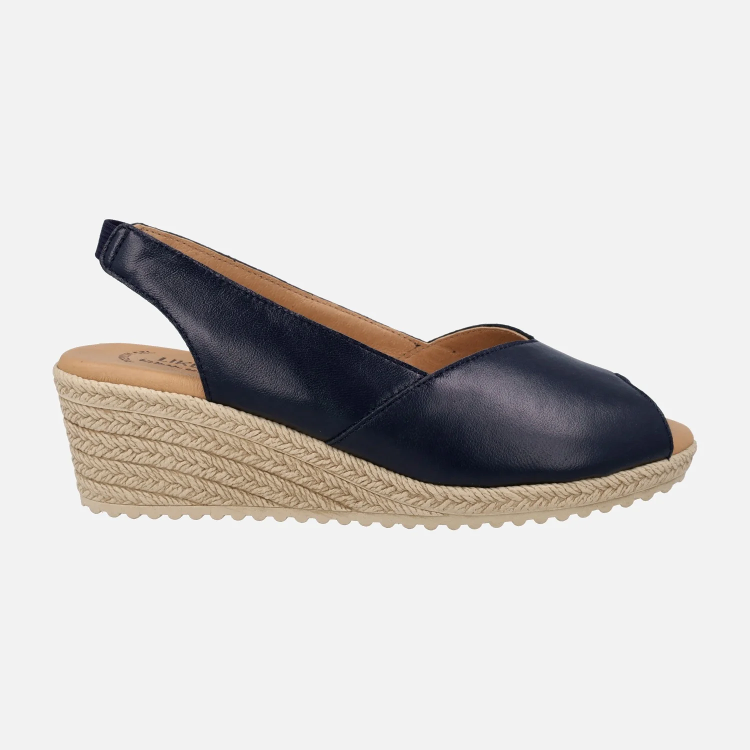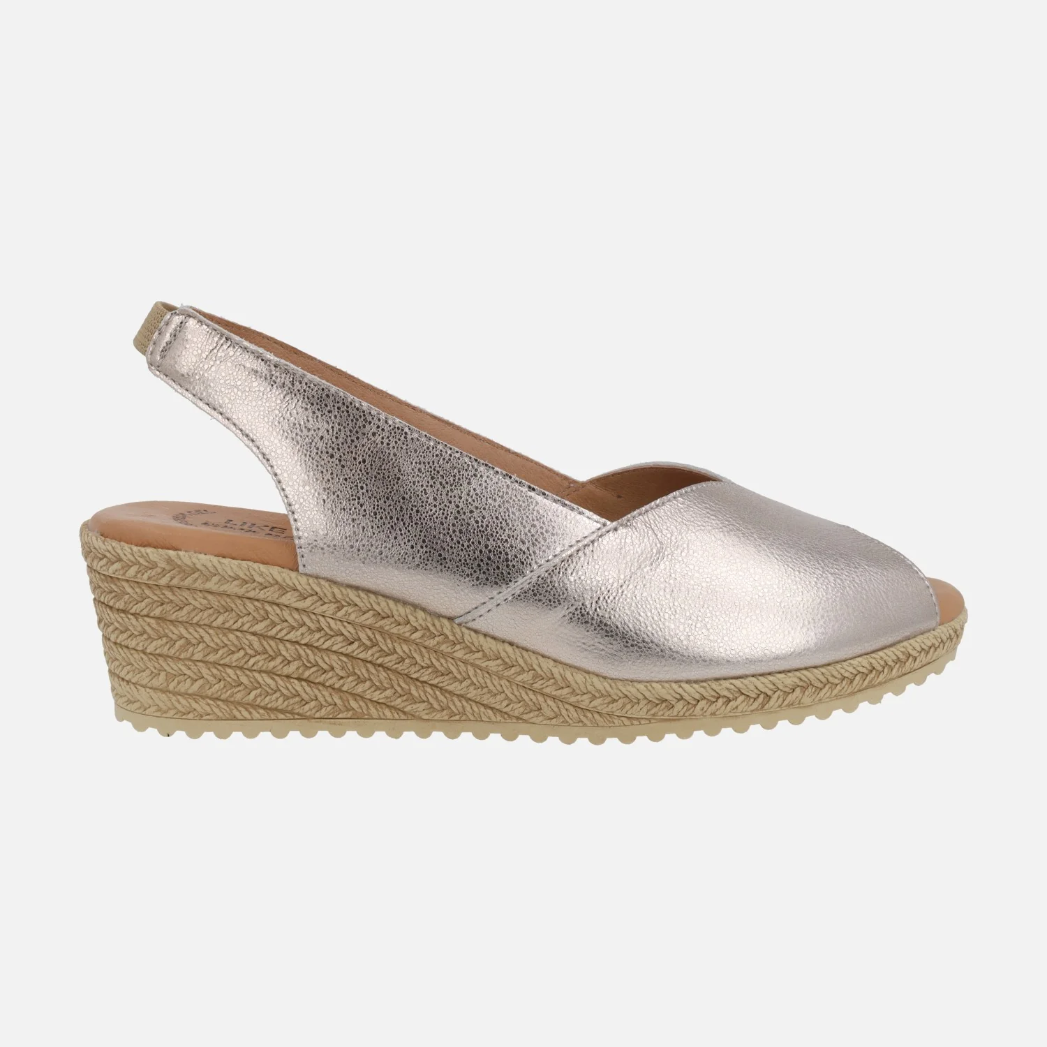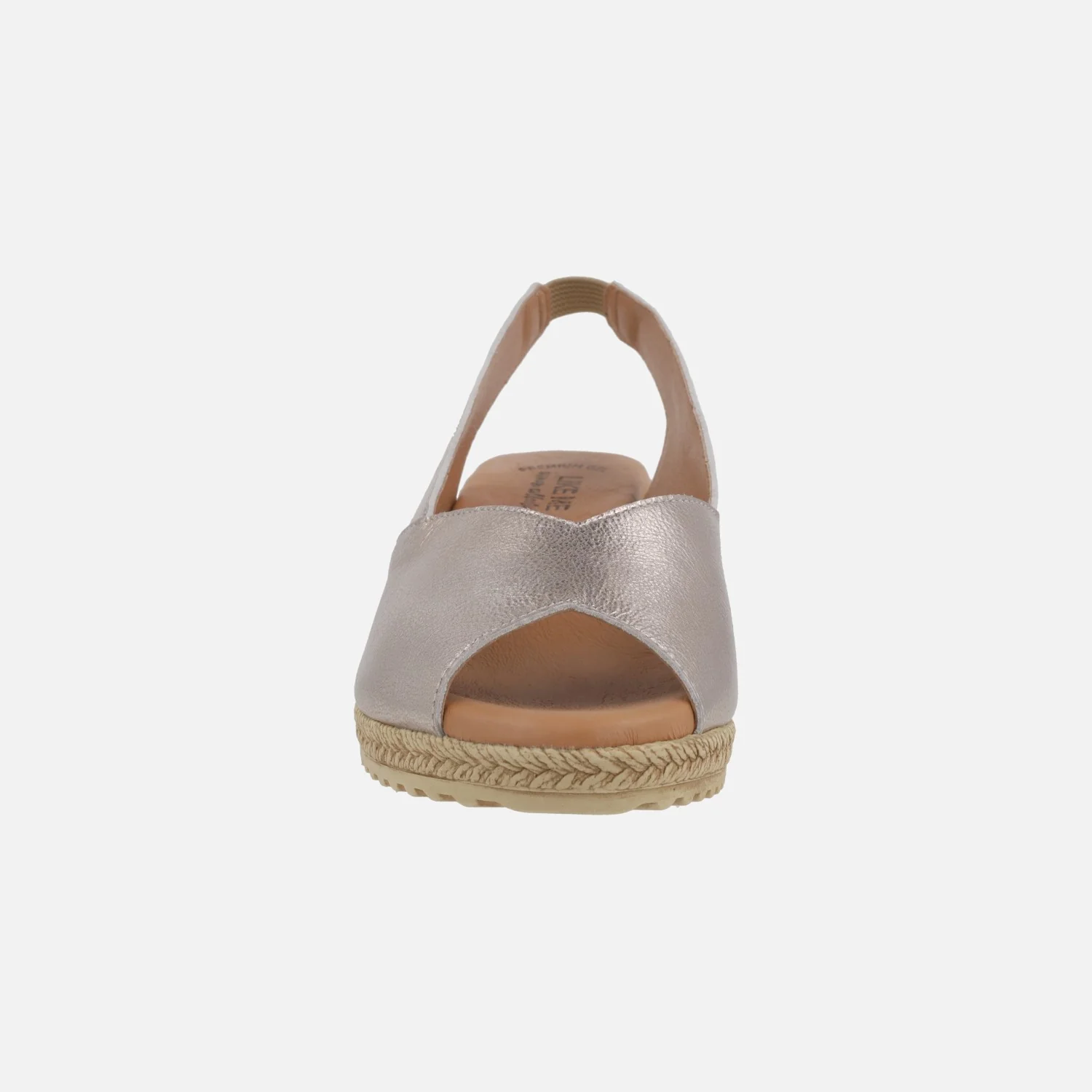 Sandalias de piel de la marca Kaola, modelo 193, disponibles en platino (oro claro) y azul marino. Sandalias abiertas de puntera y destalonadas, con elástico en la tira del talón para un mayor ajuste. Forro y planta de piel. Cuña de goma, imitando esparto, de 5,5 cm de altura trasera (1,5 cm parte delantera).