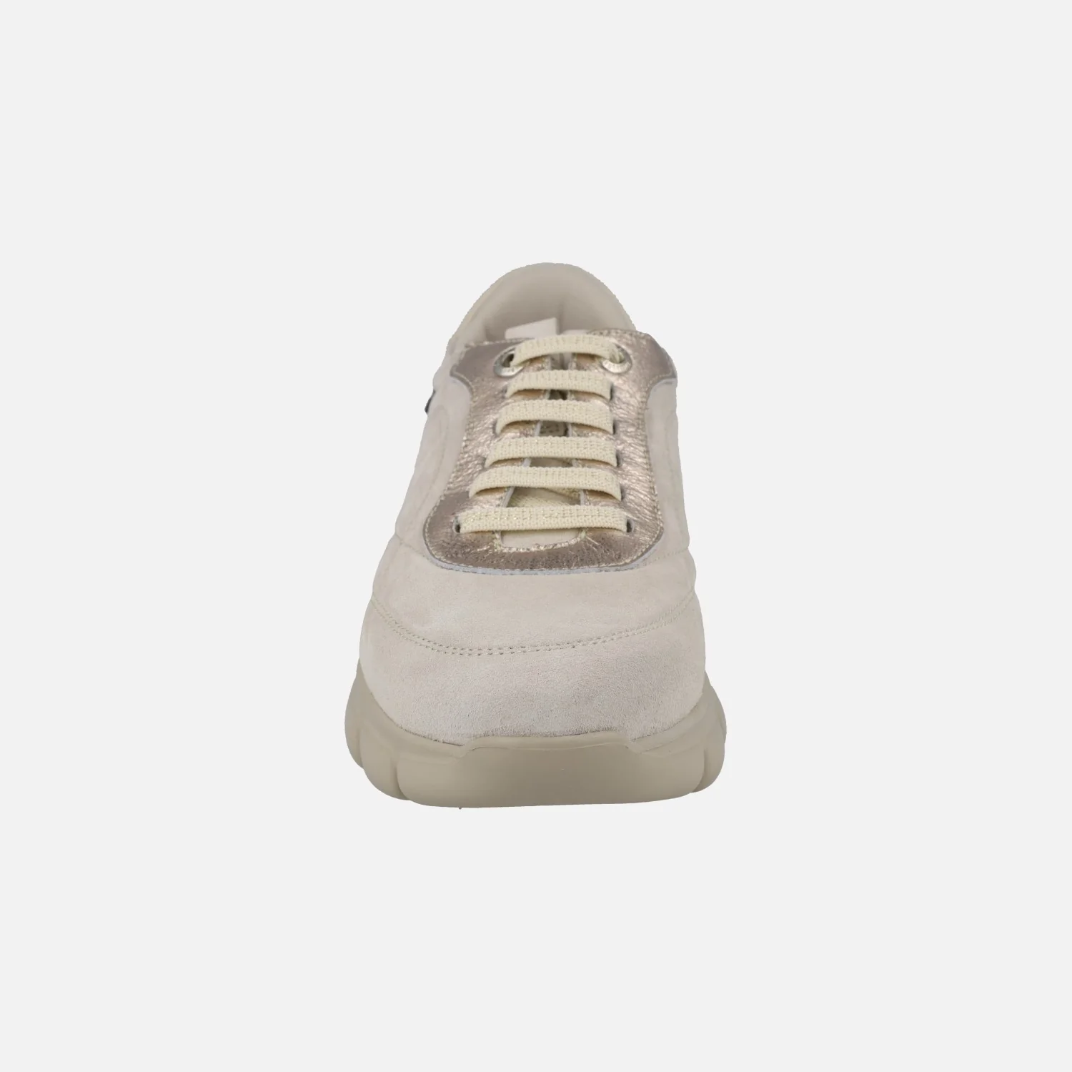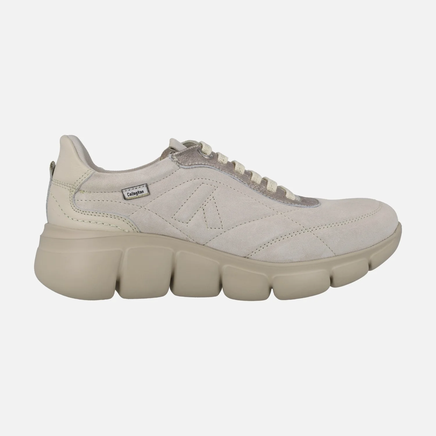 Zapatillas deportivas para mujer de la marca Callaghan modelo 64701 Ballon Marfil. Deportivas combinadas en piel y serraje en color beige con detalles en dorado. Cierre de cordones elásticos que atan. Interior textil, plantillas extraíbles. Piso XL Extralight, de peso mínimo, con una altura trasera de 4,5 cm (2,5 cm parte delantera). Sistema Easy fit de calzado fácil, para calzarlos sin necesidad de usar las manos.