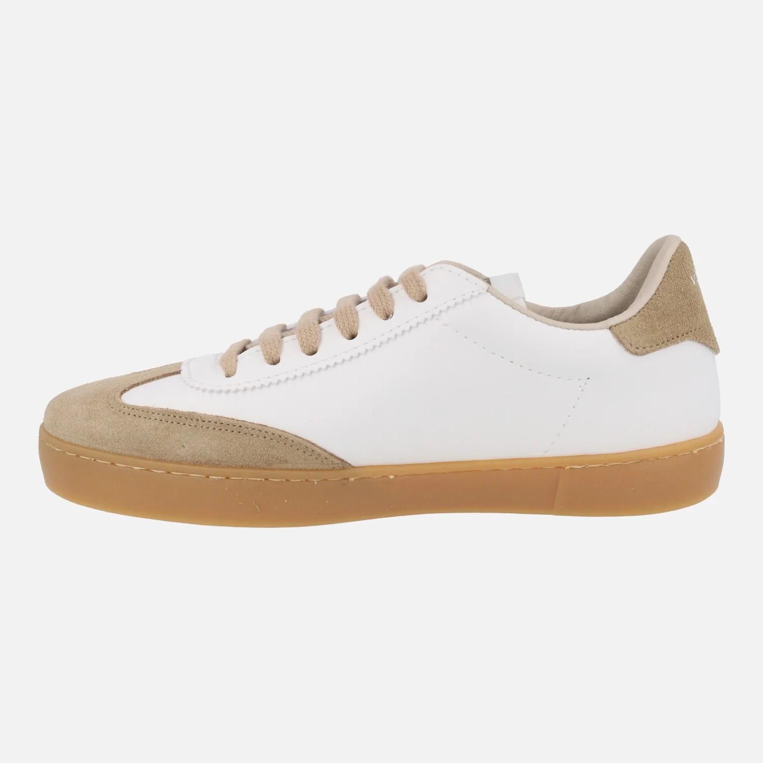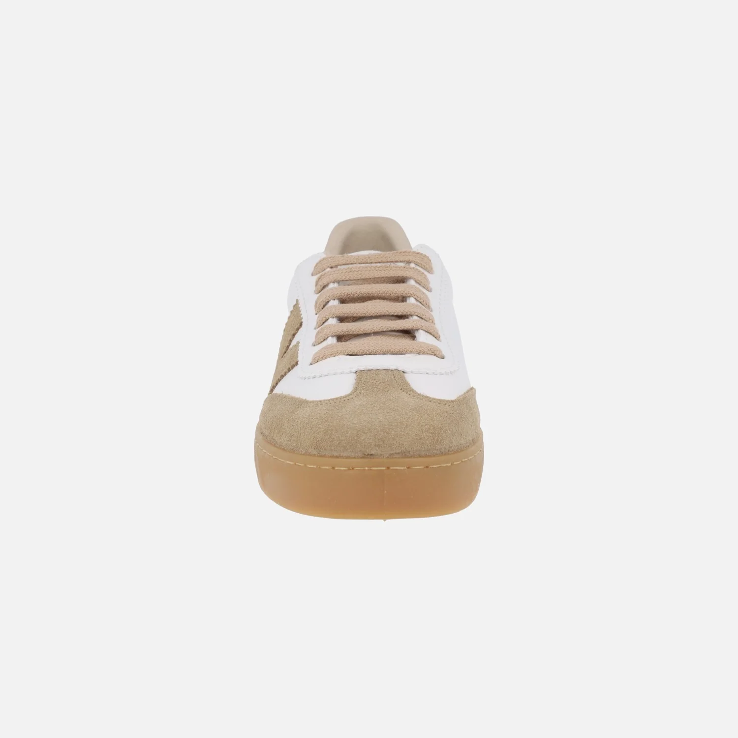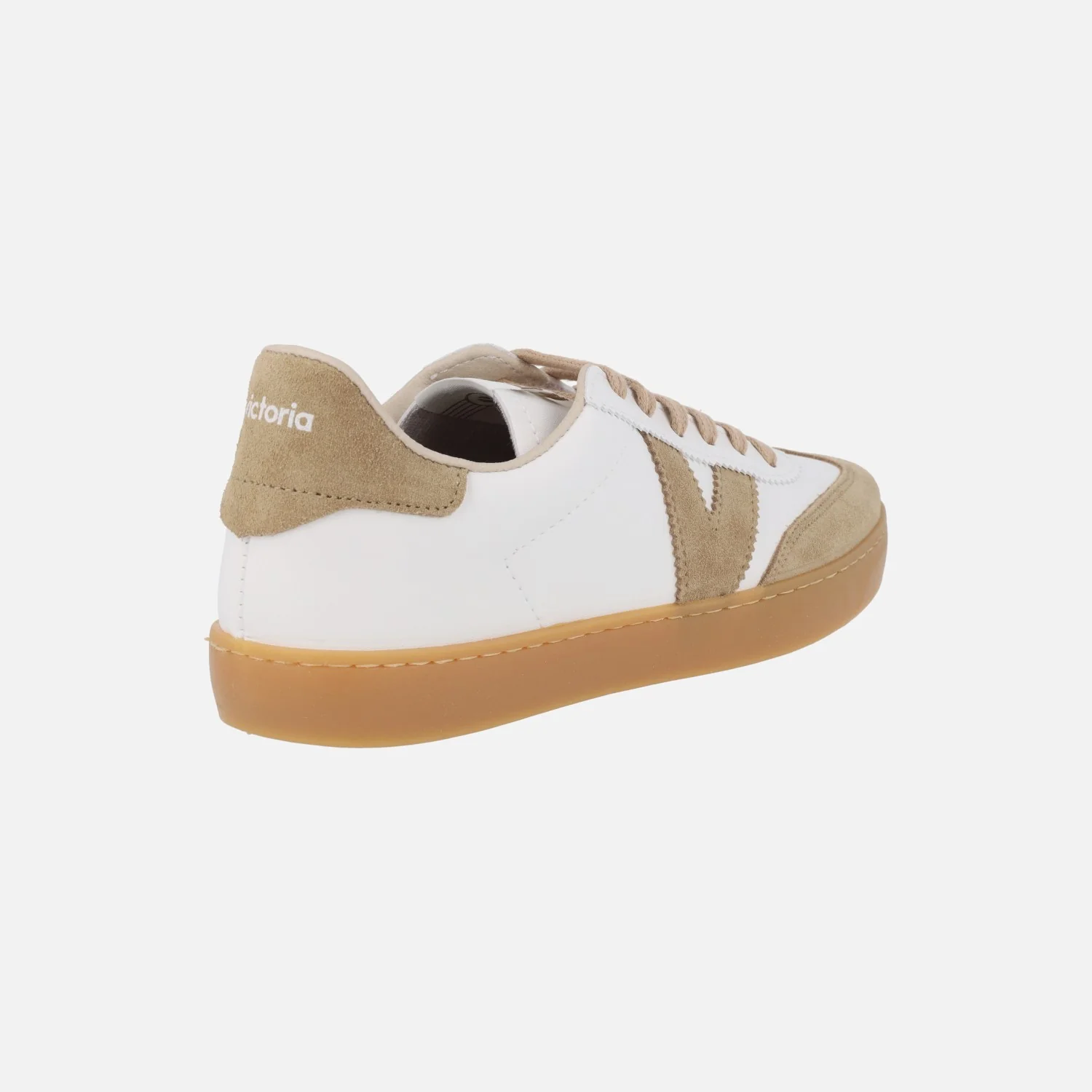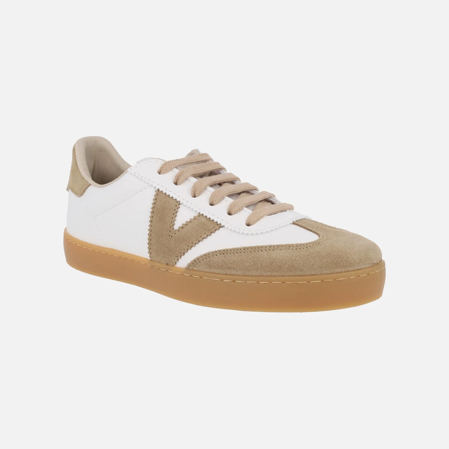 Zapatillas deportivas para mujer de la marca Victoria modelo 1126207 Berlín ciclista efecto piel y serraje, disponibles en combinado beige y blanco. Sneakers elaboradas en serraje beige combinado con materiales sintéticos en blanco (textura piel). Cierre de cordones. Interior textil. Piso de goma color caramelo, de 2,5 cms de altura.