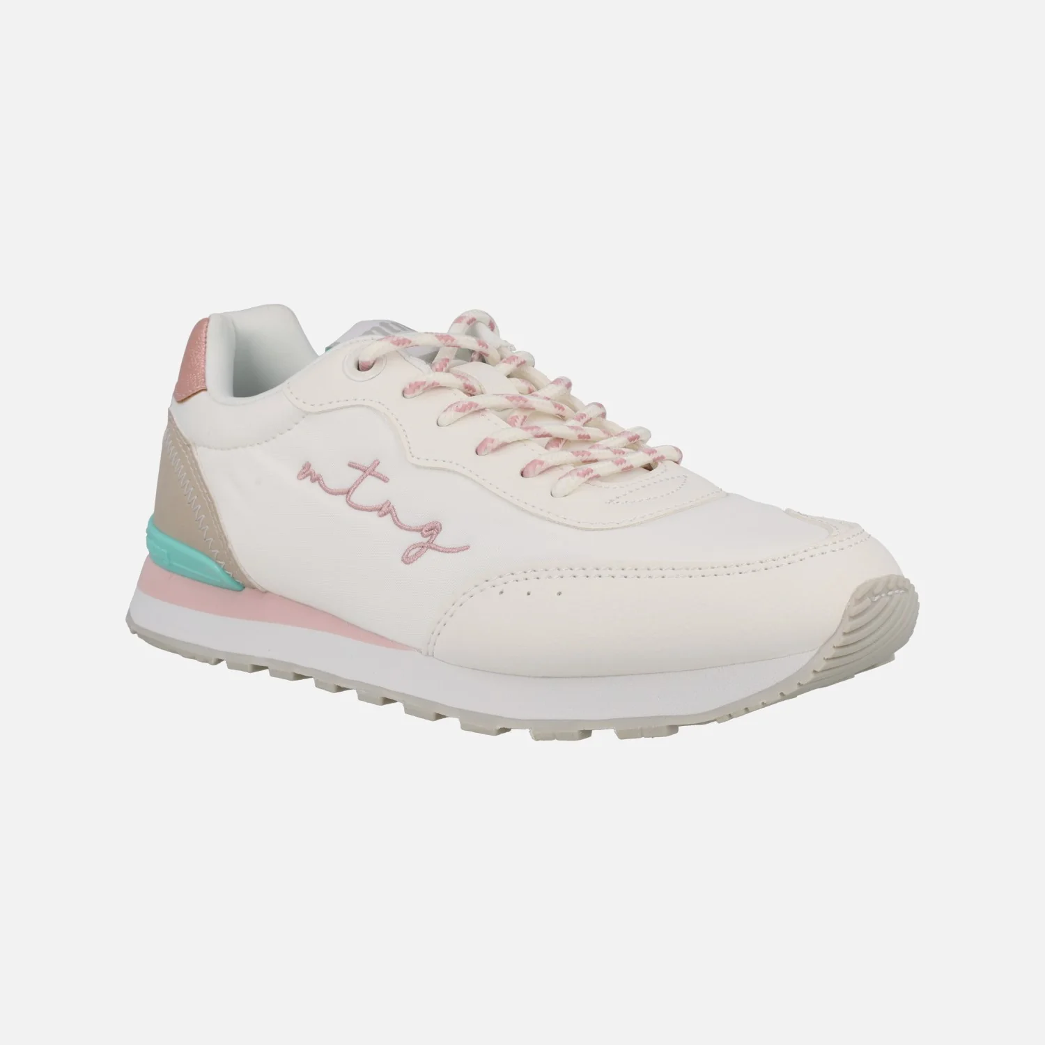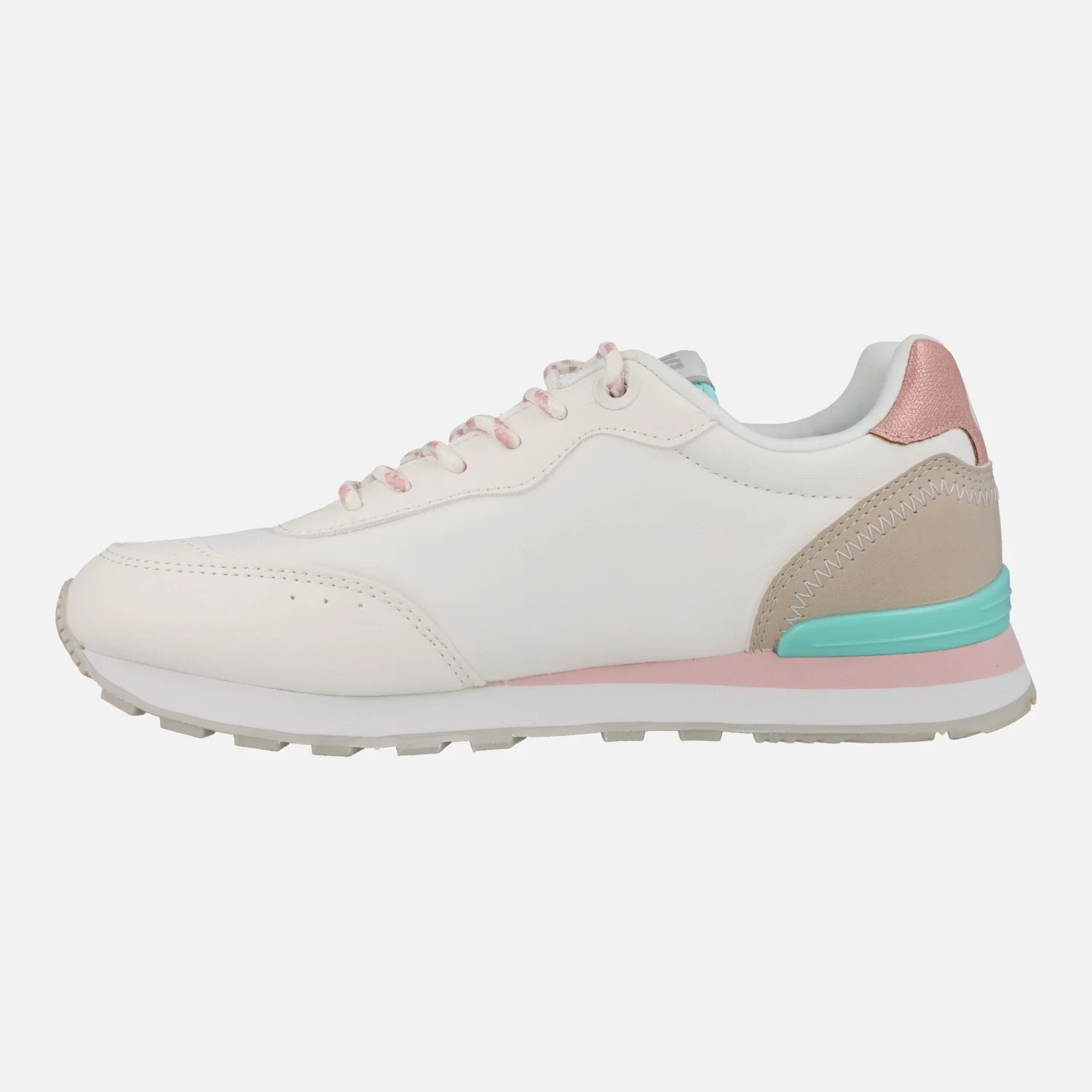 Zapatillas deportivas para mujer de la marca Mustang modelo 60439 Nole Blanco/Syas Rosa. Sneakers elaboradas en tejido y sintéticos, con fondo blanco y detalles de color. Cierre de cordones. Interior textil, plantillas extraíbles. Logo MTNG de Mustang bordado en el lateral exterior. Piso de goma, con una altura de 2 cms en la parte trasera.