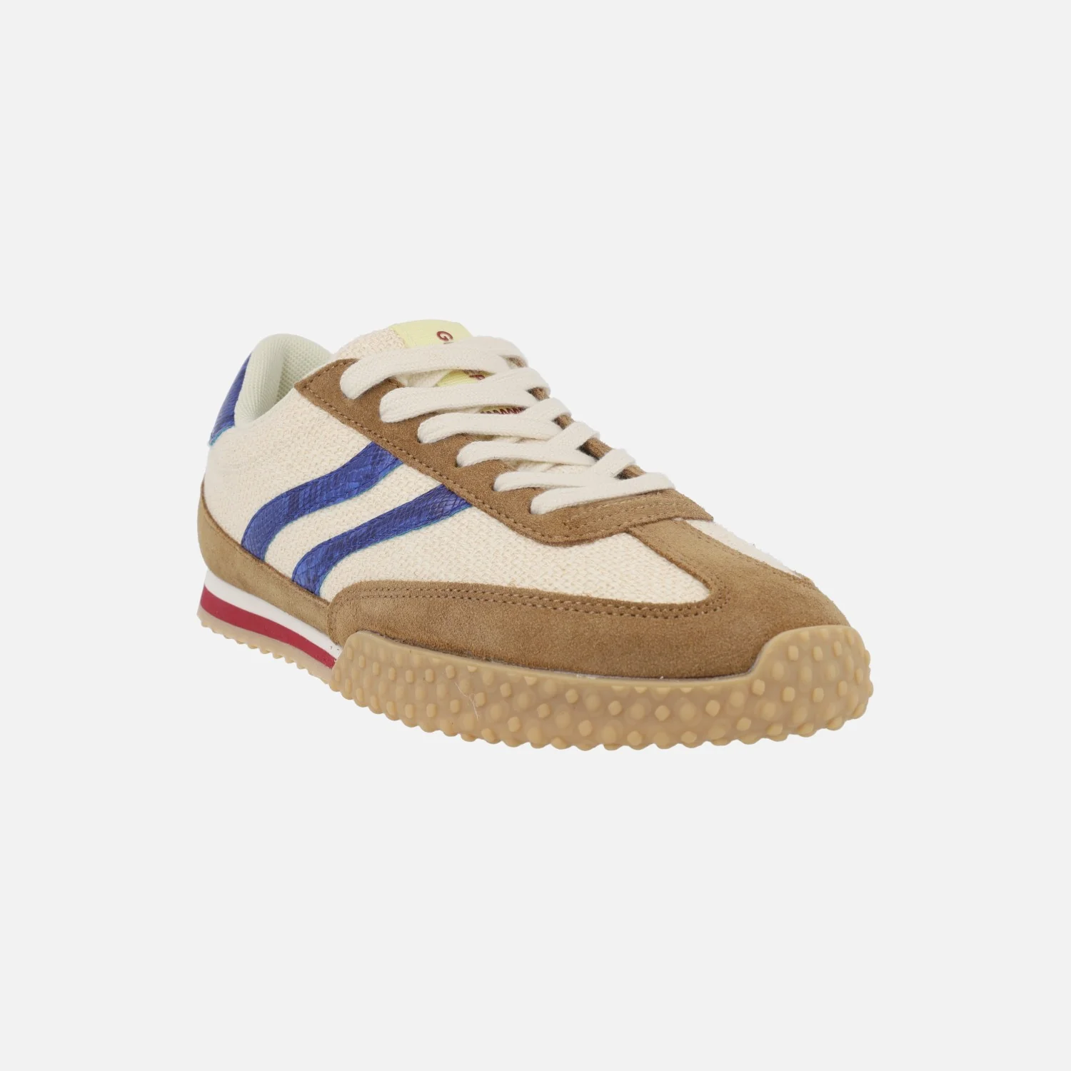 Preciosas zapatillas deportivas para mujer de la marca Gioseppo, modelo BLOMKEST 78623 Beige. Zapatillas elaboradas en tejido lino beige, combinado con serraje camel y detalles en sintético azul. Cierre de cordones textiles. Interior textil de poliéster transpirable con plantillas extraíbles. Suela de caucho, entresuela de EVA. Altura trasera 3 cm aproximadamente (2 cm plataforma delantera).