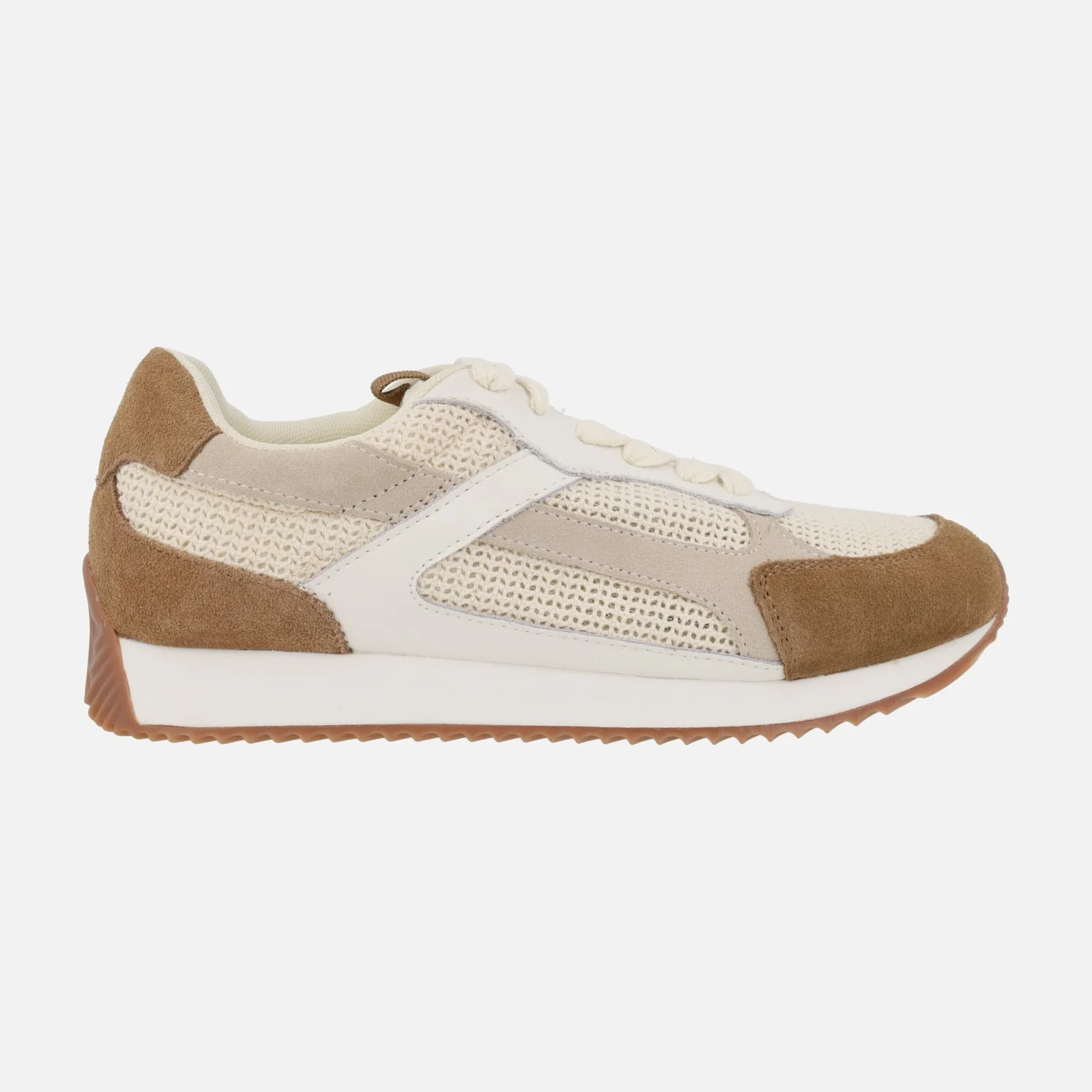 Zapatos deportivos para mujer de la marca Gioseppo modelo 78054 BUSIA Beige. Deportivas elaboradas en combinado de piel, serraje y tejido crochet, en tonos marrones y beige. Cierre con cordones textiles. Interior textil. Plantillas extraíbles. Piso de goma con una pequeña cuña de 3,5 cm de altura trasera (2 cm parte delantera).