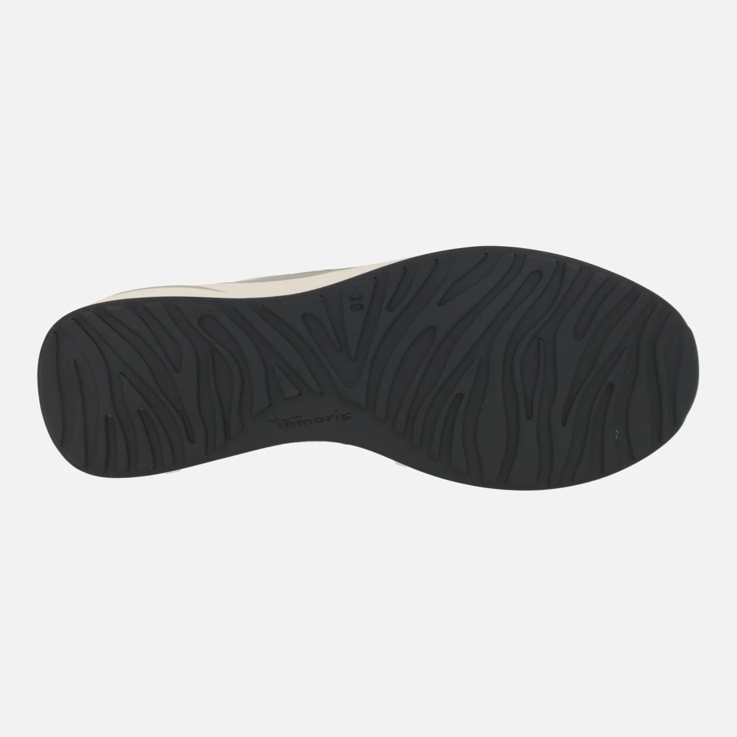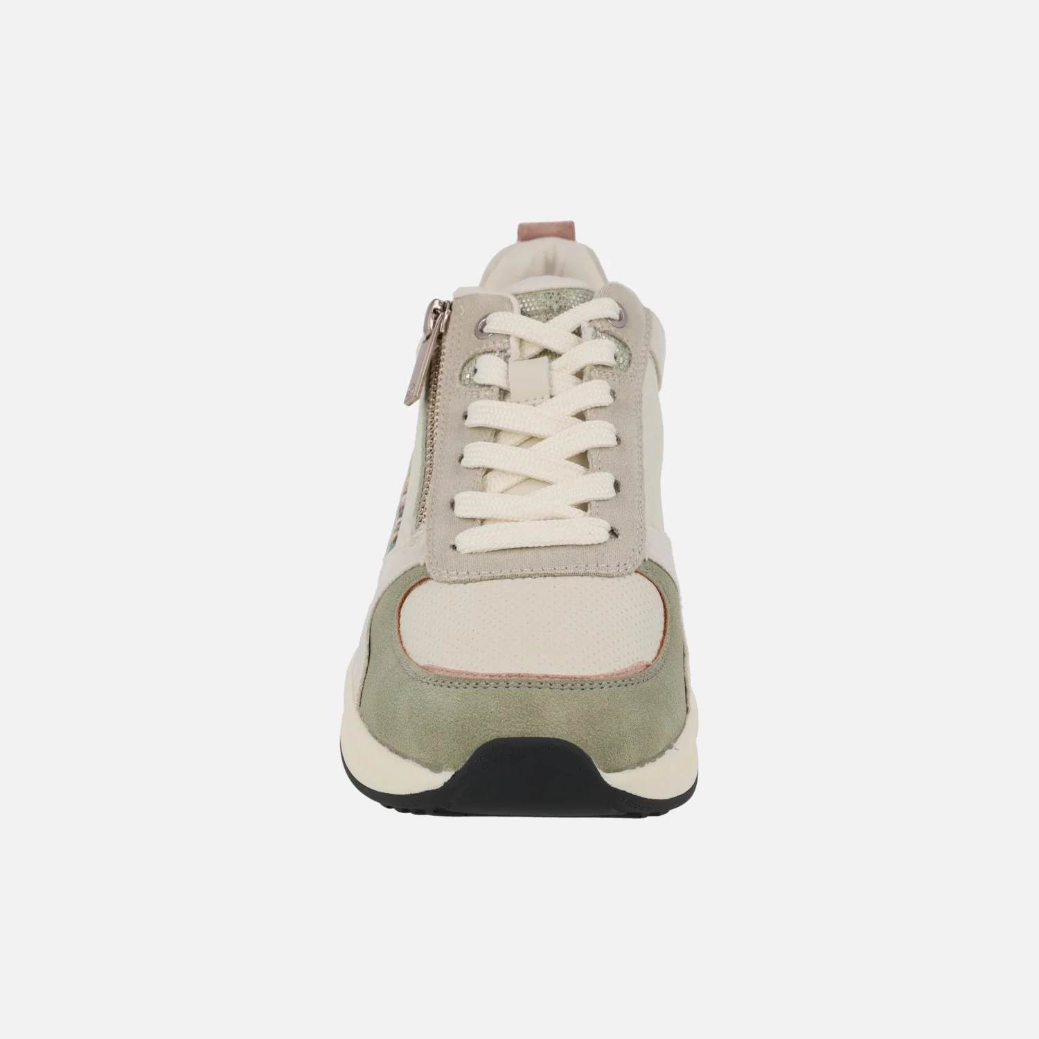Zapatillas deportivas Tamaris Essentials modelo 1-23754-45 770 Sage. Deportivas con cuña baja, de aproximadamente 4 cm de altura trasera, con exterior elaborado en combinado de materiales sintéticos y textiles. Interior también en combinado de materiales textiles y sintéticos, con plantillas extraíbles. Piso sintético con cuña trasera, muy confortable. Cierre con cordones textiles y además cremallera en el lado exterior, para mayor facilidad en la puesta. Altura trasera 4 cm aproximadamente, con 2 cm de plataforma delantera. Combina verde con detalles en rosa y distintos tonos de beige.
