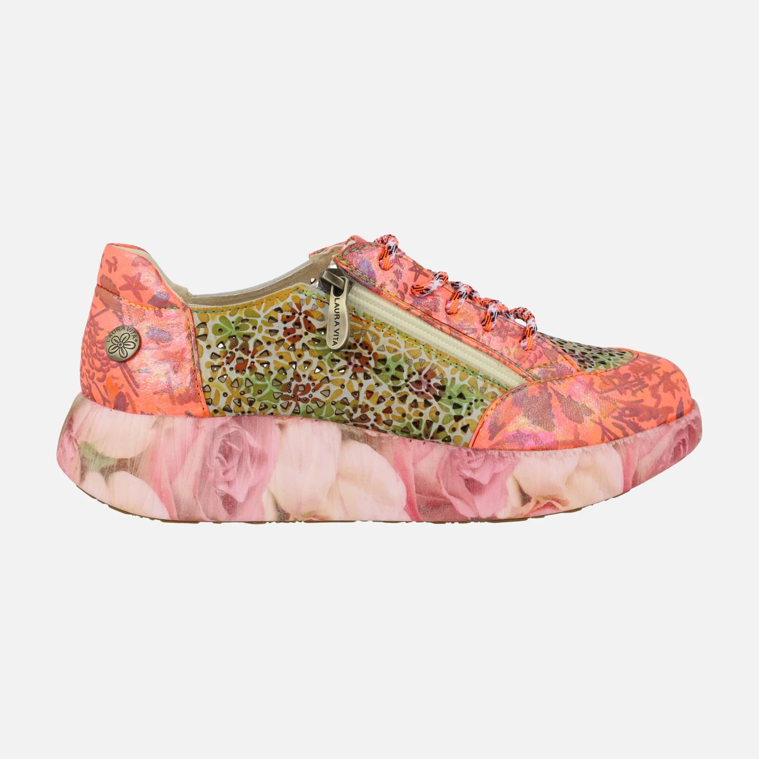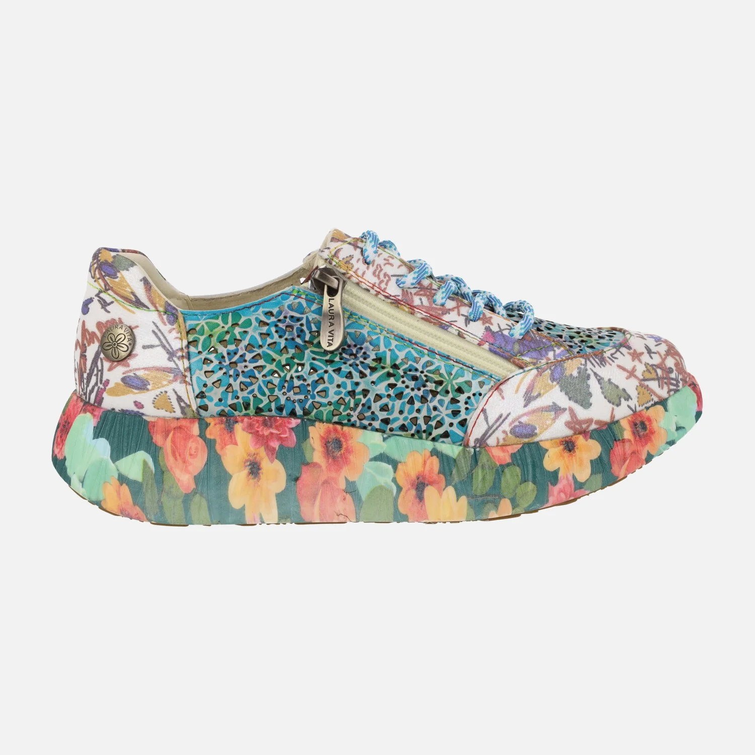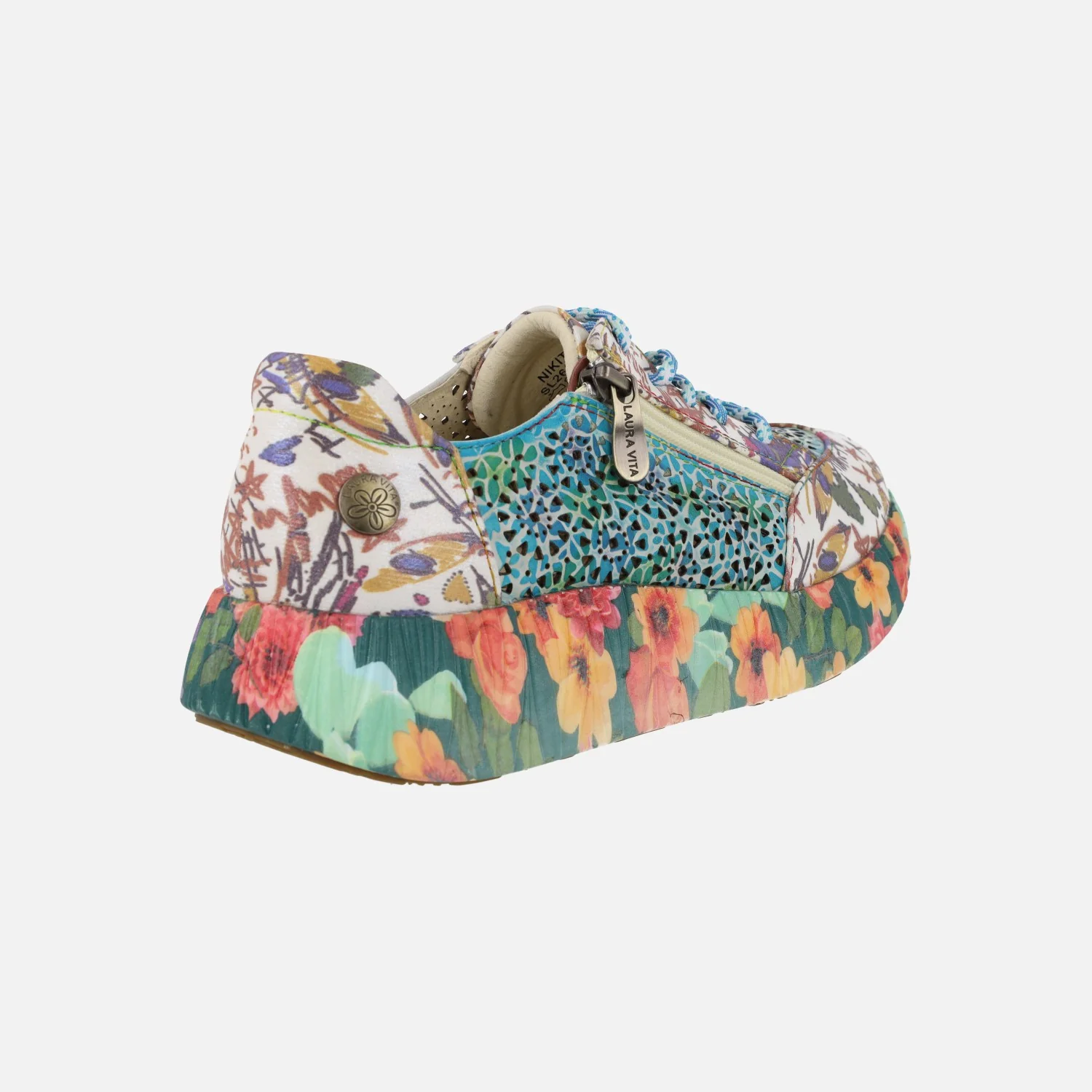 Preciosas deportivas Laura Vita modelo Nikito 57, disponibles en combinado Salmón (saumon) o turquesa (turquoise). Sneakers con cierre de cordones, elaboradas en combinado de piel y tejido, con cremallera lateral y motivos de flores. Forro y planta de piel. Plantillas extraíbles. Piso de goma, con motivos de flores, de aproximadamente 4 cms de altura en la parte trasera (2,5 cms parte delantera).