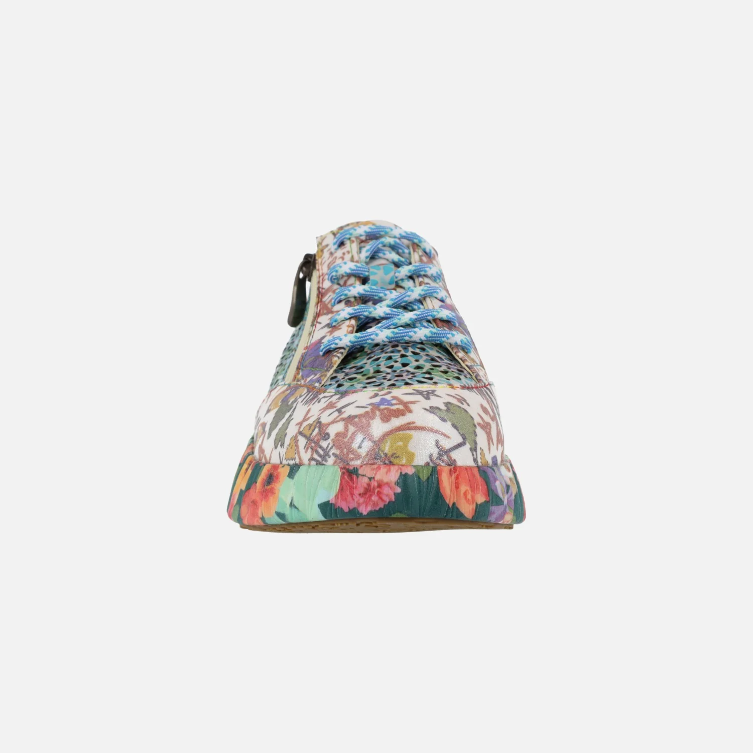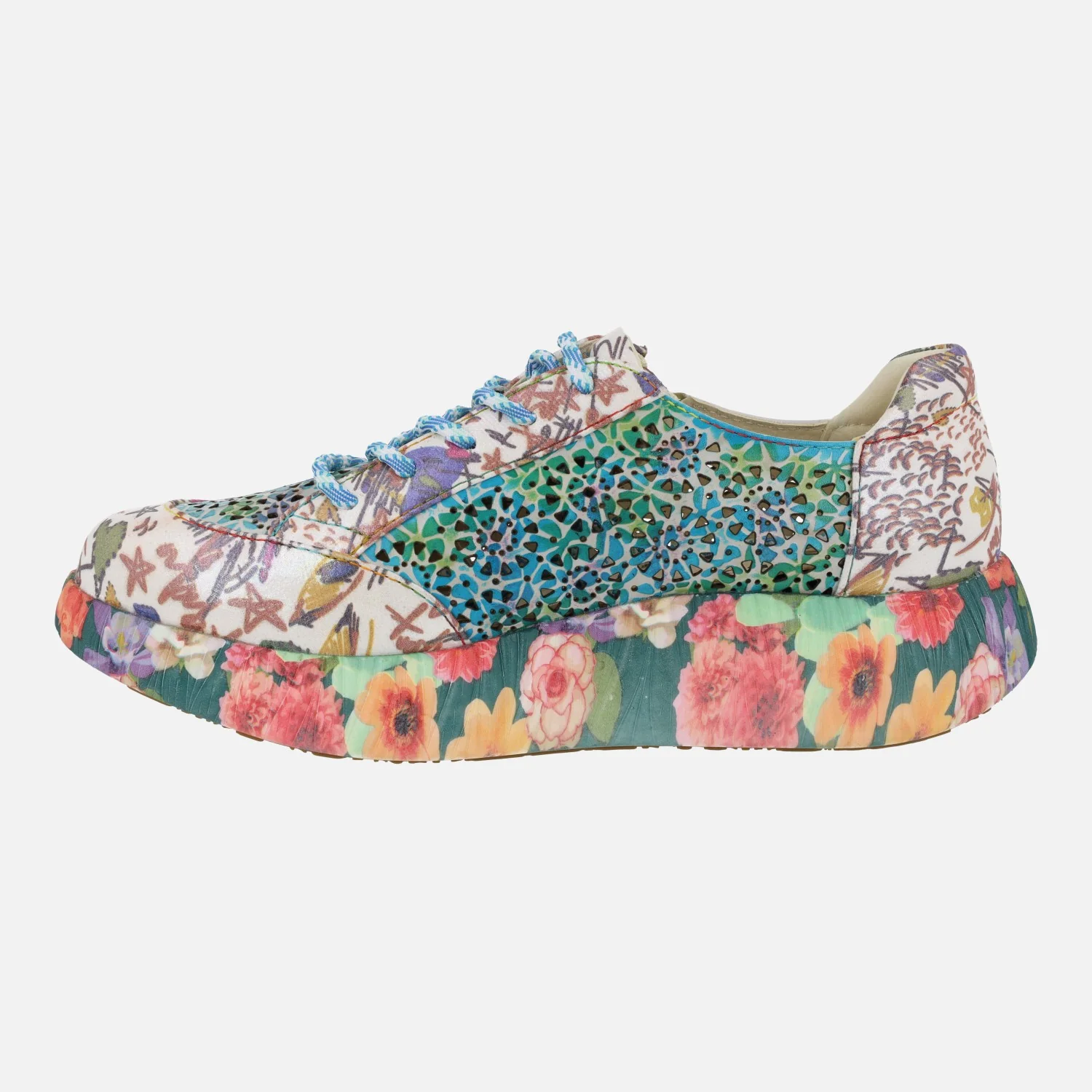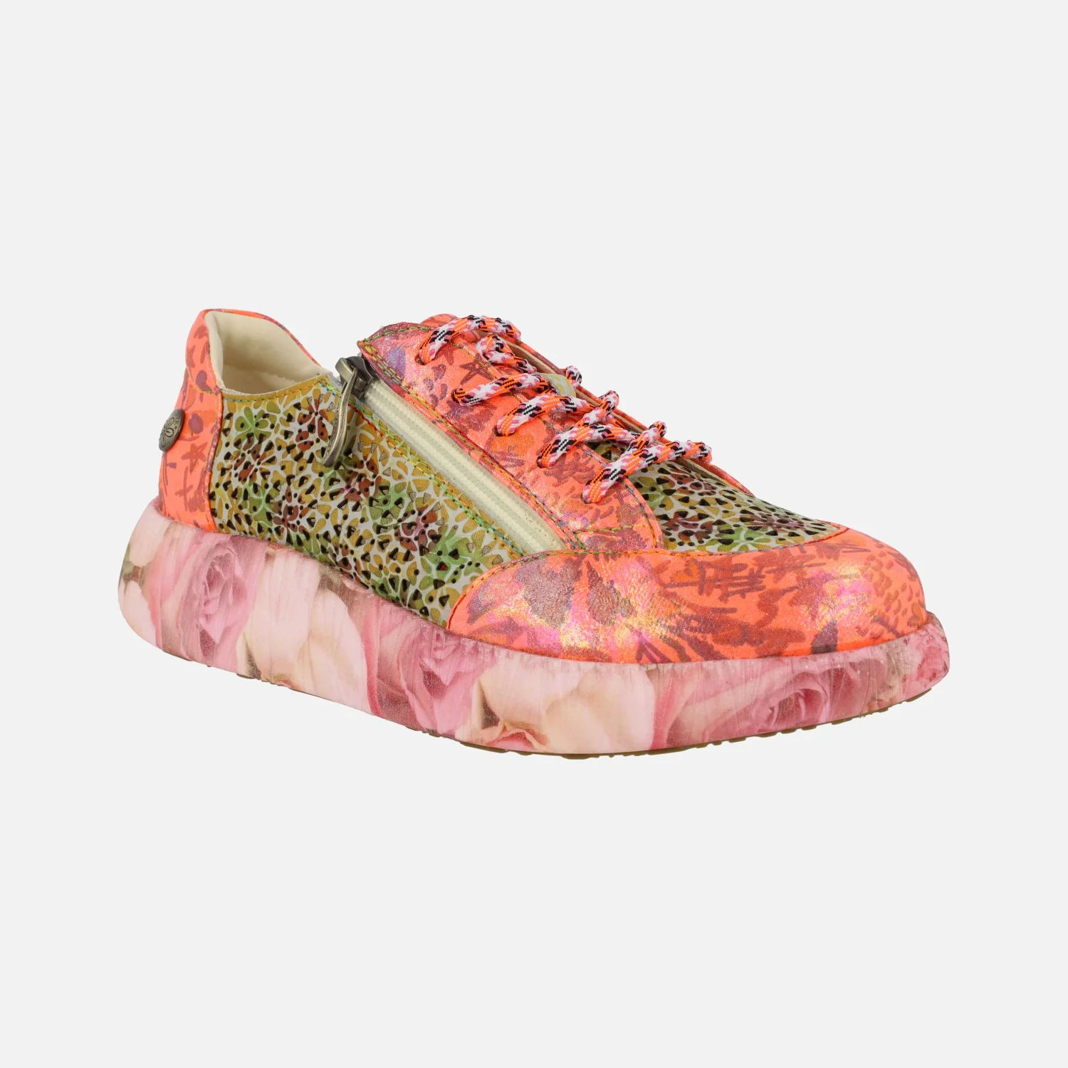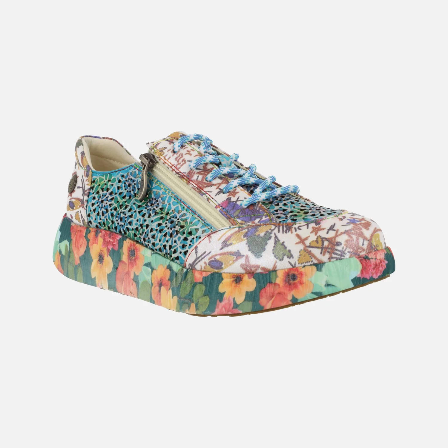 Preciosas deportivas Laura Vita modelo Nikito 57, disponibles en combinado Salmón (saumon) o turquesa (turquoise). Sneakers con cierre de cordones, elaboradas en combinado de piel y tejido, con cremallera lateral y motivos de flores. Forro y planta de piel. Plantillas extraíbles. Piso de goma, con motivos de flores, de aproximadamente 4 cms de altura en la parte trasera (2,5 cms parte delantera).