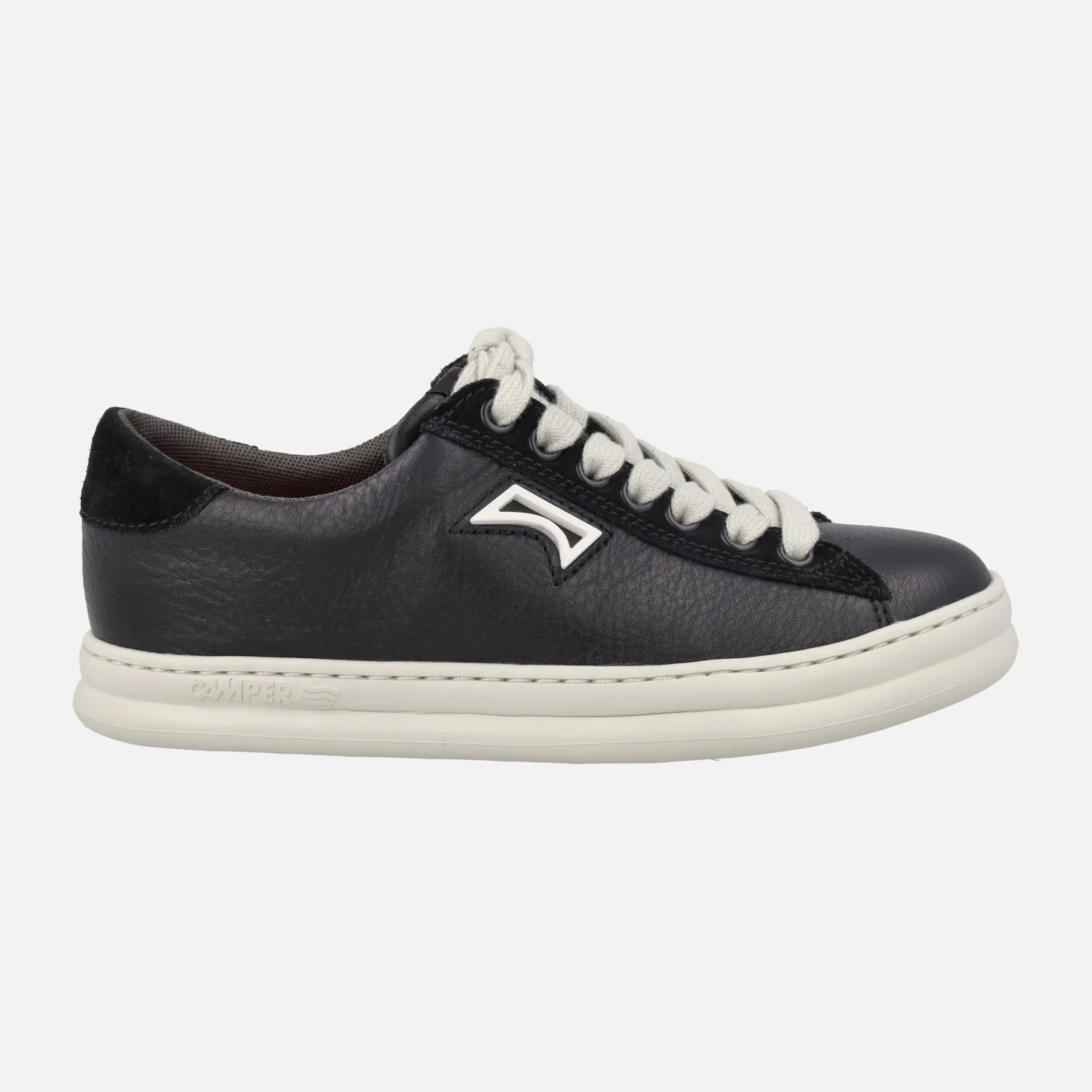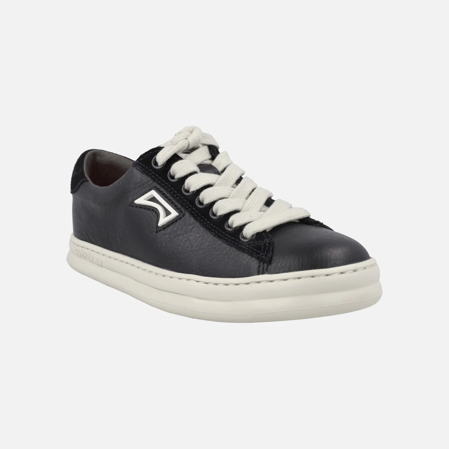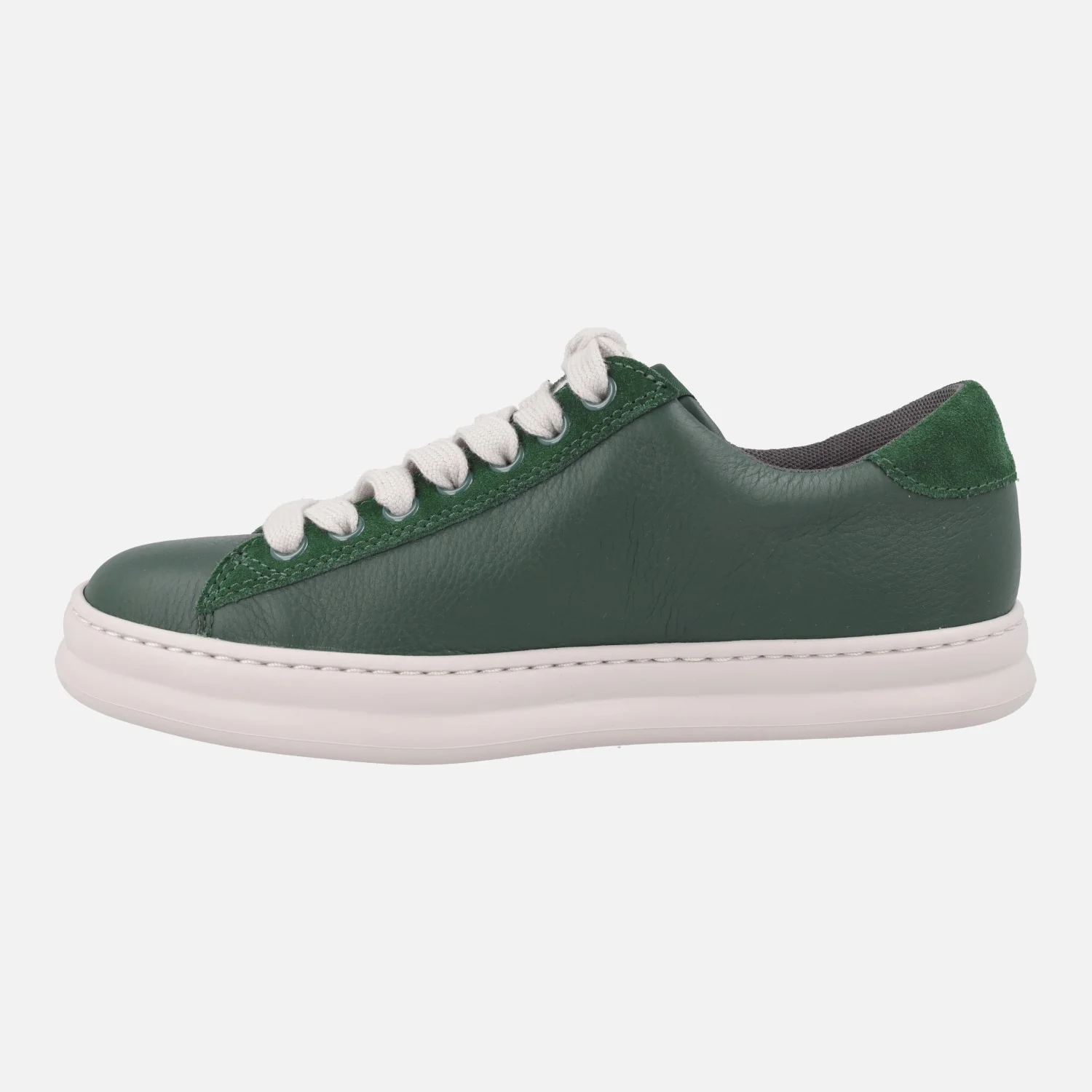 Zapatillas deportivas Camper Runner k201855, disponibles en verde (arume), blanco y en negro. Zapatillas deportivas estilo retro, elaboradas en piel y serraje. Cordones textiles. Interior textil con plantillas extraíbles. Piso de goma EVA Extralight. Las plantillas llevan una pequeña cuña de 3 cm, que junto al piso dan un total de 4,5 cm de altura.