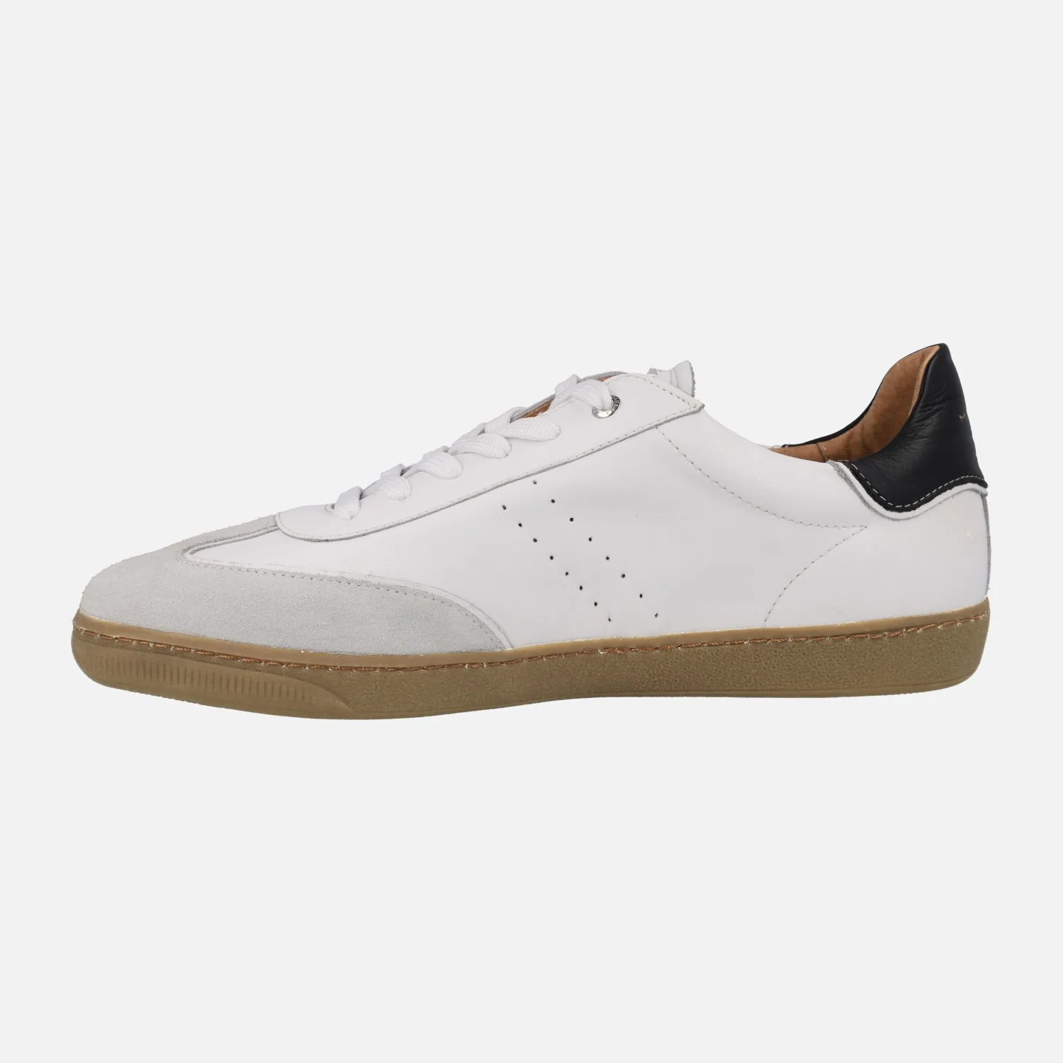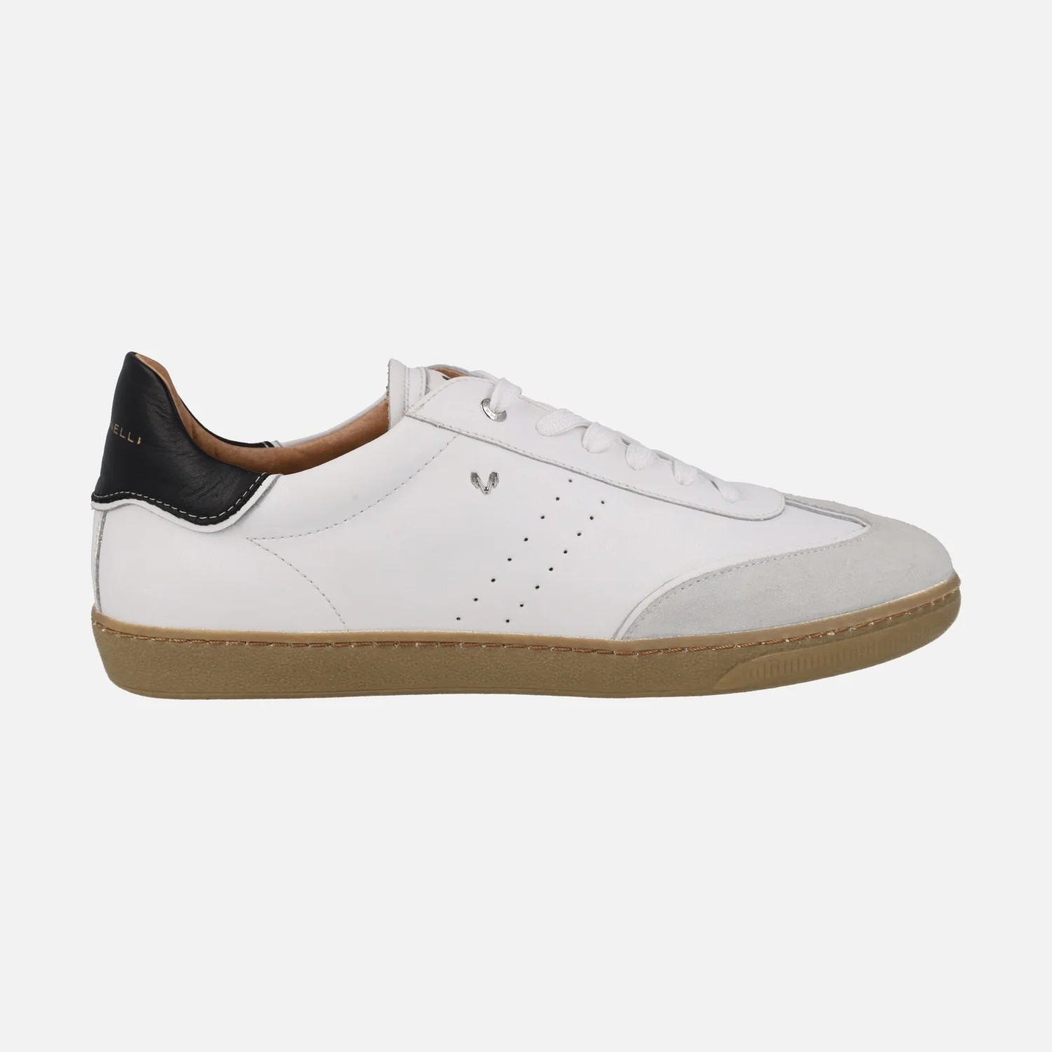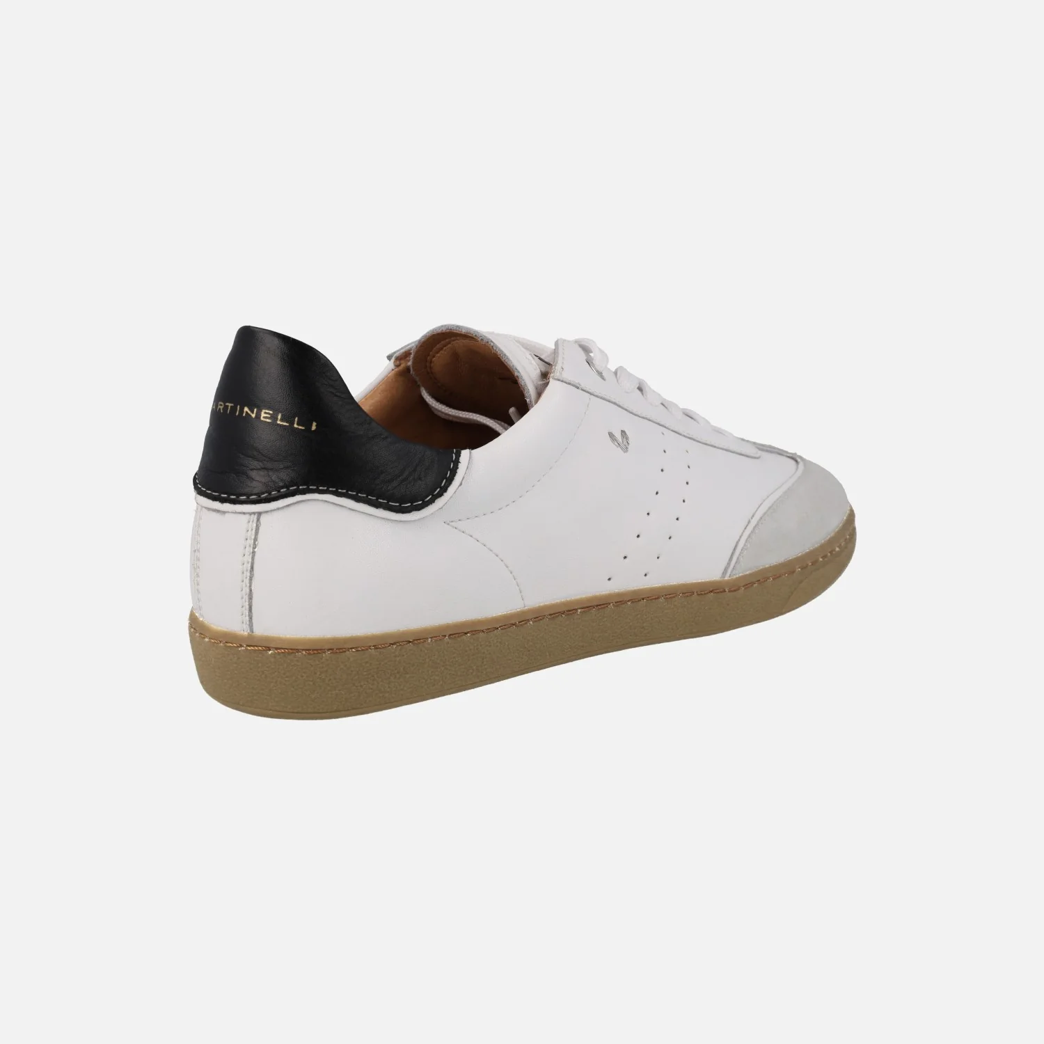 Nuevas zapatillas deportivas Martinelli modelo Vesey 1756-2960W1 Blanco. Deportivas blancas de piel con detalles de serraje gris en la puntera y de piel negra con logo Martinelli en el talón. Cierre de cordones textiles. Interior mixto de piel y tejido. Piso de goma color caramelo.