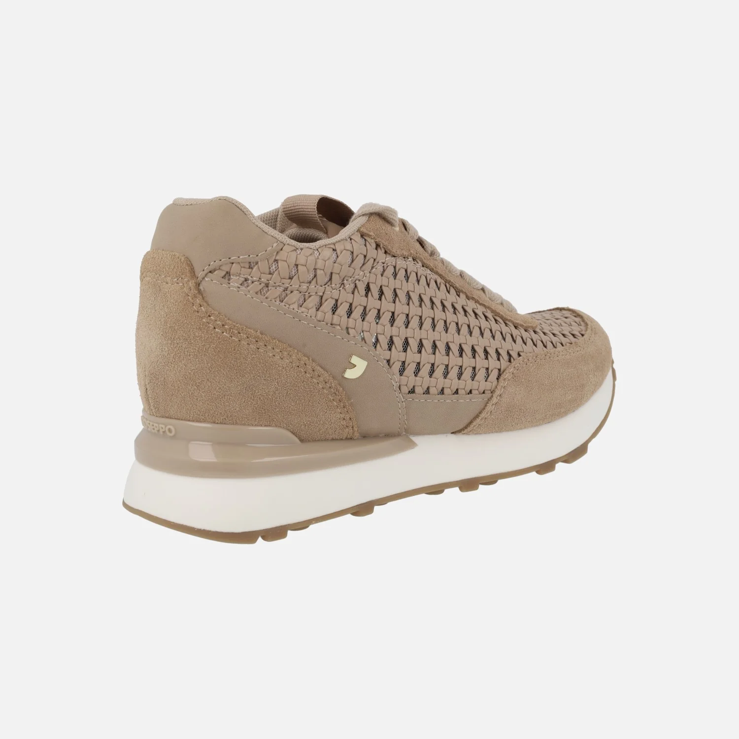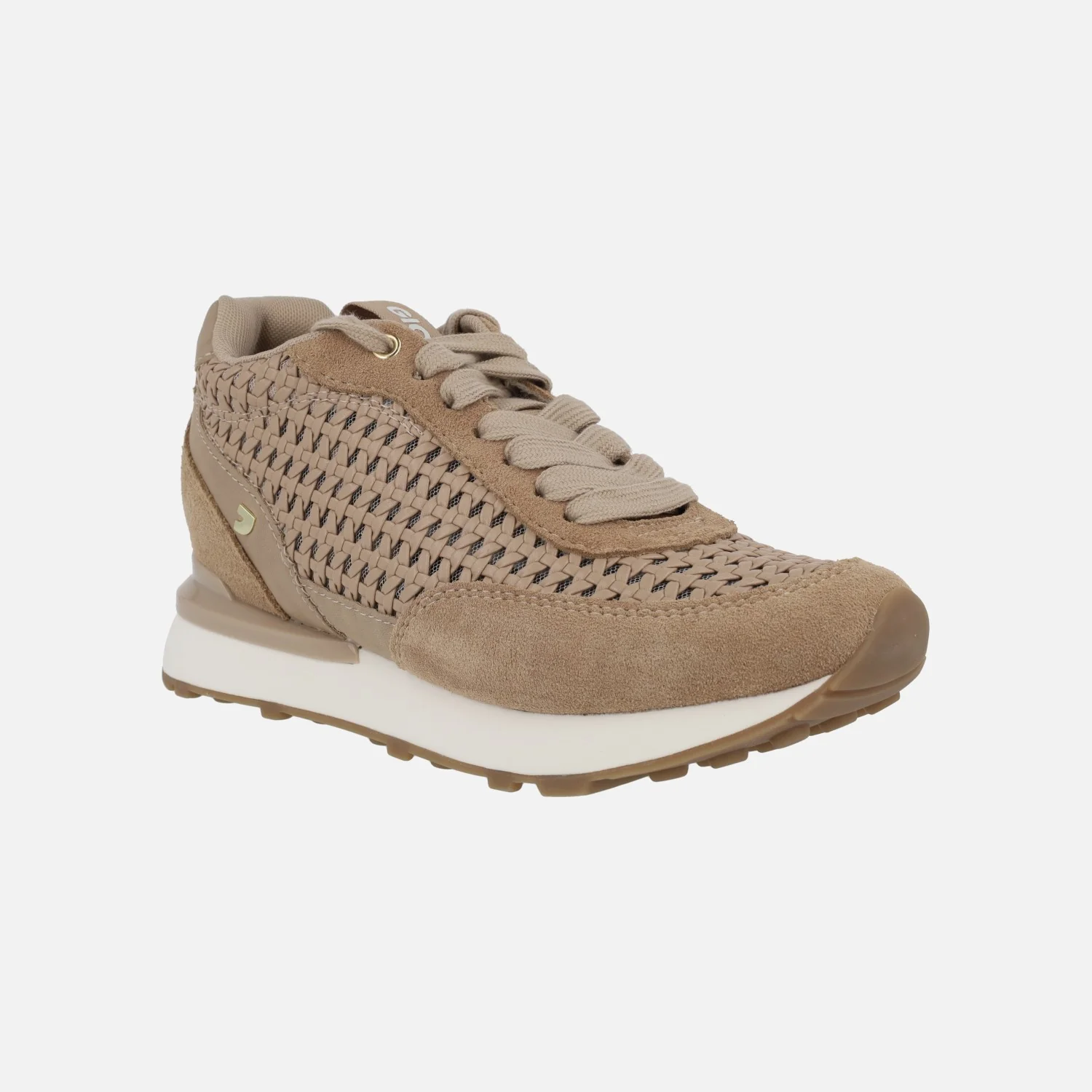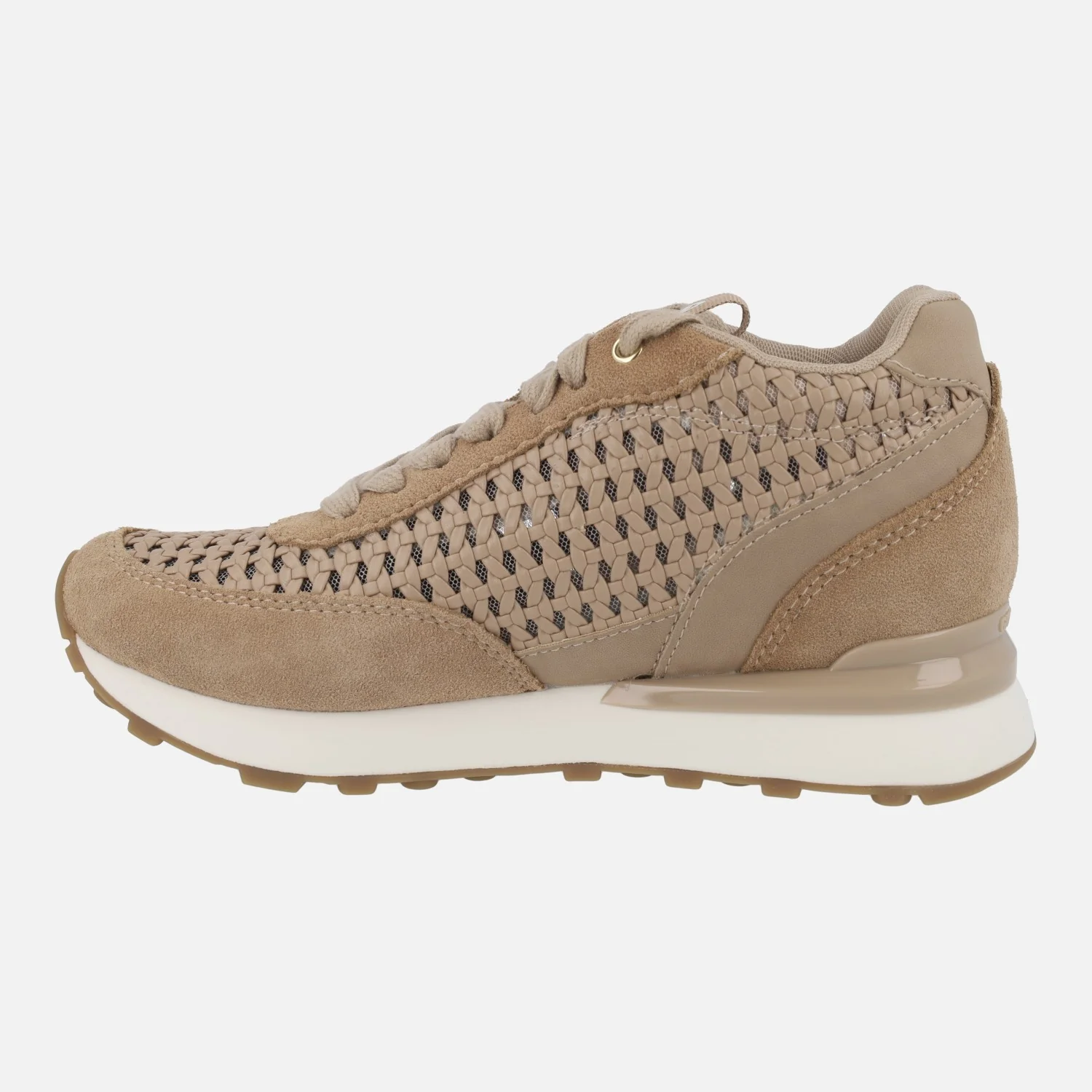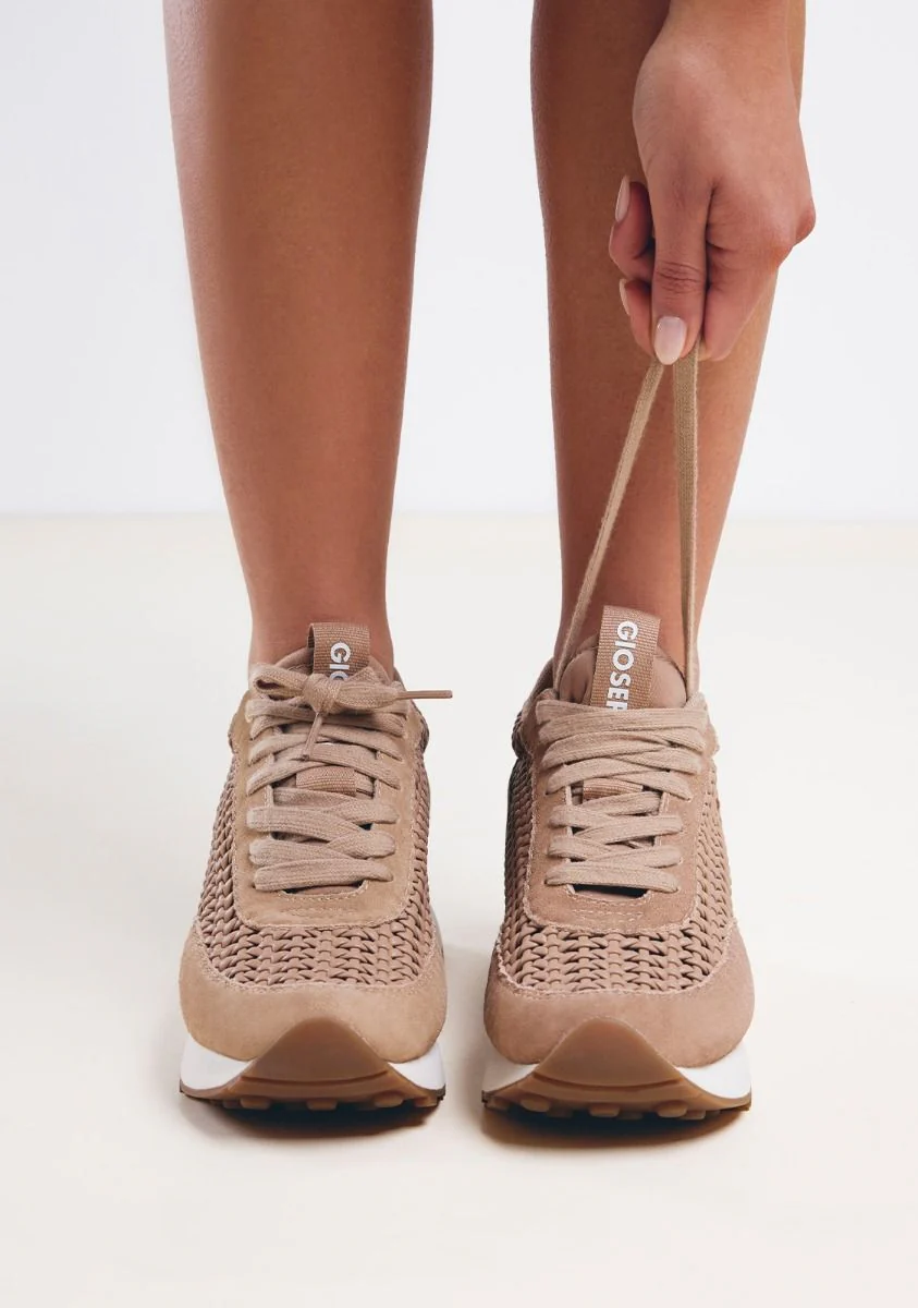 Zapatillas deportivas para mujer Gioseppo modelo Highgate 74064 Beige. Sneakers elaboradas en piel y poliuretano, con laterales efecto trenzado. Cierre de cordones. Interior con forro textil de poliéster y planta de poliuretano. Cuña interior de 3 cms de altura. Piso de goma. Altura total de cuña y piso 6 cms (2 cms en la parte delantera).