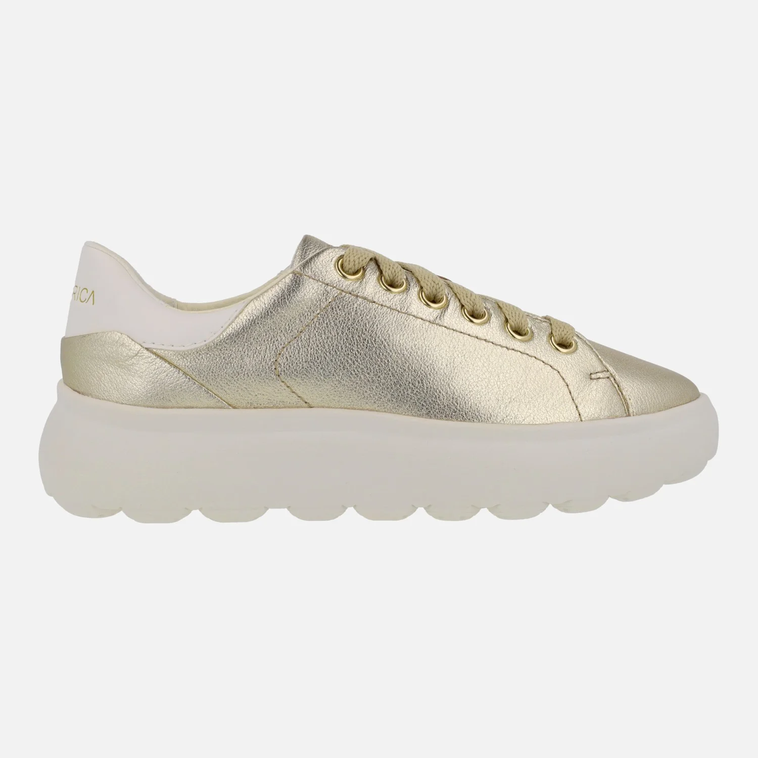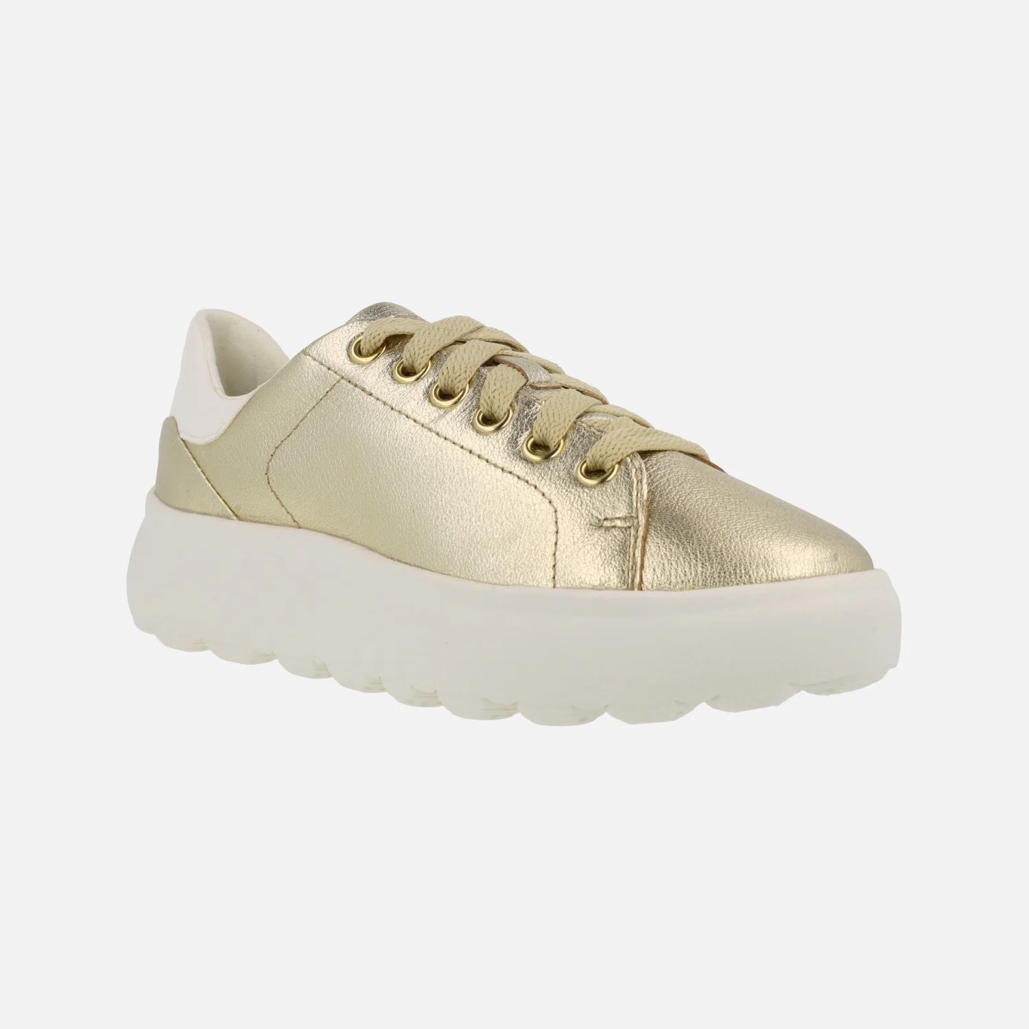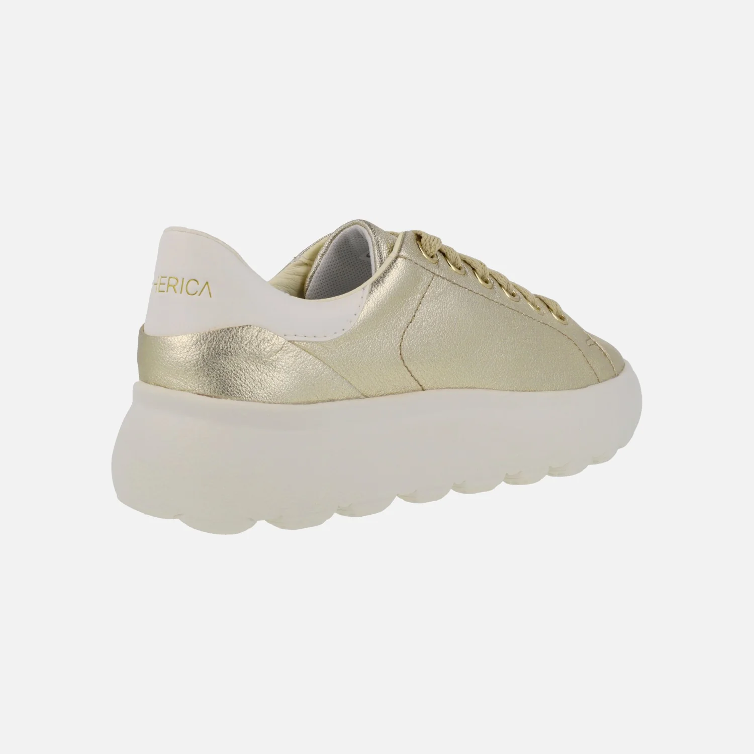 Zapatillas deportivas blancas de piel para mujer de la marca italiana Geox modelo D45TCC Gold/Optic white Spherica EC4.1. Zapatillas de piel metalizada dorada, con cierre de cordones y talonera contrastada en piel blanca. Interior textil, con plantillas extraíbles. Piso de goma con tecnología de micro esferas Spherica, de gran amortiguación. Altura trasera 4,5 cms (3 cms en la parte delantera).