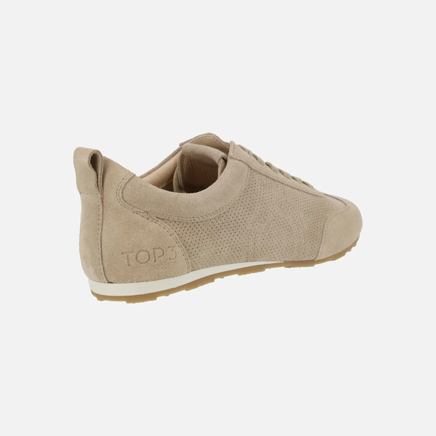 Zapatillas deportivas nueva colección de TOP3 modelo SE1500 Arena. Zapatillas elaboradas en serraje beige con detalle de calados. Cierre de cordones textiles. Interiores en piel. Plantillas de piel extraíbles. Suela sintética de 1 cm de altura trasera.