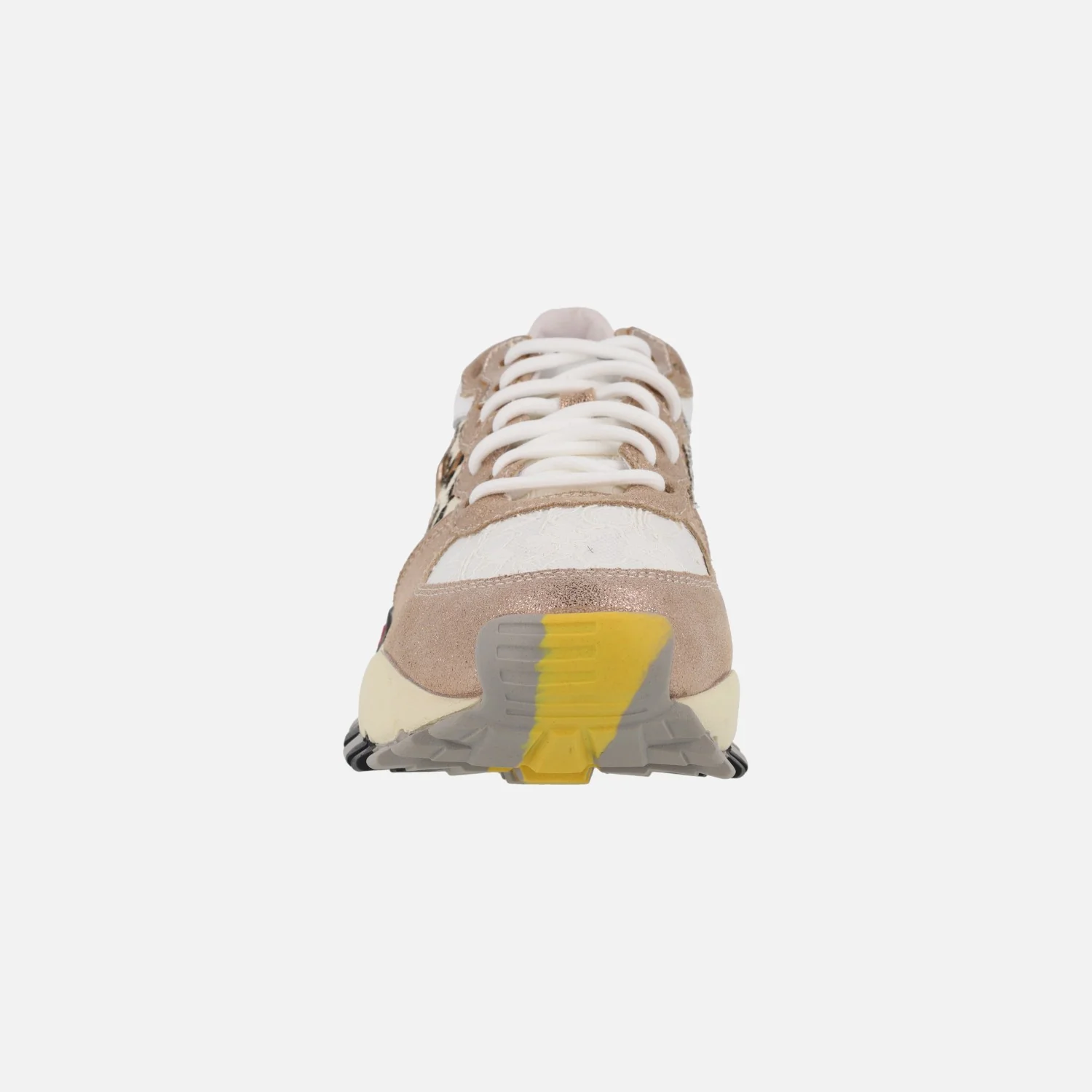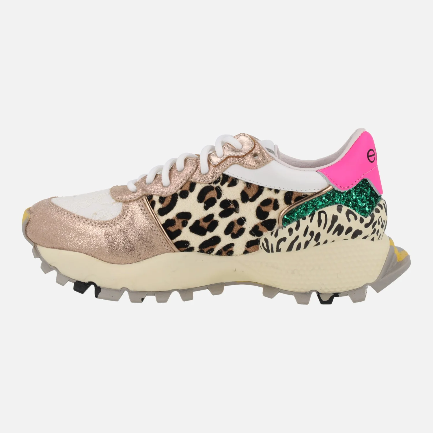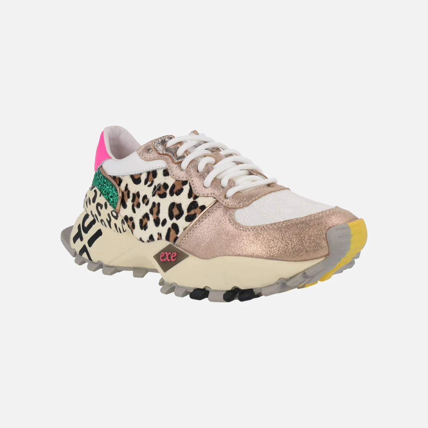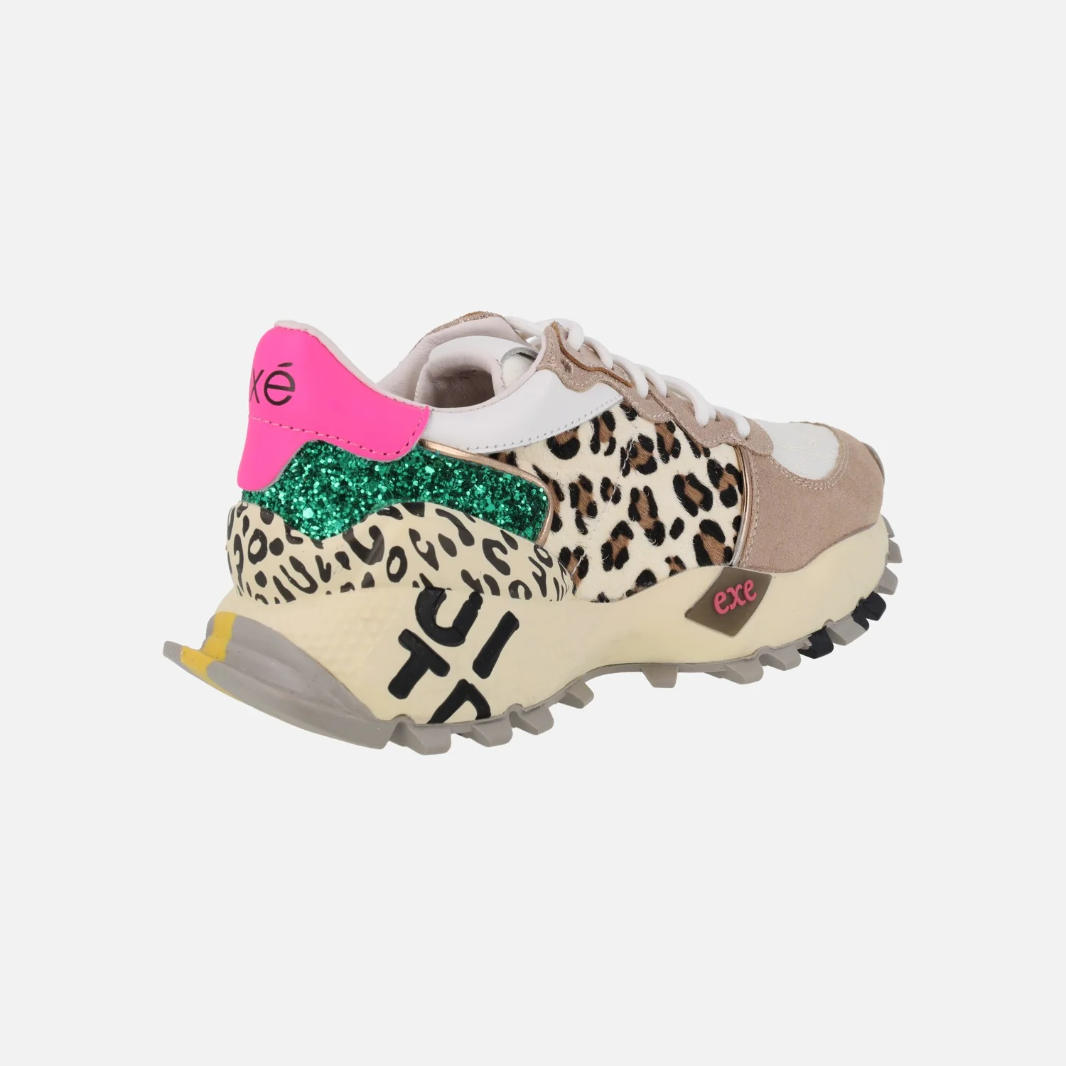 Preciosas zapatillas deportivas modelo 134-350 Leopardo champagne, de la marca EXÉ. Zapatillas de cordones, elaboradas en piel y tejido, con detalles de animal print y glitter. Interiores forrados de piel, con plantillas extraíbles. Piso sintético de 6 cms de altura trasera (3 cms plataforma delantera).