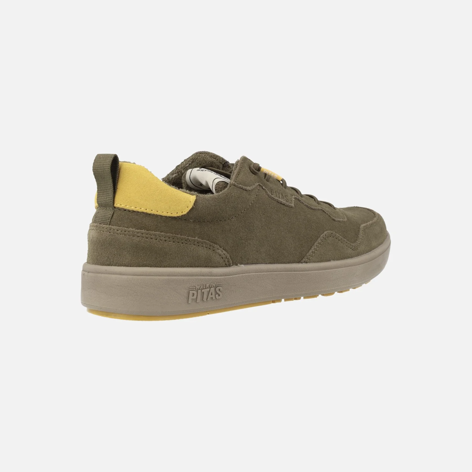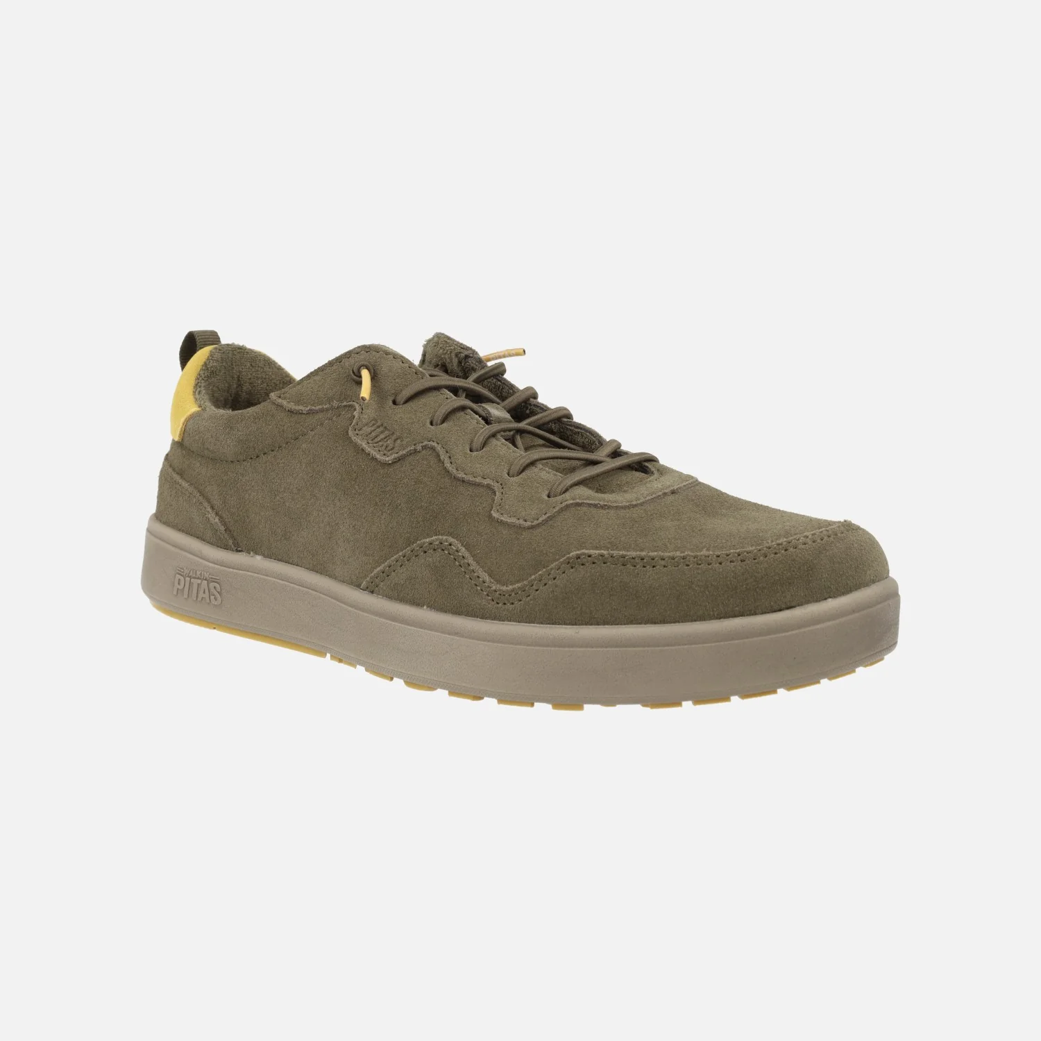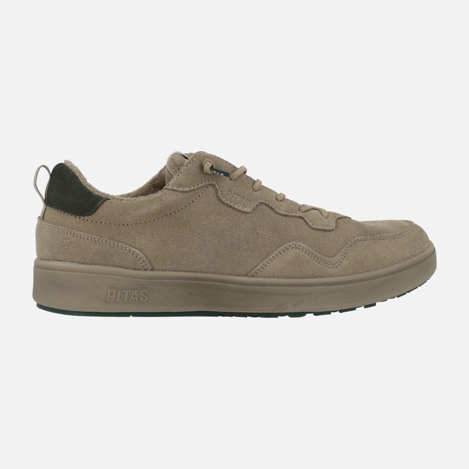 Zapatillas deportivas para hombre de la marca Walk in Pitas, modelo Kume, disponibles en combinado kaki y en combinado beige. Sneakers elaboradas en piel serraje hidrofugado, para una ligera resistencia a la lluvia. Forro textil, con plantillas extraíbles forradas de piel. Piso de goma EVA Ultralight, muy ligero. Cordones elásticos y detalle de tirador en la parte trasera.