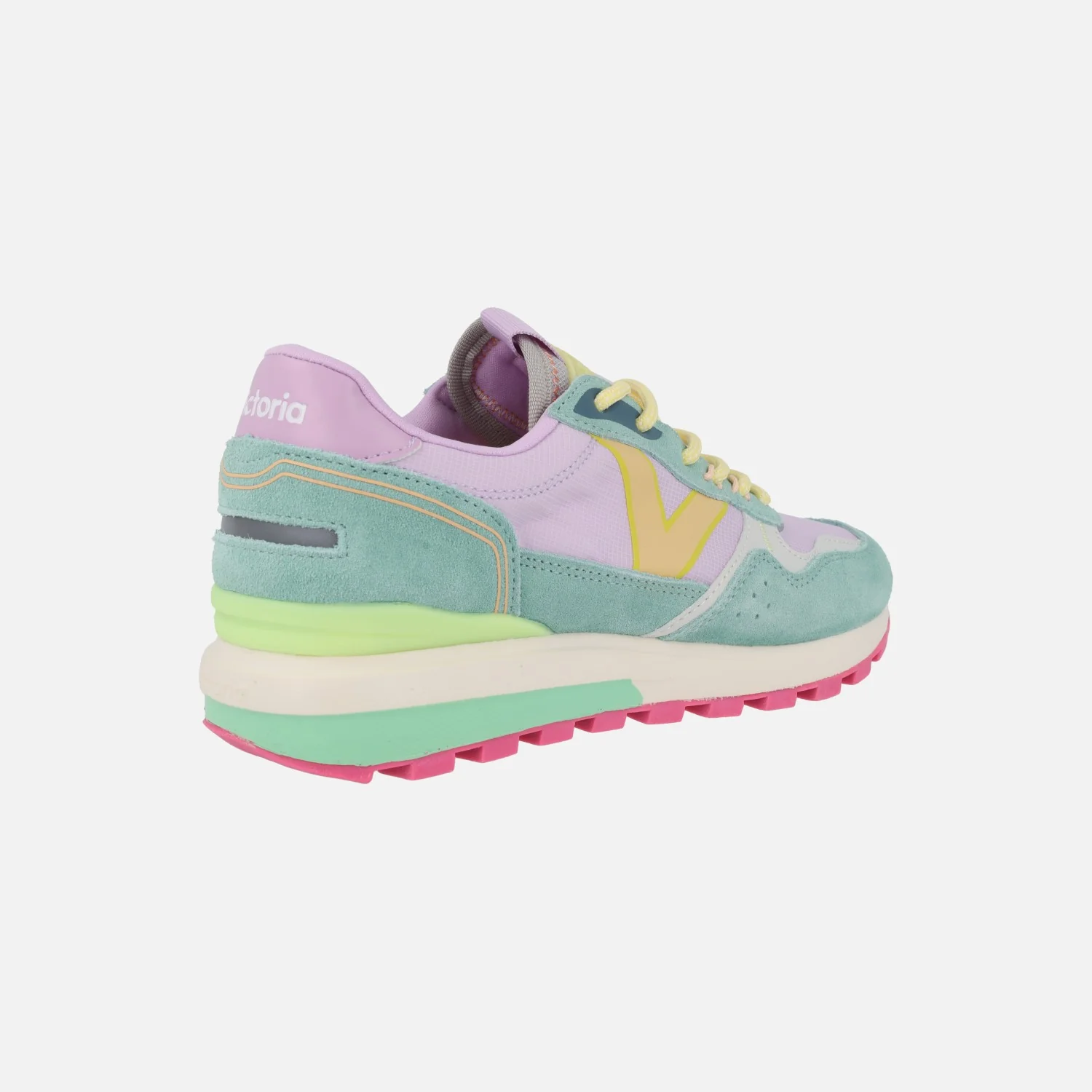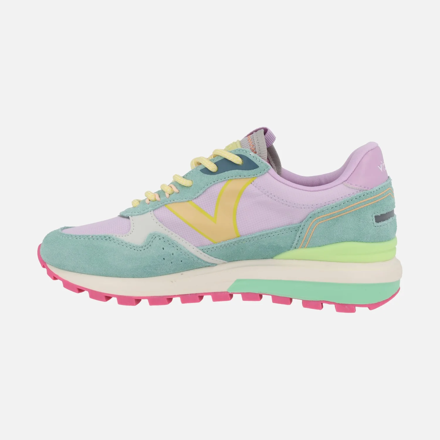 Zapatillas deportivas de la marca Victoria, modelo 1156115 Luna multicolor nylon técnico y serraje en combinado lila. Deportivas elaboradas en tejido poliéster, piel y detalles en sintéticos. Cierre de cordones textiles. Interior textil, plantillas acolchadas extraíbles. Suela ligera, sintética, de aproximadamente 3,2 cm de altura trasera (2 cm parte delantera).