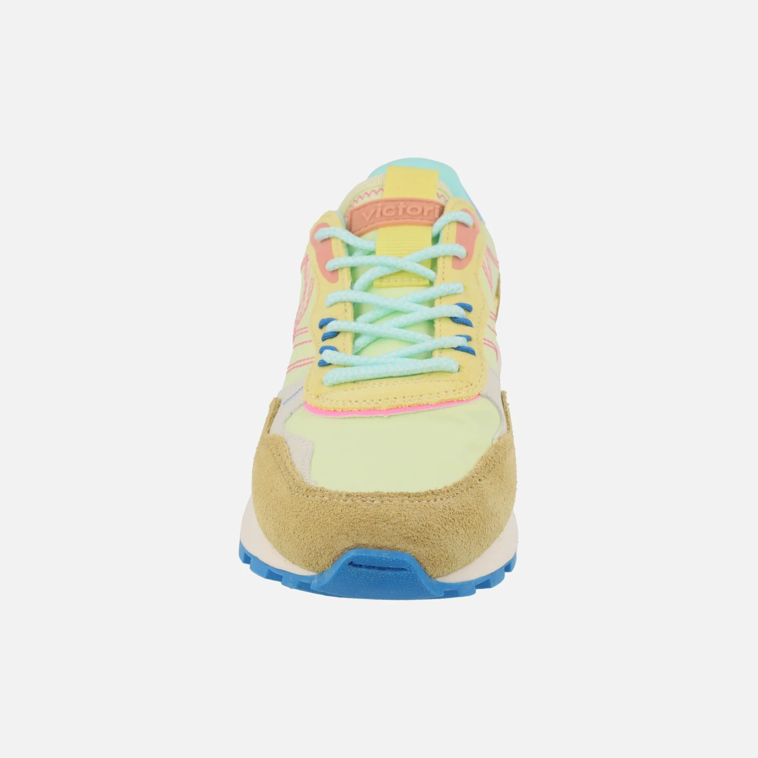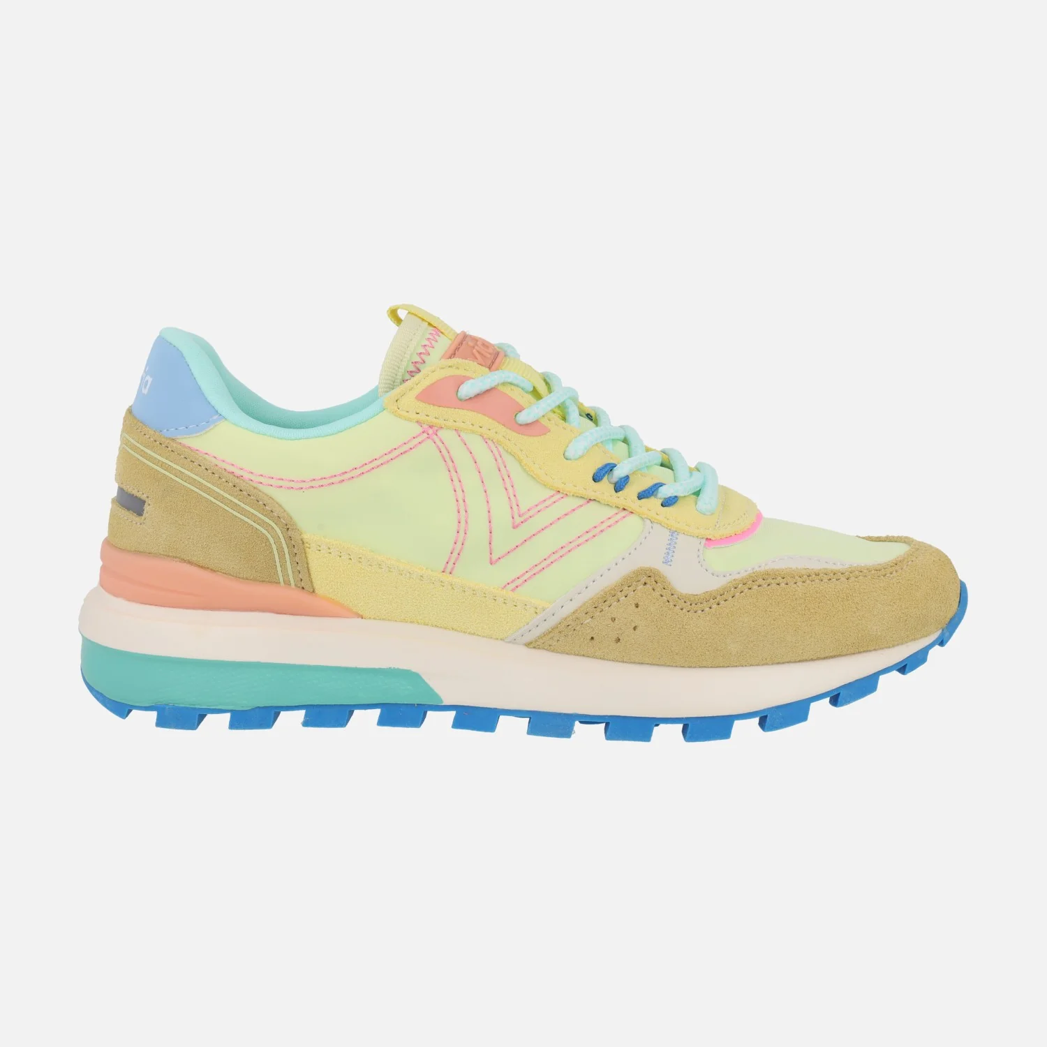 Zapatillas deportivas de la marca Victoria, modelo 1156114 Luna multicolor nylon y serraje en combinado amarillo. Deportivas elaboradas en tejido poliéster, piel y detalles en sintéticos. Cierre de cordones textiles. Interior textil, plantillas acolchadas extraíbles. Suela ligera, sintética, de aproximadamente 3,2 cm de altura trasera (2 cm parte delantera).