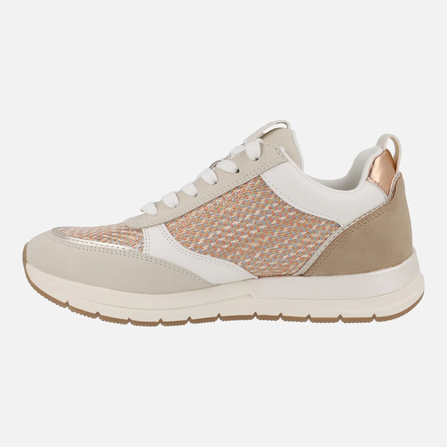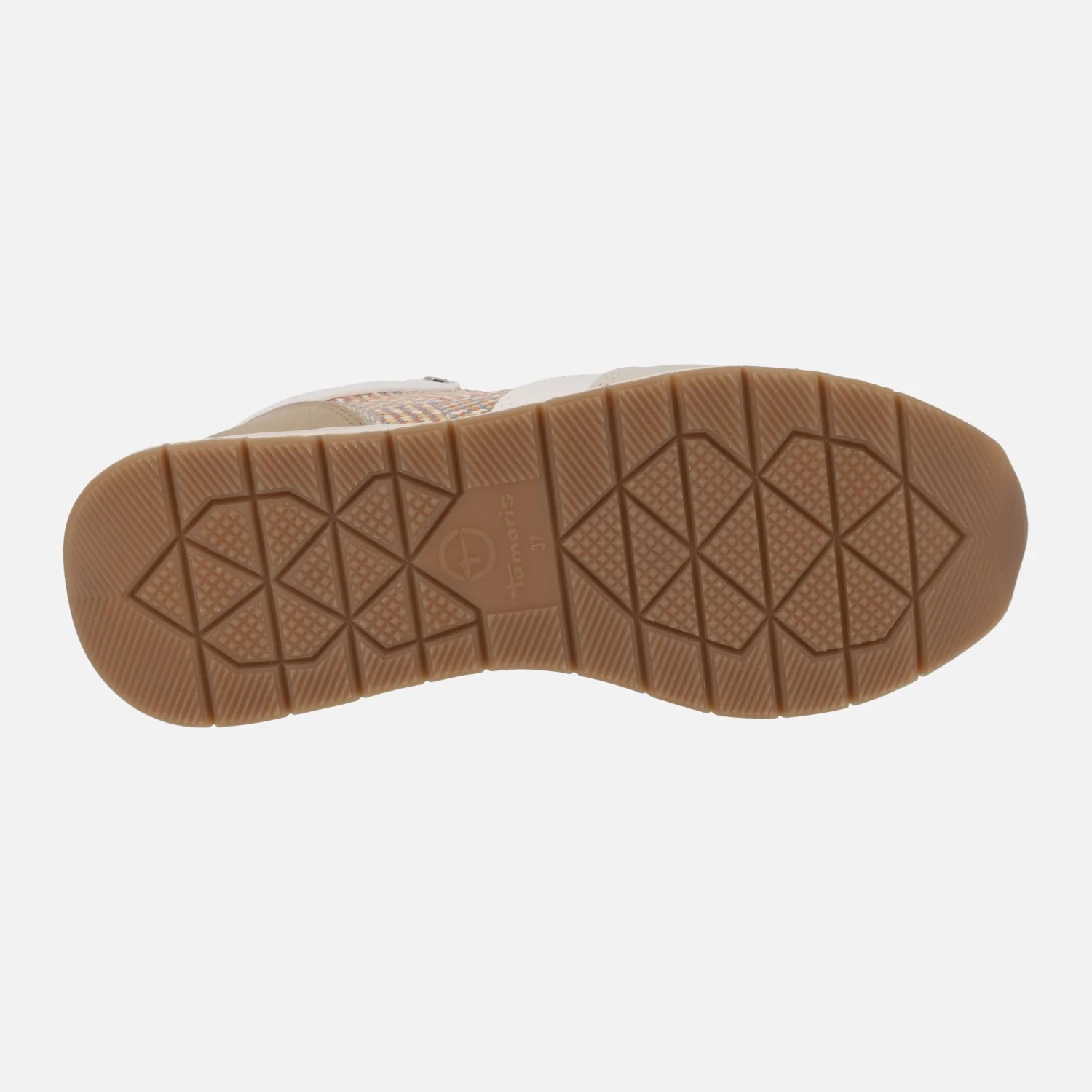 Zapatos deportivos para mujer de la marca Tamaris, modelo 1-23732-41 Ivory. Sneakers elaboradas en tejido combinado con sintéticos, combinando taupe y beige con tejido rafia de colores. Detalle en metalizado bronce en la parte del talón. Cierre de cordones textiles y cremallera en el lateral exterior. Plantillas extraíbles en tejido. Forro mixto de tejido y sintéticos. Piso de goma con casi 3,5 cms de altura trasera (2 cms parte delantera).