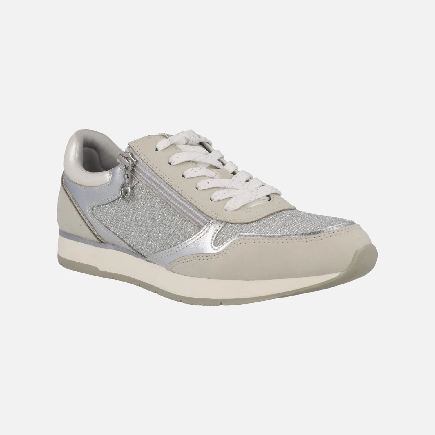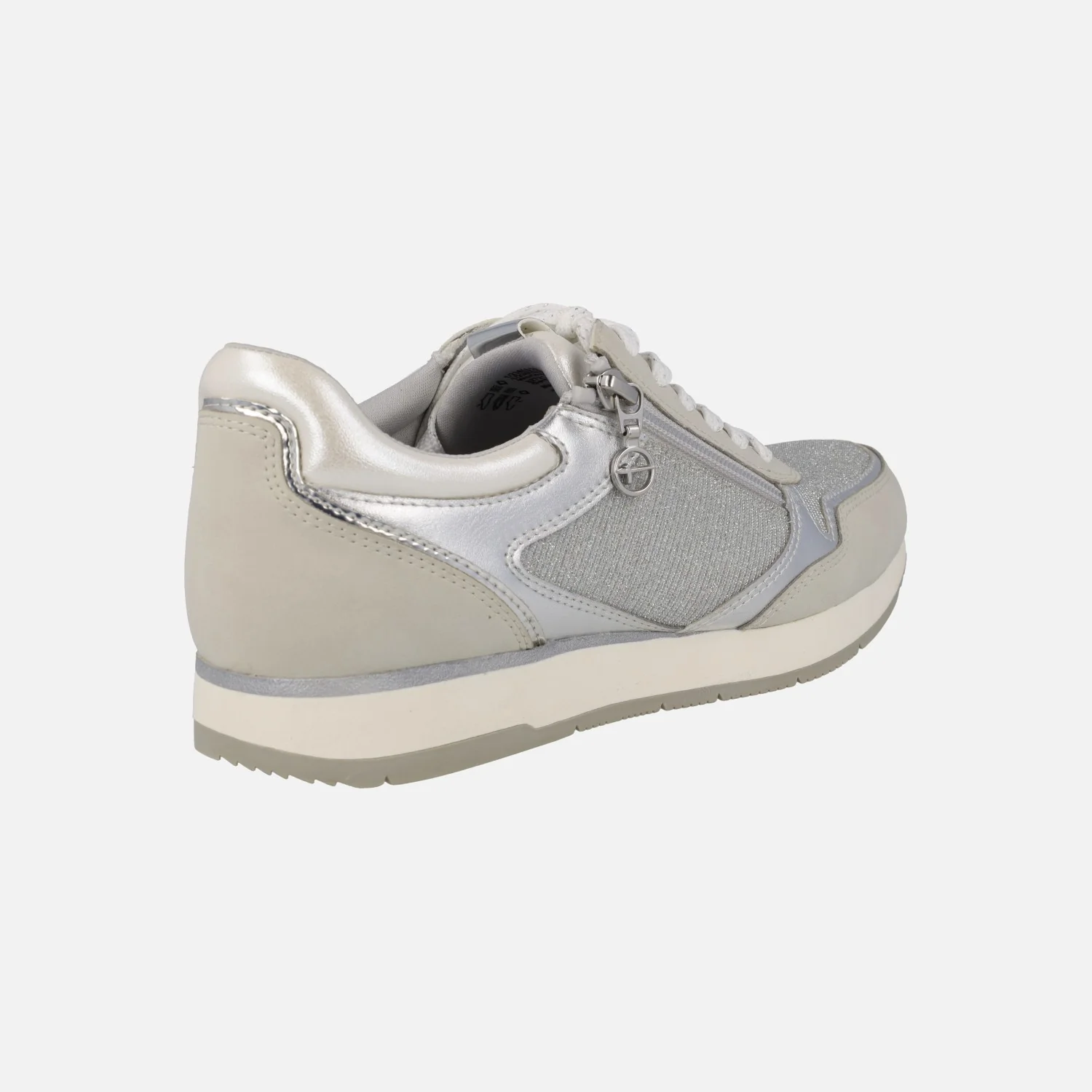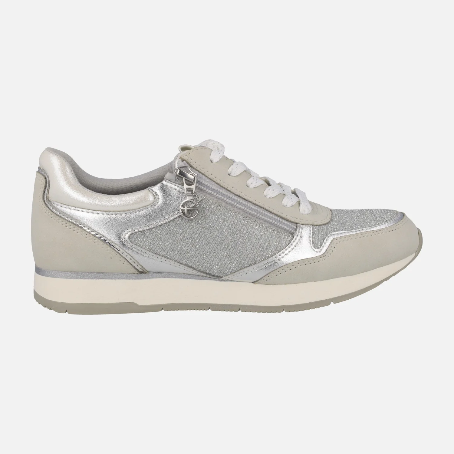 Zapatillas deportivas multimaterial de la marca Tamaris modelo 1-23603 grey. Zapatillas de cordones, con cremallera en el lateral exterior. Interior textil. Exterior combinado en tejido y sintéticos, en tonos grises y plateados. Piso de goma. Altura trasera 2,5 cms.
