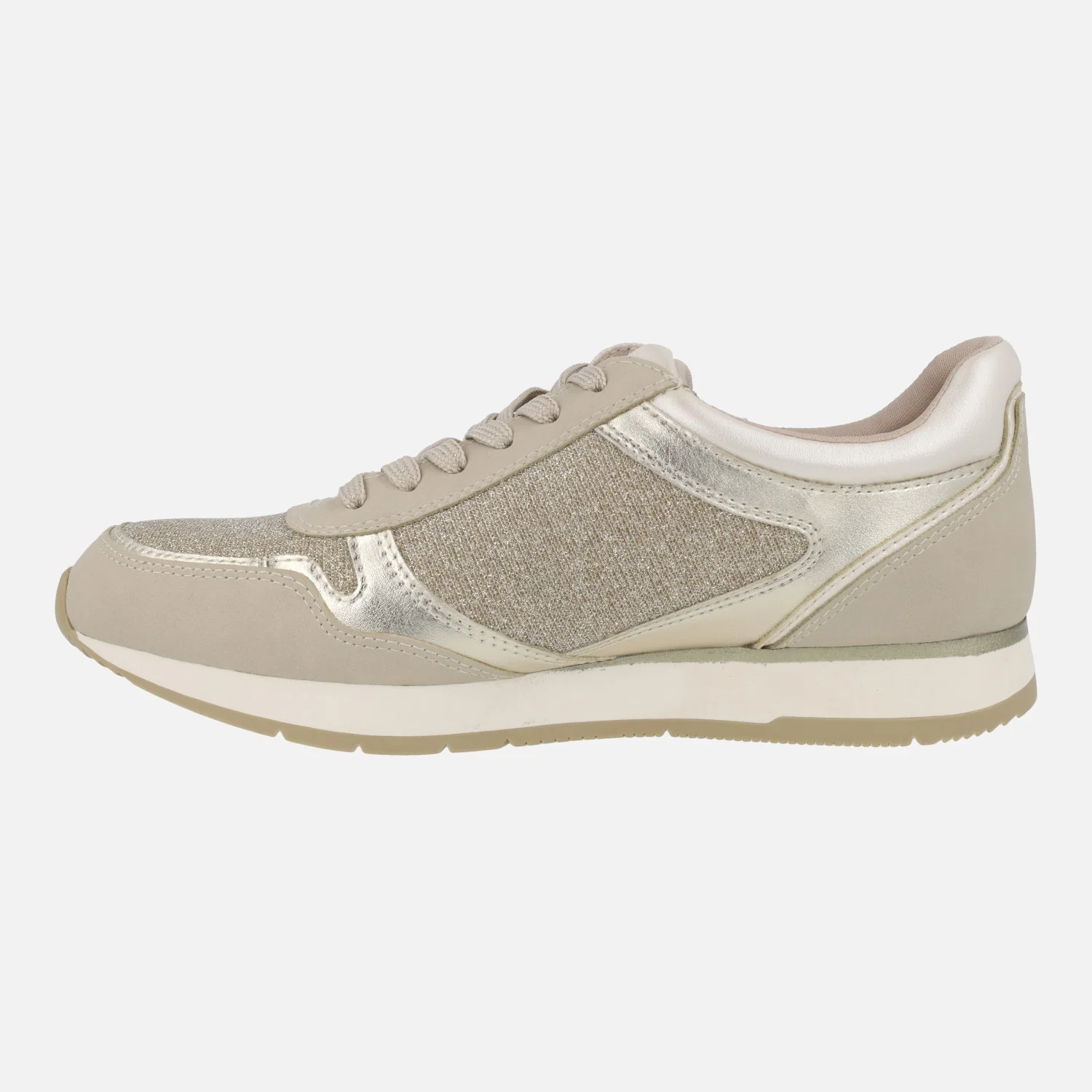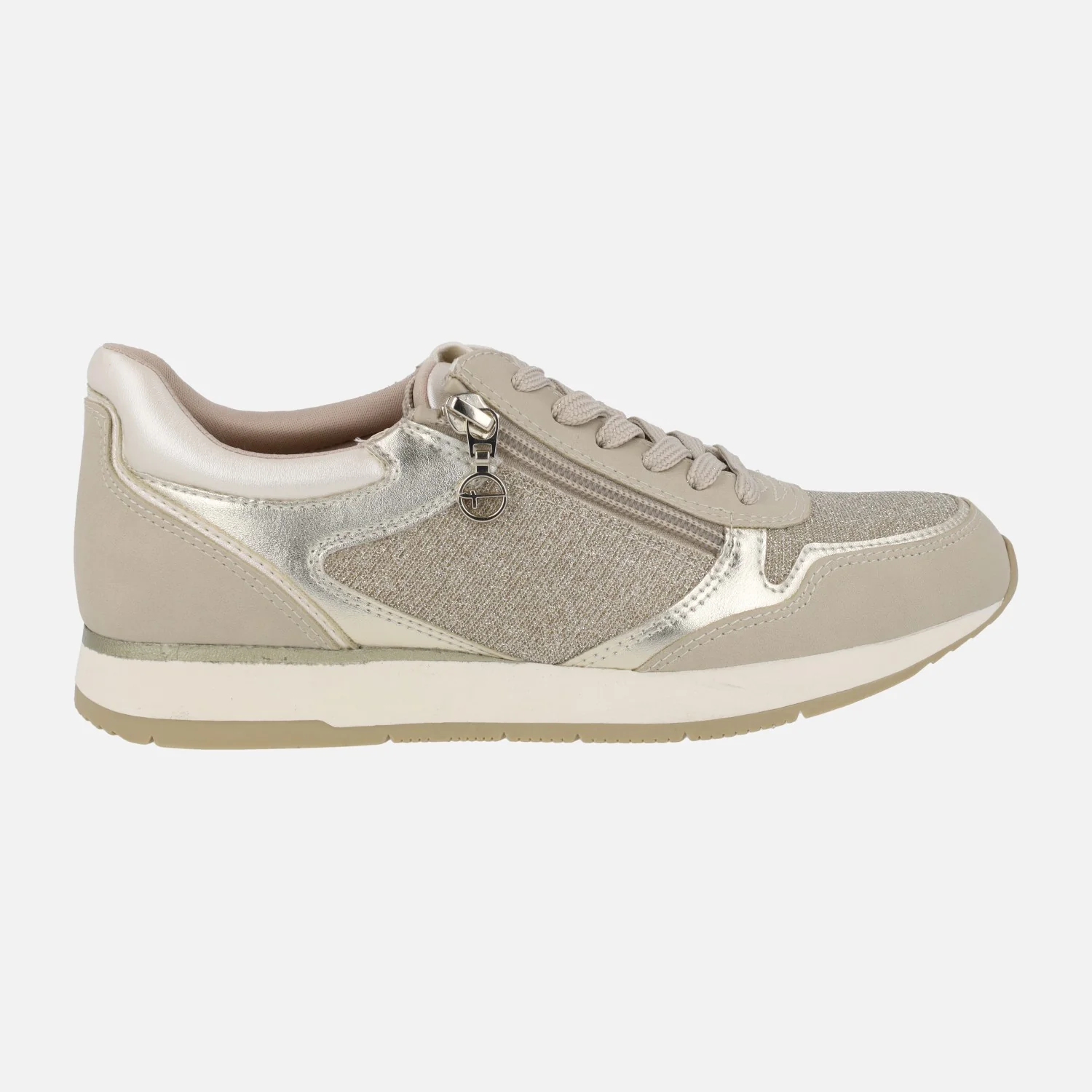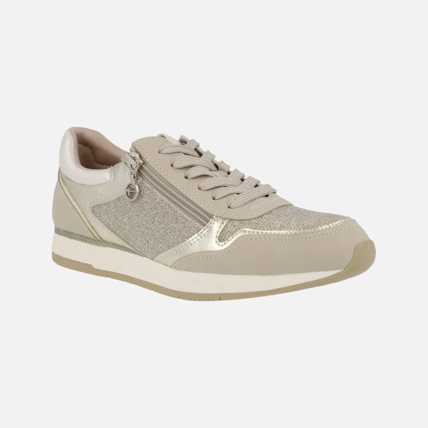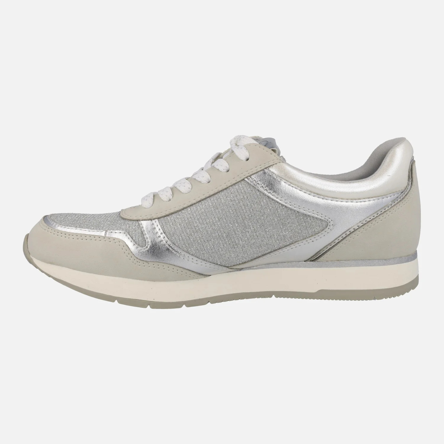Zapatillas deportivas multimaterial de la marca Tamaris modelo 1-23603 grey. Zapatillas de cordones, con cremallera en el lateral exterior. Interior textil. Exterior combinado en tejido y sintéticos, en tonos grises y plateados. Piso de goma. Altura trasera 2,5 cms.