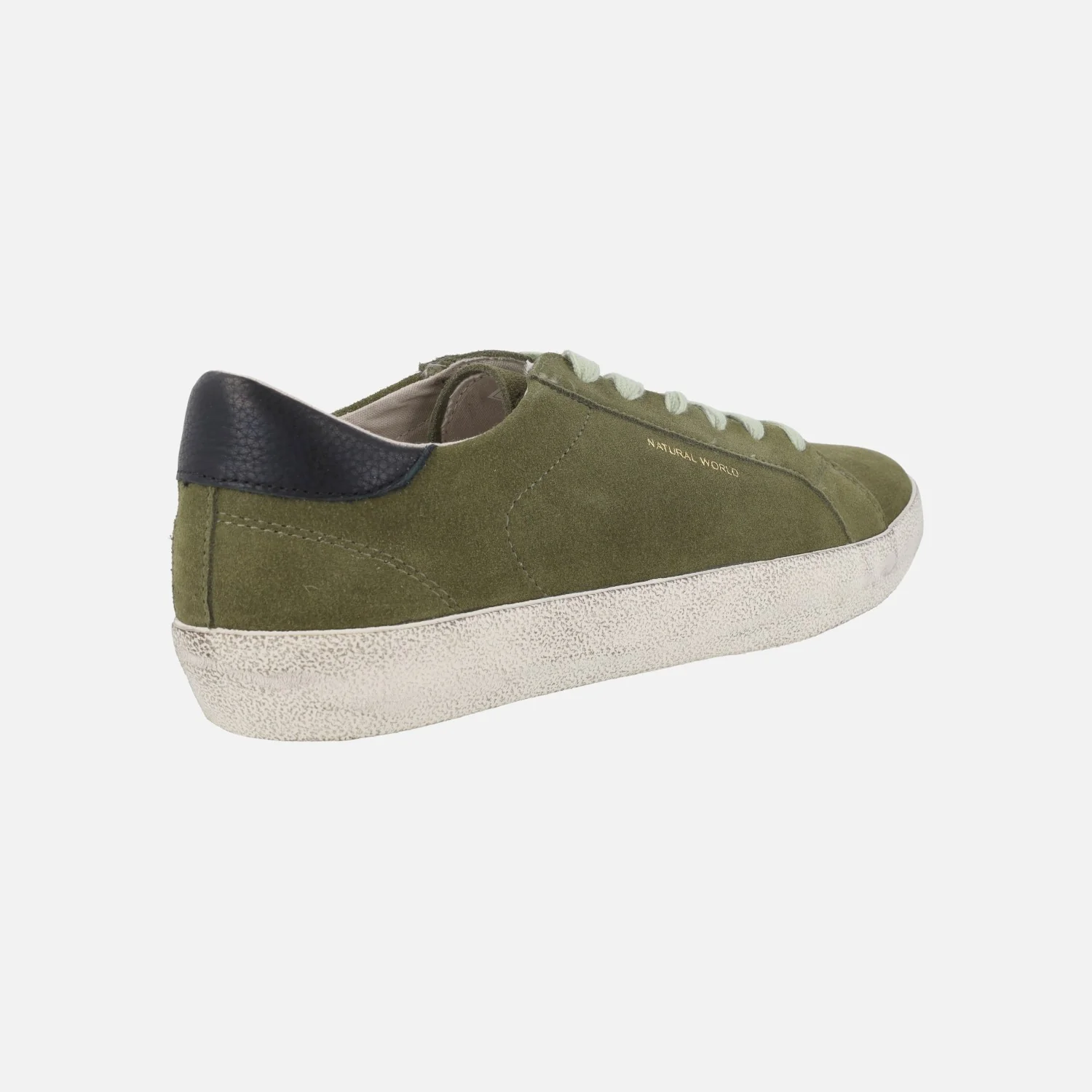 Zapatillas deportivas para hombre Natural World Cody 9030, disponibles en verde kaki. Deportivas elaboradas en piel serraje, con cierre de cordones textiles. Color verde kaki, con talonera en azul. Interior textil con plantillas extraíbles. Piso de caucho reciclado.