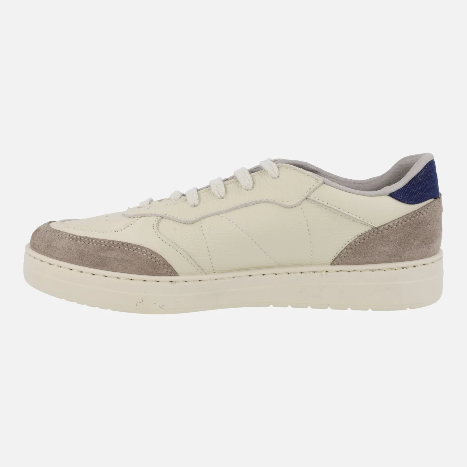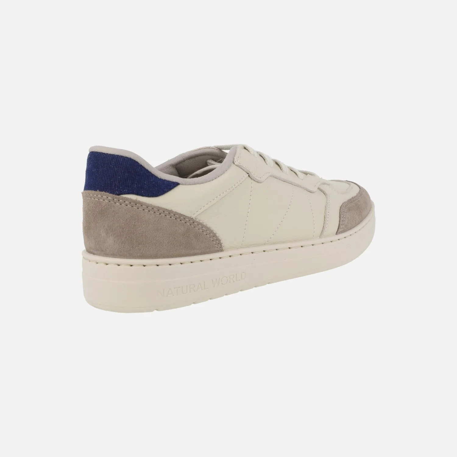 Zapatillas deportivas para hombre de la marca Natural World modelo Esla 6738 crudo. Sneakers con cierre de cordones textiles, elaboradas en piel beige (crudo) con detalles en serraje taupe y tejido azul. Interior textil con plantillas extraíbles. Piso de caucho reciclado.