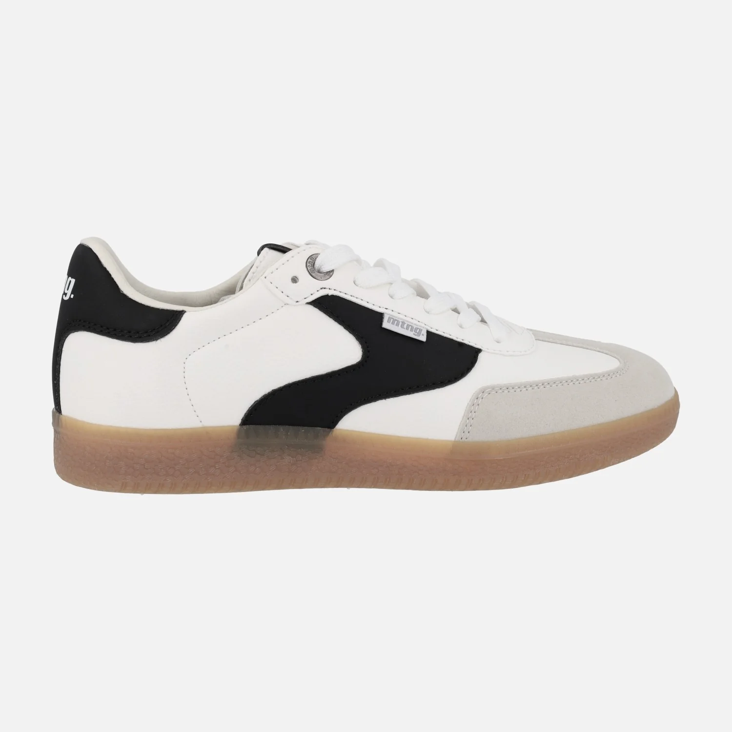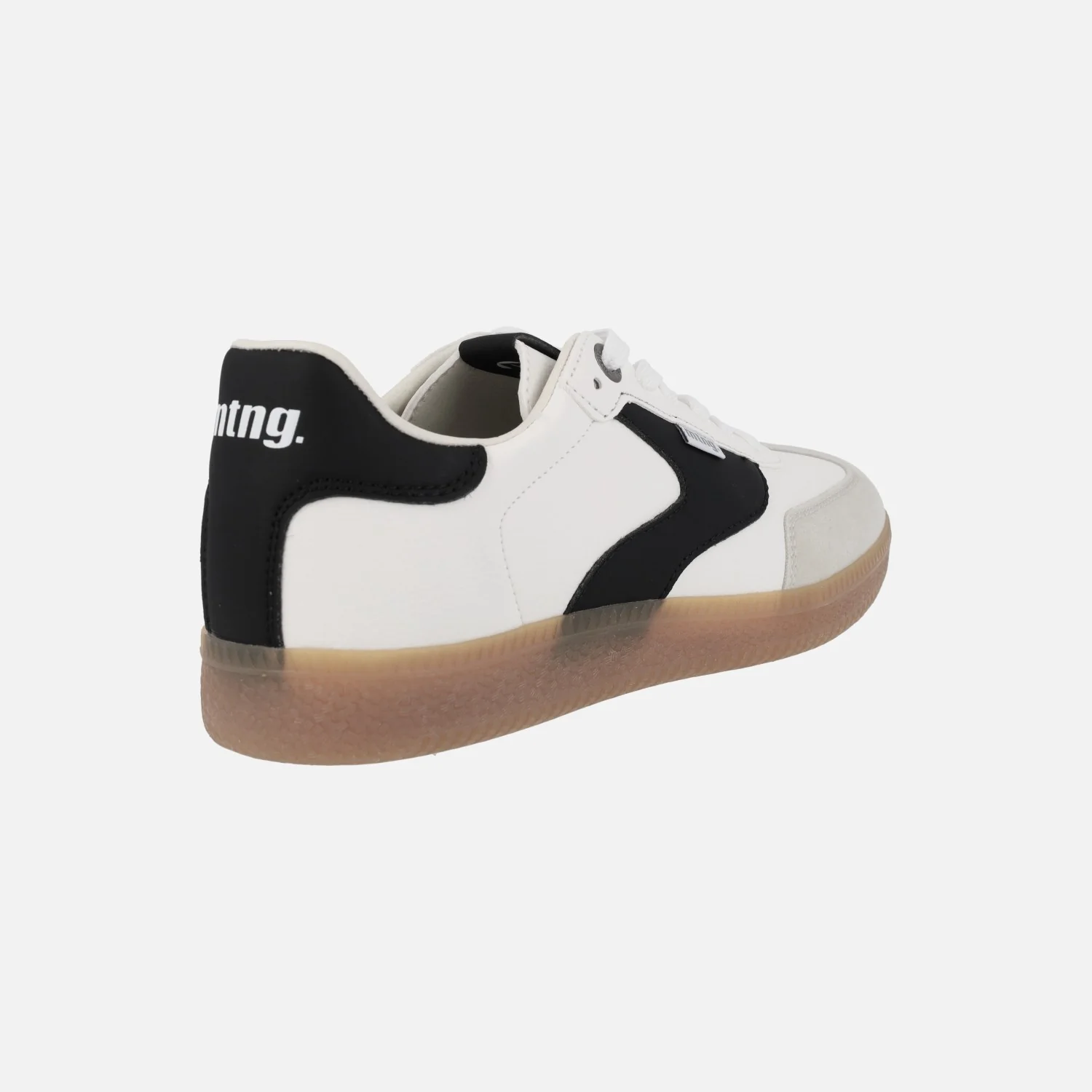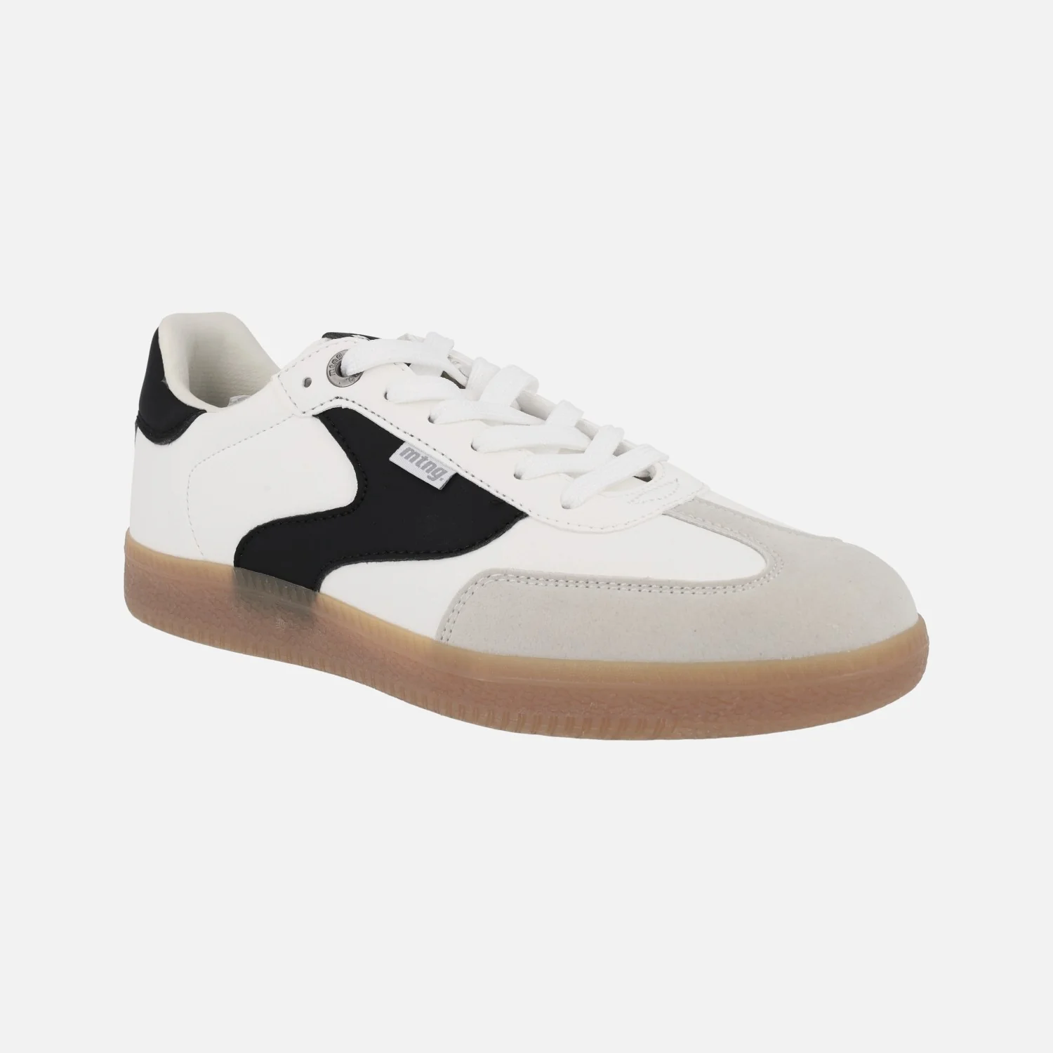 Zapatillas deportivas para hombre estilo retro de la marca Mustang, modelo Nova 84775 en combinado blanco-negro. Zapatillas de cordones, elaboradas en materiales sintéticos, combinando blanco, negro y la puntera en gris. Zapatillas bajas, con horma redonda y piso de goma. Interior sintético + textil, con plantillas extraíbles.