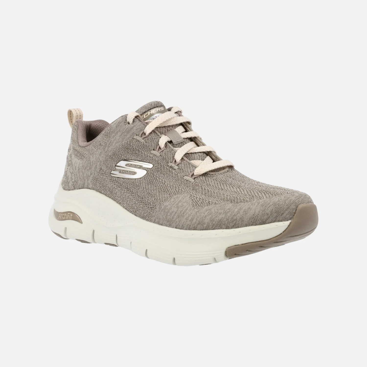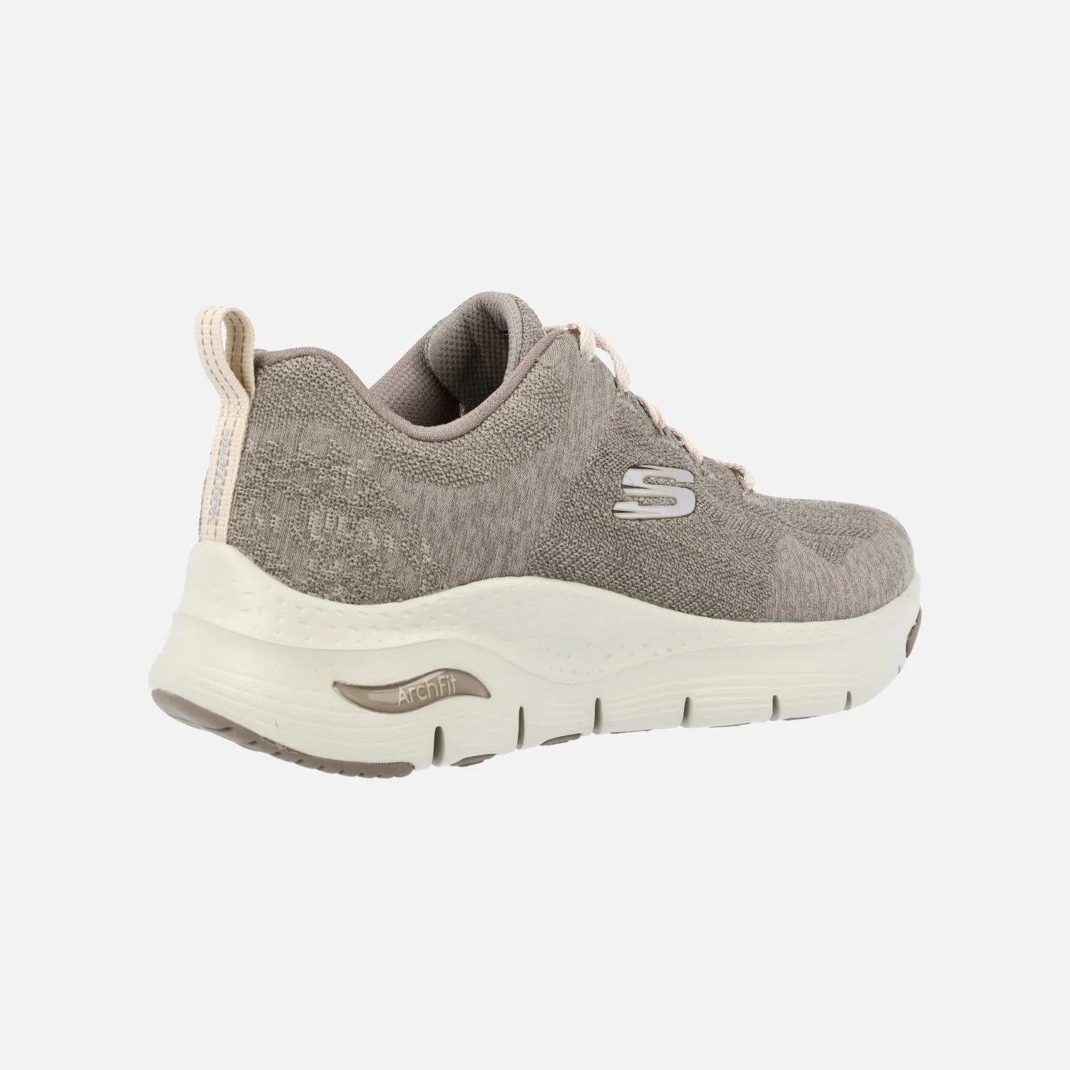 Zapatillas deportivas para mujer de la marca Skechers, modelo Arch Fit – Comfy Wave 149414 Dark Taupe DKTP. Zapatillas elaboradas en tejido malla transpirable en tonos beige oscuro (taupe) con sistema ARCH FIT con soporte del arco plantar, certificado por podólogos. Cierre de cordones. Interior textil, con plantillas extraíbles Air cooled, transpirables y con amortiguación. Piso de goma ligero, con 4,5 cms de altura trasera (3 cms en la parte delantera).