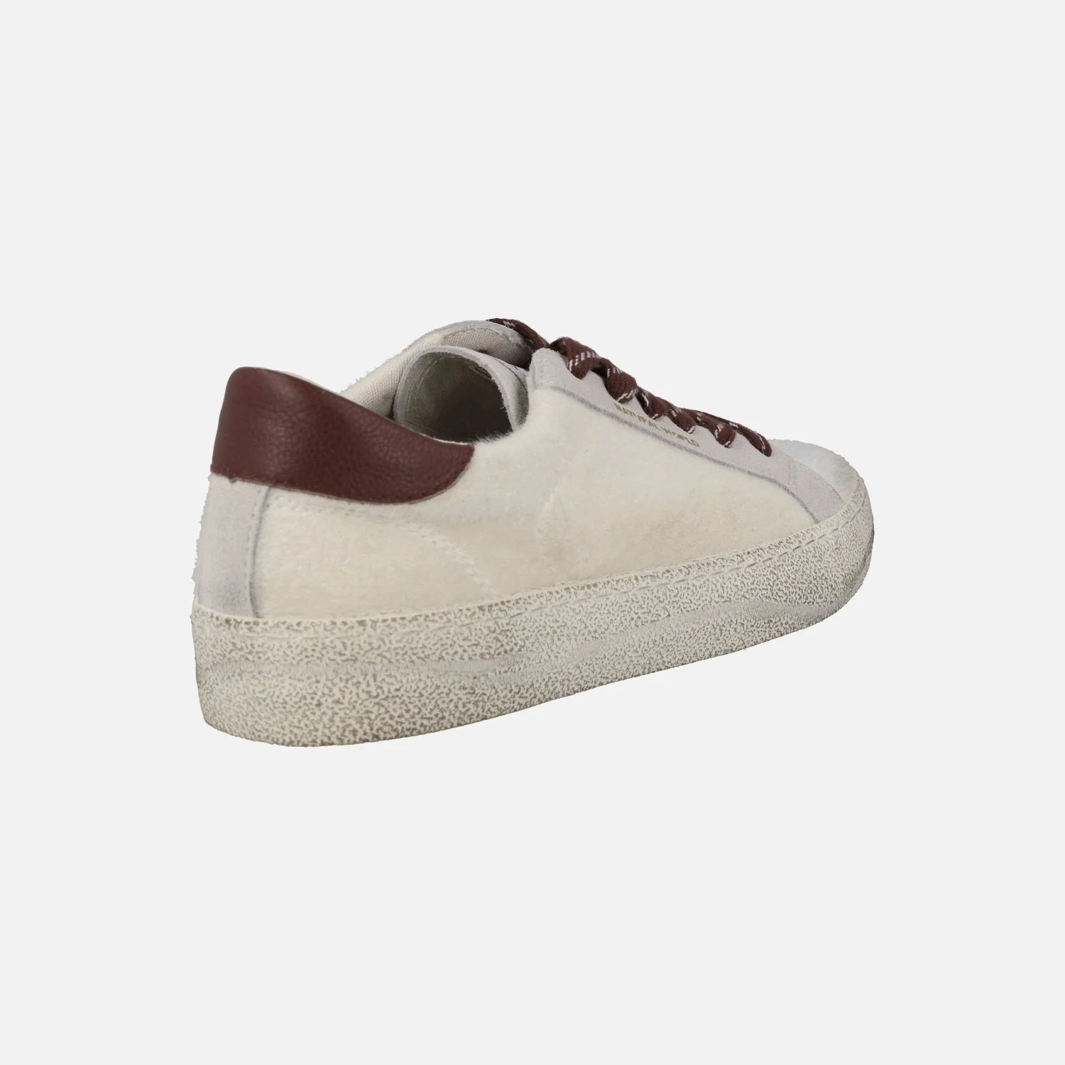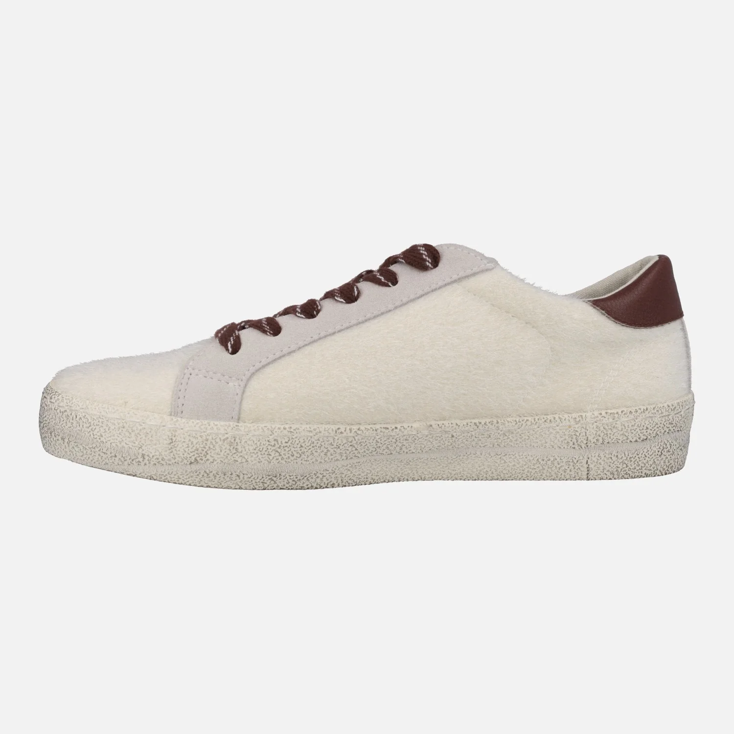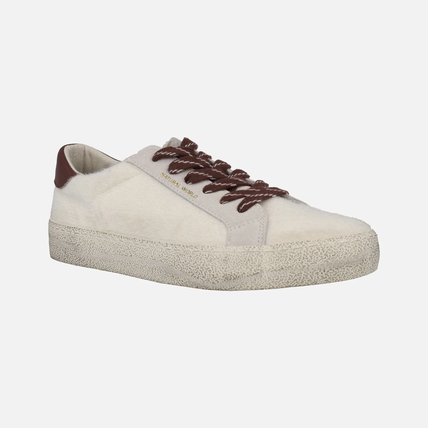 Zapatillas deportivas para mujer Natural World Rano 9031, disponibles en pelo crudo (beige) combinado con detalles en burdeos. Deportivas elaboradas en poliéster reciclado, con cierre de cordones textiles. Interior textil con plantillas extraíbles. Piso de caucho reciclado, de 3 cms de altura trasera.