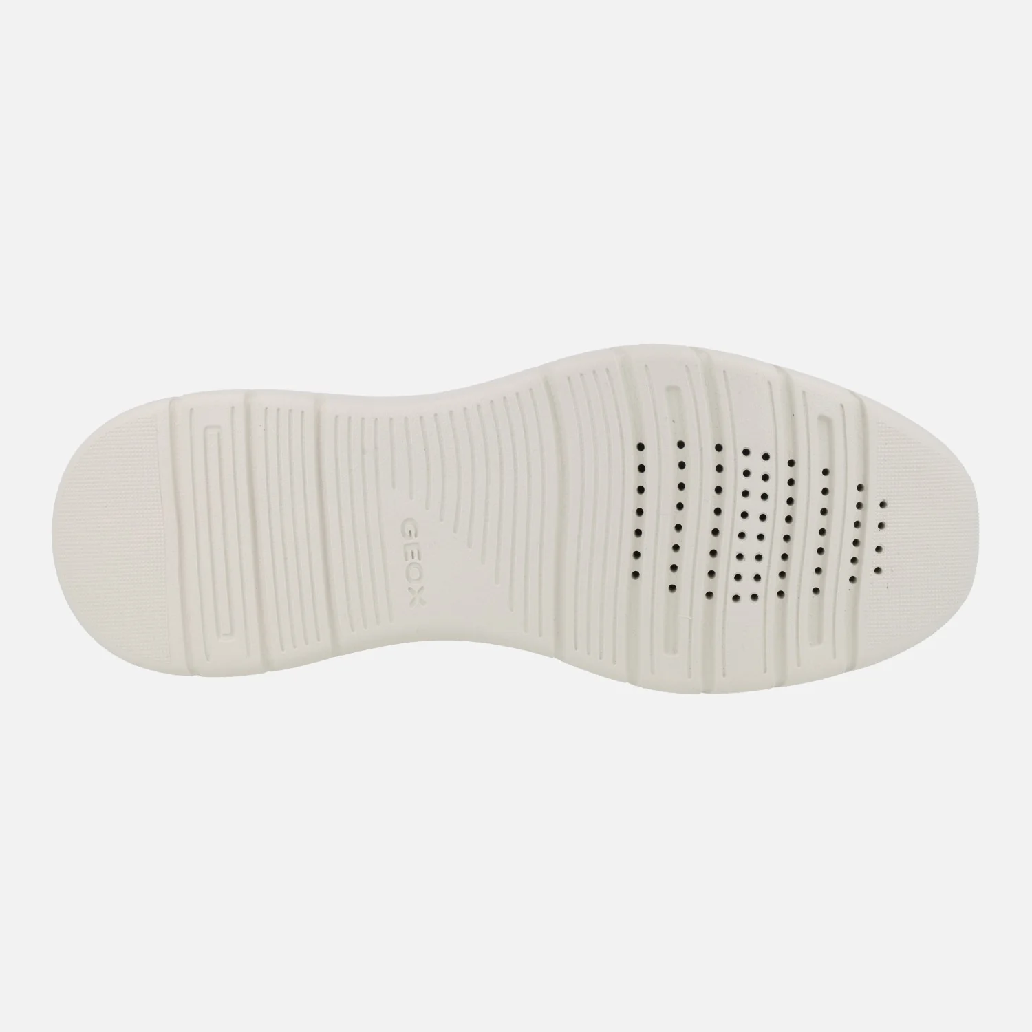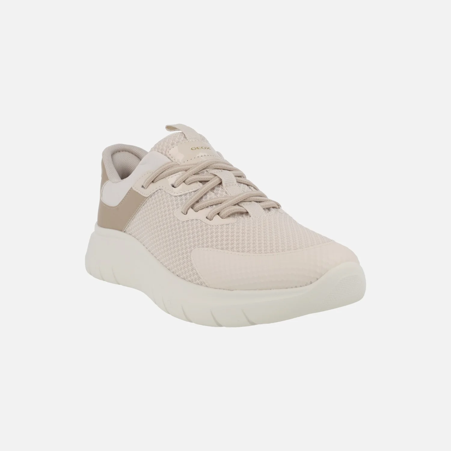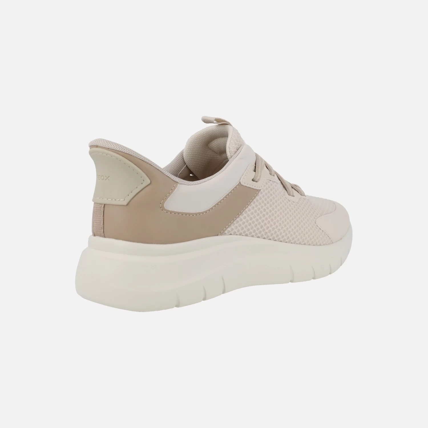 Zapatillas deportivas para mujer de la marca Geox modelo Plummery Plus D670JB Papyrus/cream. Deportivas con exterior en tejido y sintéticos, en color beige. Cierre de cordones elásticos y sistema de calce fácil en el talón, para poder calzarlos sin necesidad de agacharse. Interior mixto en tejido y sintéticos, plantillas extraíbles. Suela sintética con 3 cm de altura trasera (2,5 cm parte delantera).