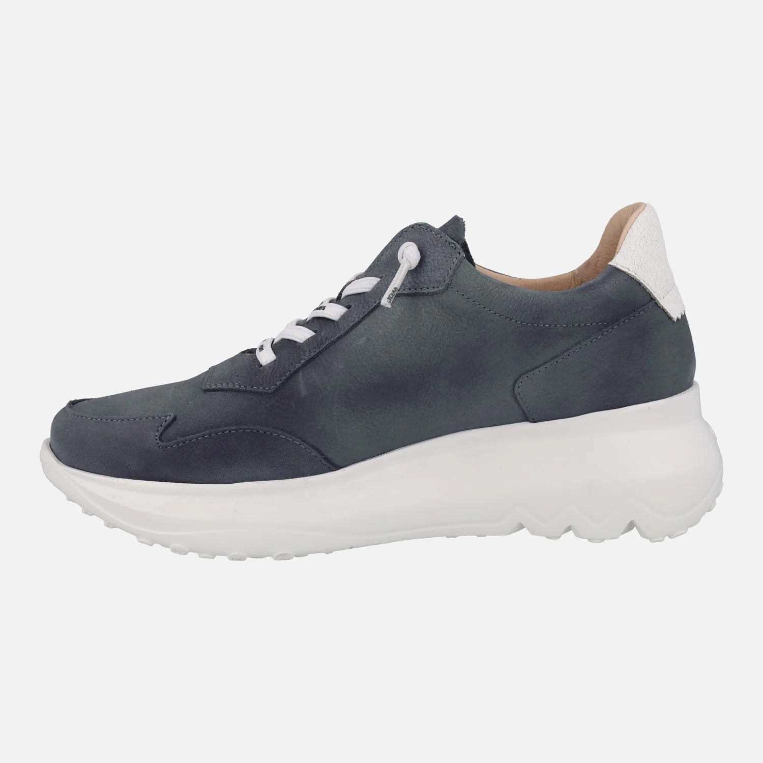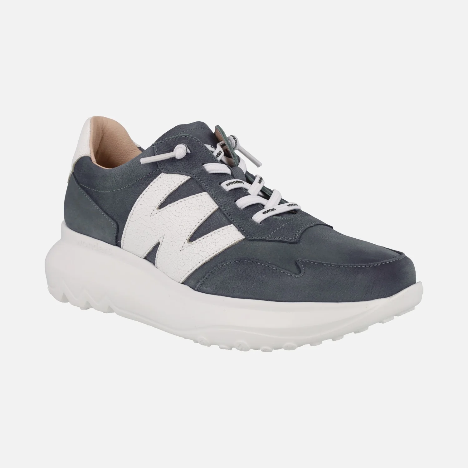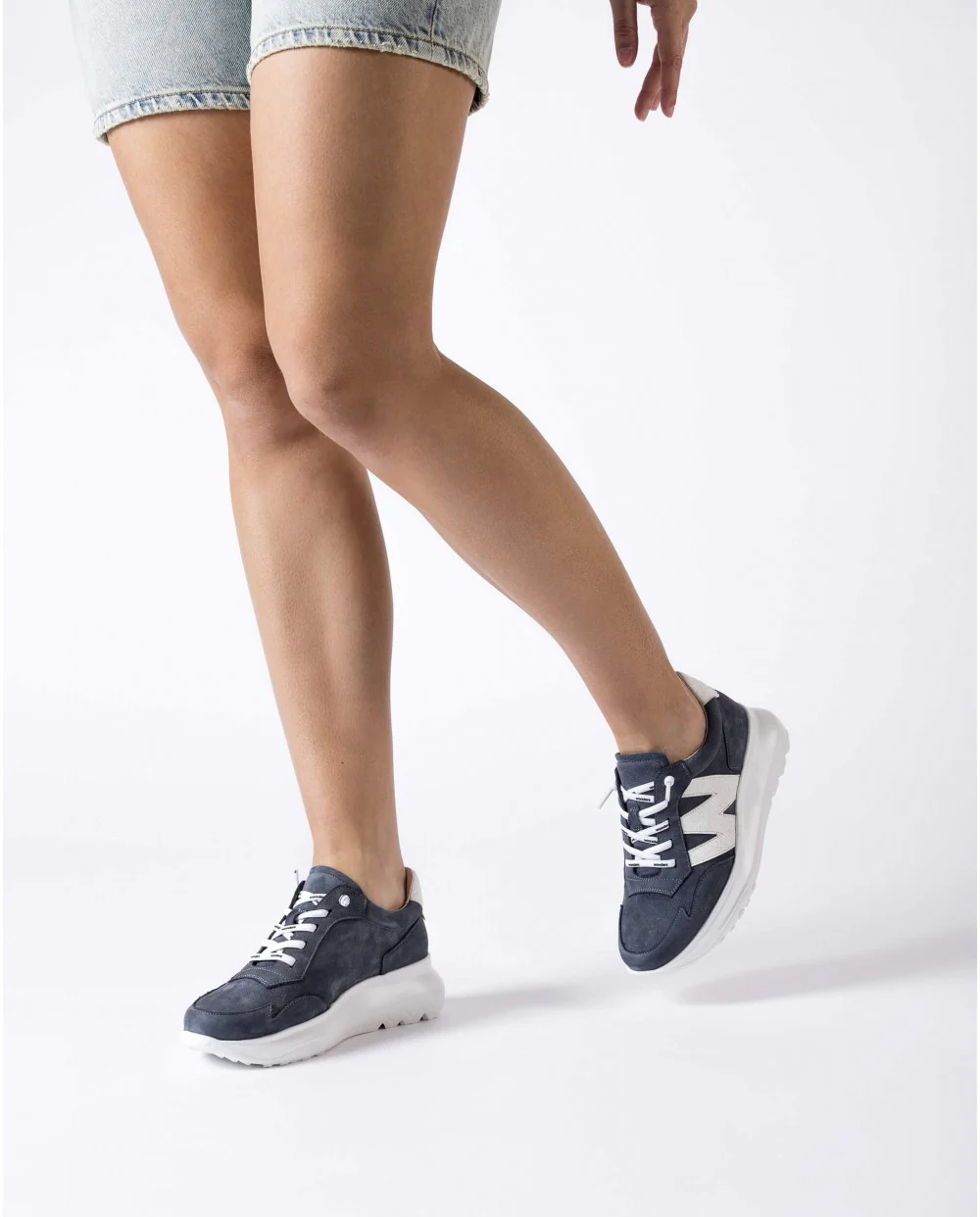 Deportivas Wonders Samira A-4002, elaboradas en piel nobuck azul marino. Deportivas elaboradas en piel nobuck azul, con detalles en piel texturizada color blanco (logo «W» de Wonders en lateral exterior y pieza de talonera), con cordones elásticos. Interior en piel y microfibra. Plantillas extraíbles con Memory foam. Suela de EVA, muy ligera, con 5 cms de altura trasera (3 cms parte delantera). Made in Spain.