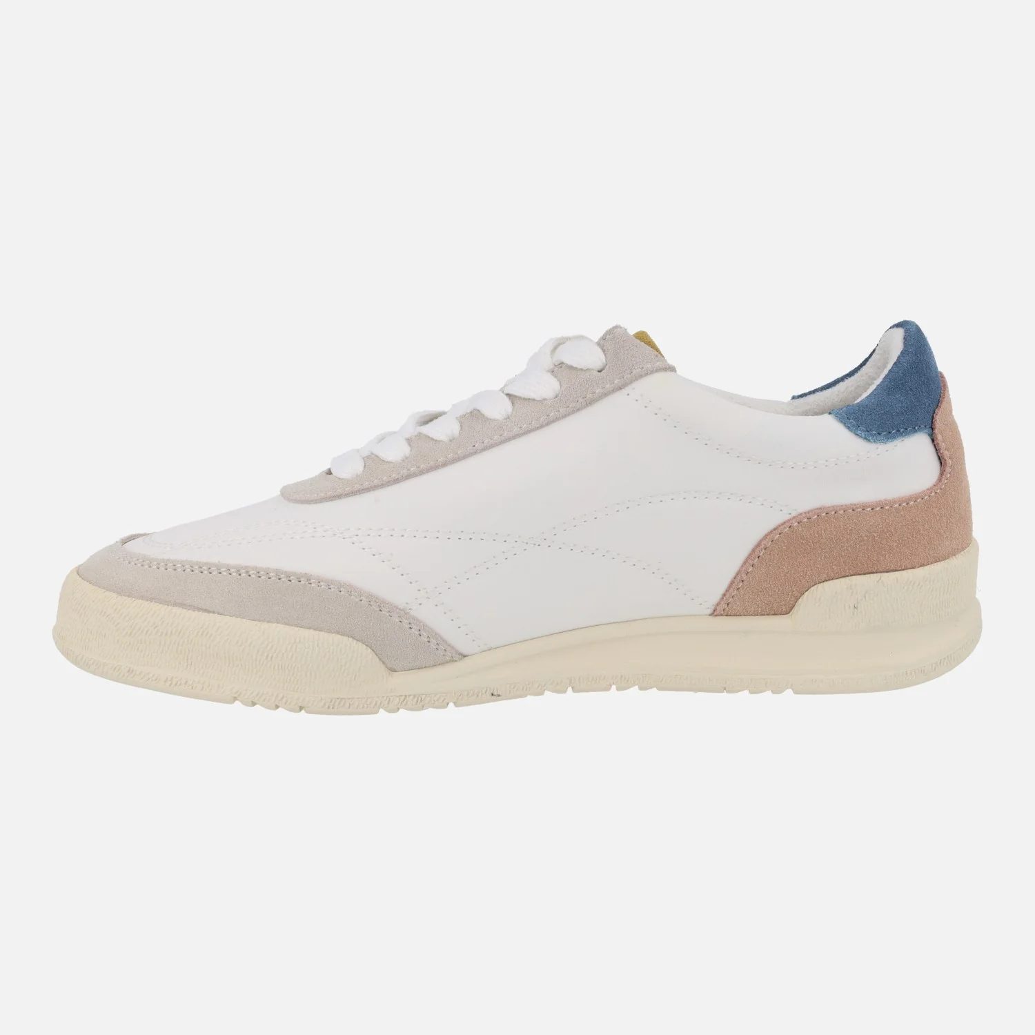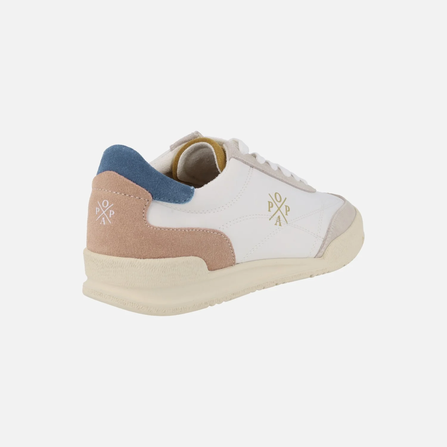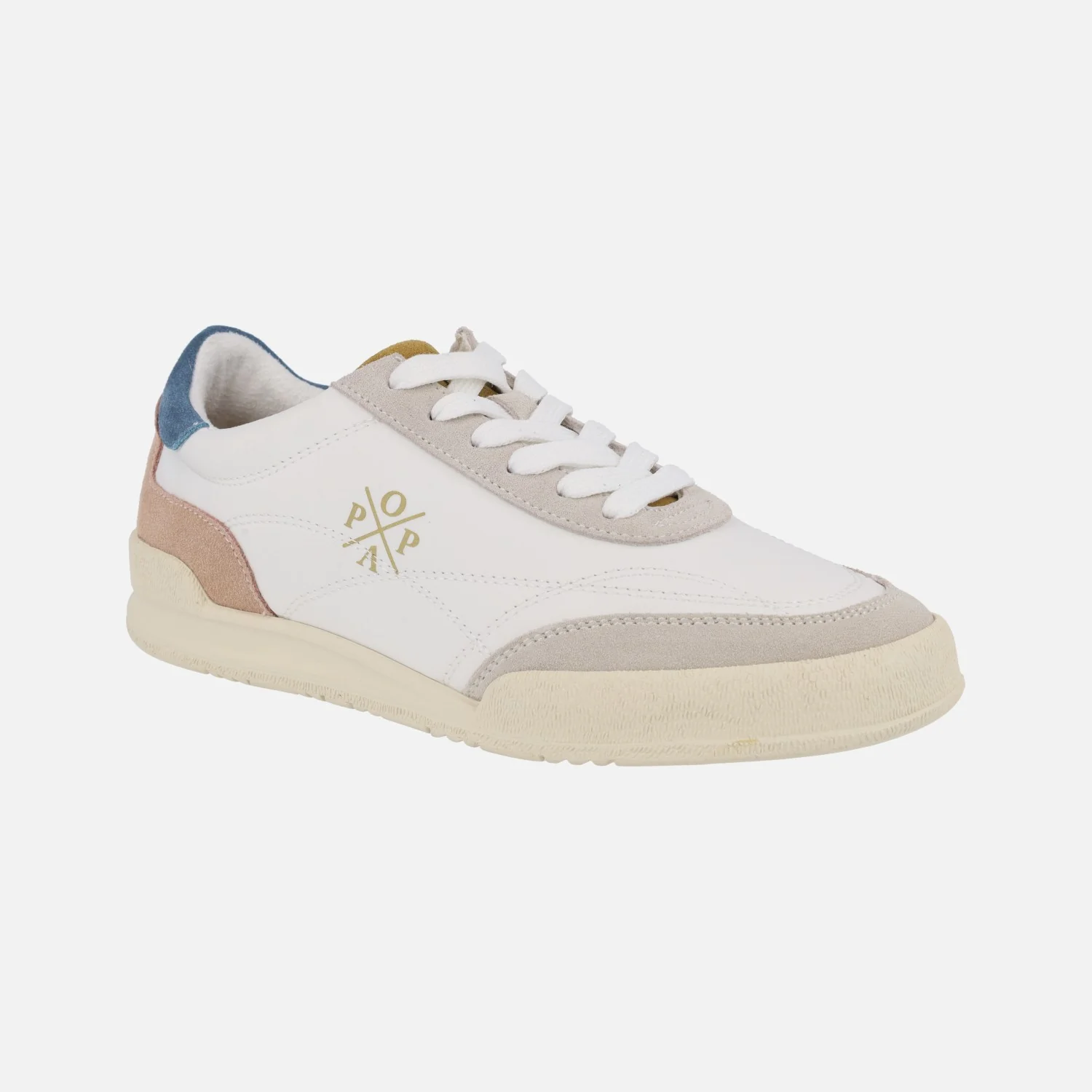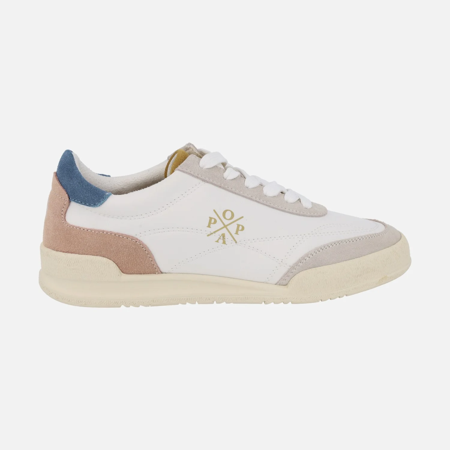 Preciosas deportivas para mujer de la marca Popa modelo Shasta Nylon Beige 061. Sneakers elaboradas en tejido blanco combinado con piezas en piel serraje en tonos azul, rosa, cuero y beige. Cierre de cordones textiles. Logo Popa en lateral exterior. Interior textil con plantillas extraíbles (piel vegana acolchada). Piso de goma, con 3 cms de altura trasera (1 cm parte delantera).