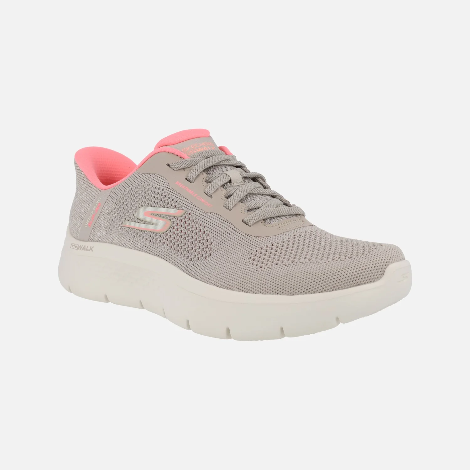Zapatillas deportivas para mujer Skechers, modelo 125503 Go Walk flex SAFIYA. Zapatillas con sistema SLIP-INS de calce rápido, sin necesidad de usar las manos. Zapatillas elaboradas en tejido malla en color taupe con detalles en rosa (TPPK). Cordones elásticos. Interior textil. Plantillas Memory foam. Piso de goma super ligero, ULTRA GO, de 3,5 cm de altura trasera (2,5 cm parte delantera).