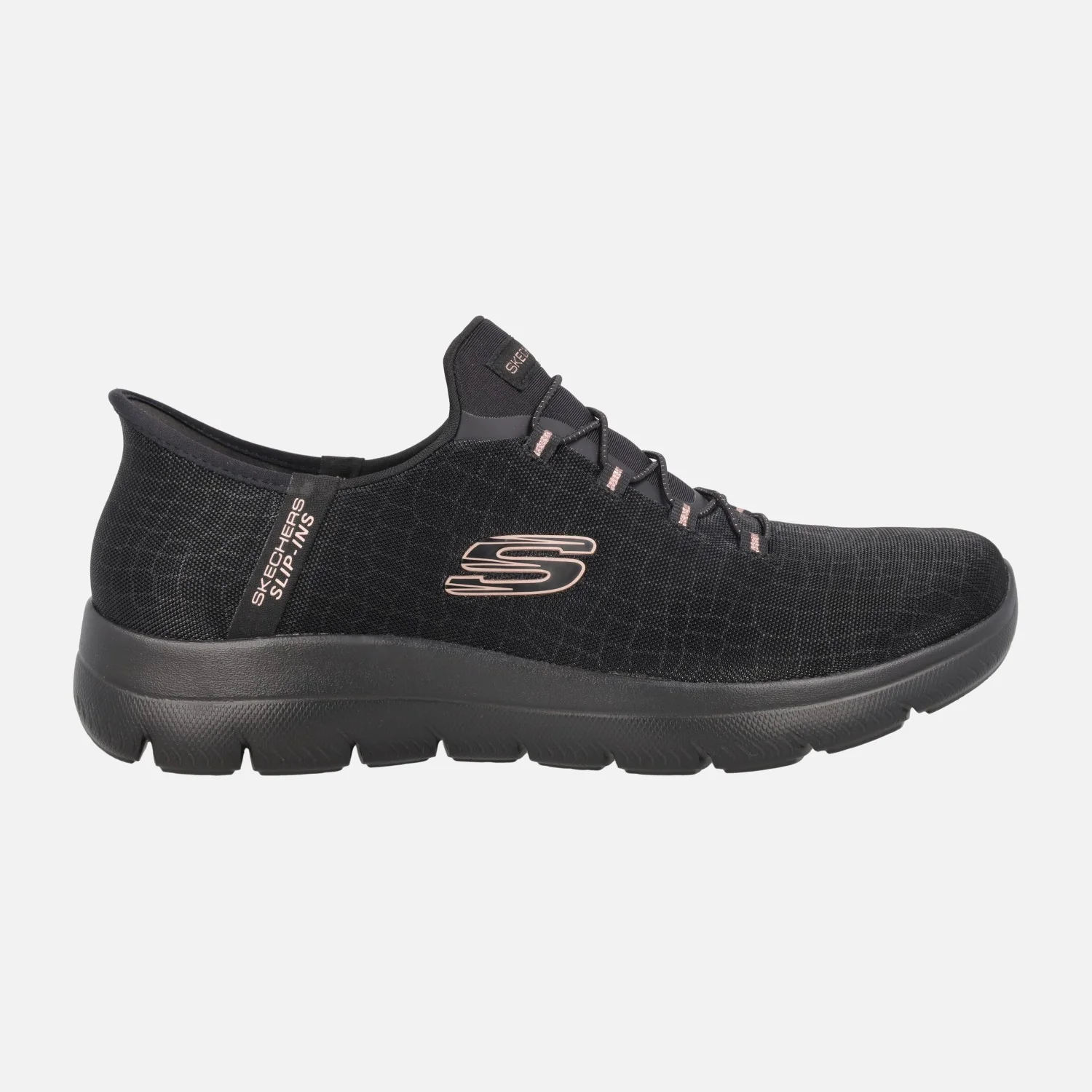 Zapatillas deportivas Skechers Summits Classy Night 150128 disponibles en TPE/GOLD (Taupe) y en BKGD(negro). Zapatillas elaboradas en tejido y sintéticos con estampado de serpiente haciendo brillos. Cierre con cordones elásticos. Interior textil. Piso sintético con 3,5 cm de altura trasera (2,5 cm parte delantera). Sistema de calzado fácil Hands Free Slip Ins (puedes calzarlos sin necesidad de usar las manos). Sistema Heel Pillow: sujeta mejor el talón evitando que se mueva.