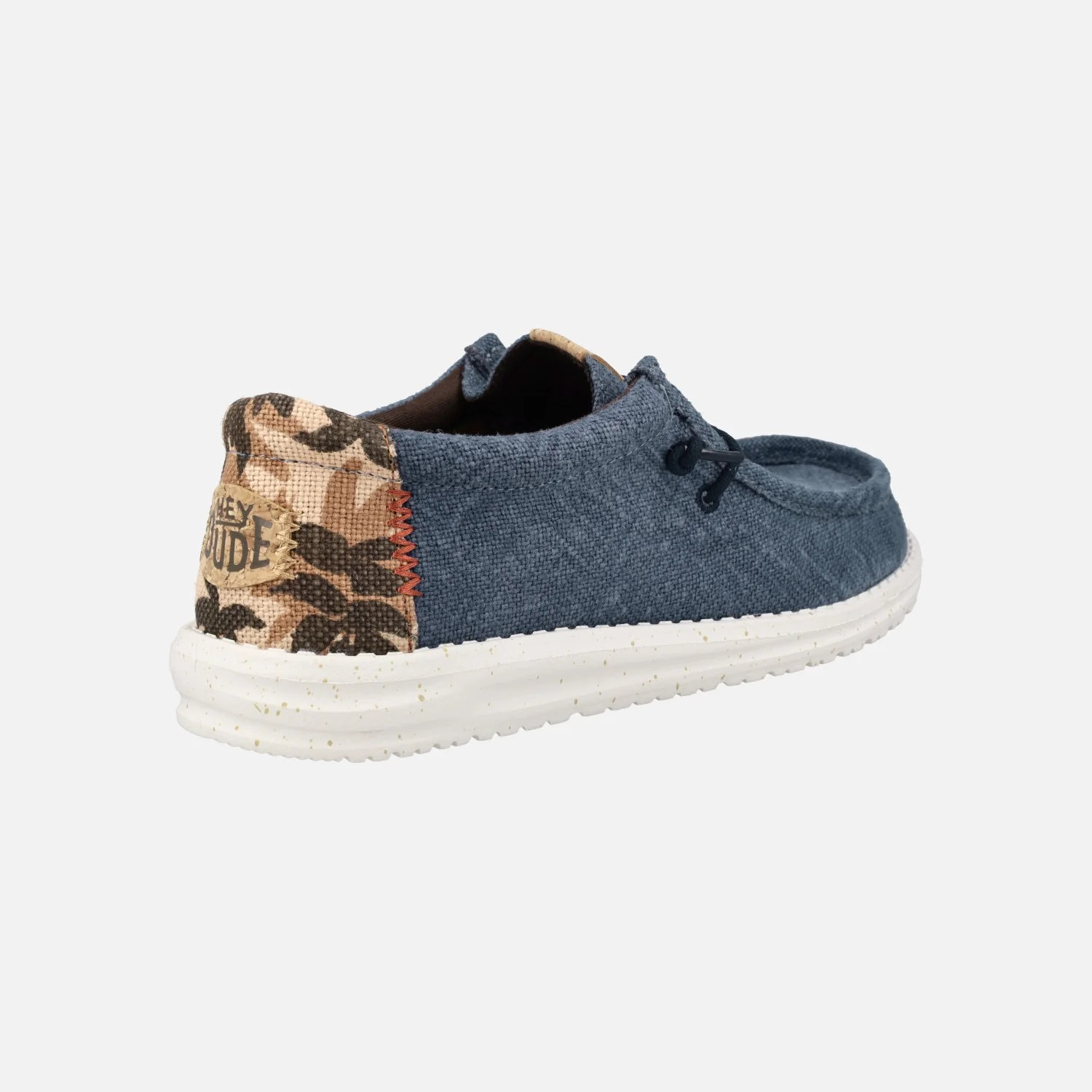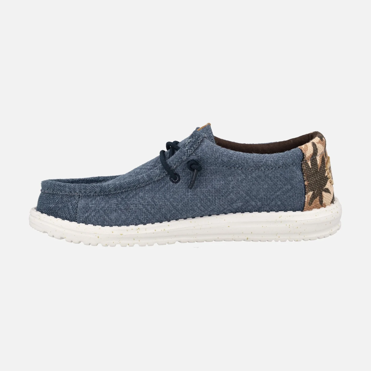 Zapatillas para hombre Hey Dude Wally Palm jute Navy Blazer/Chili red. Zapatillas elaboradas en tejido azul, con talonera estampada con diseños tropicales, cordones elásticos. Interior textil con plantillas extraíbles. Piso de goma EVA muy ligero.