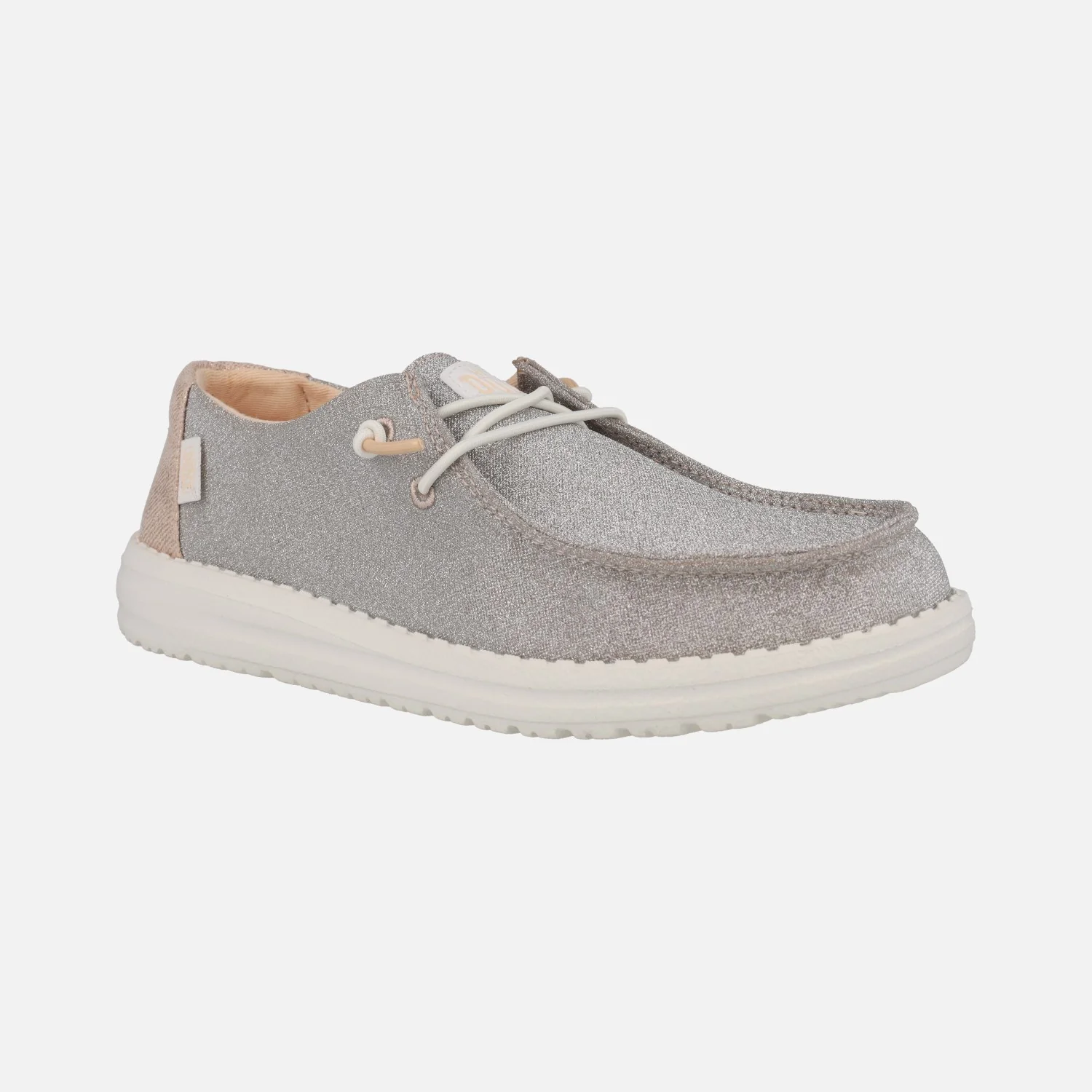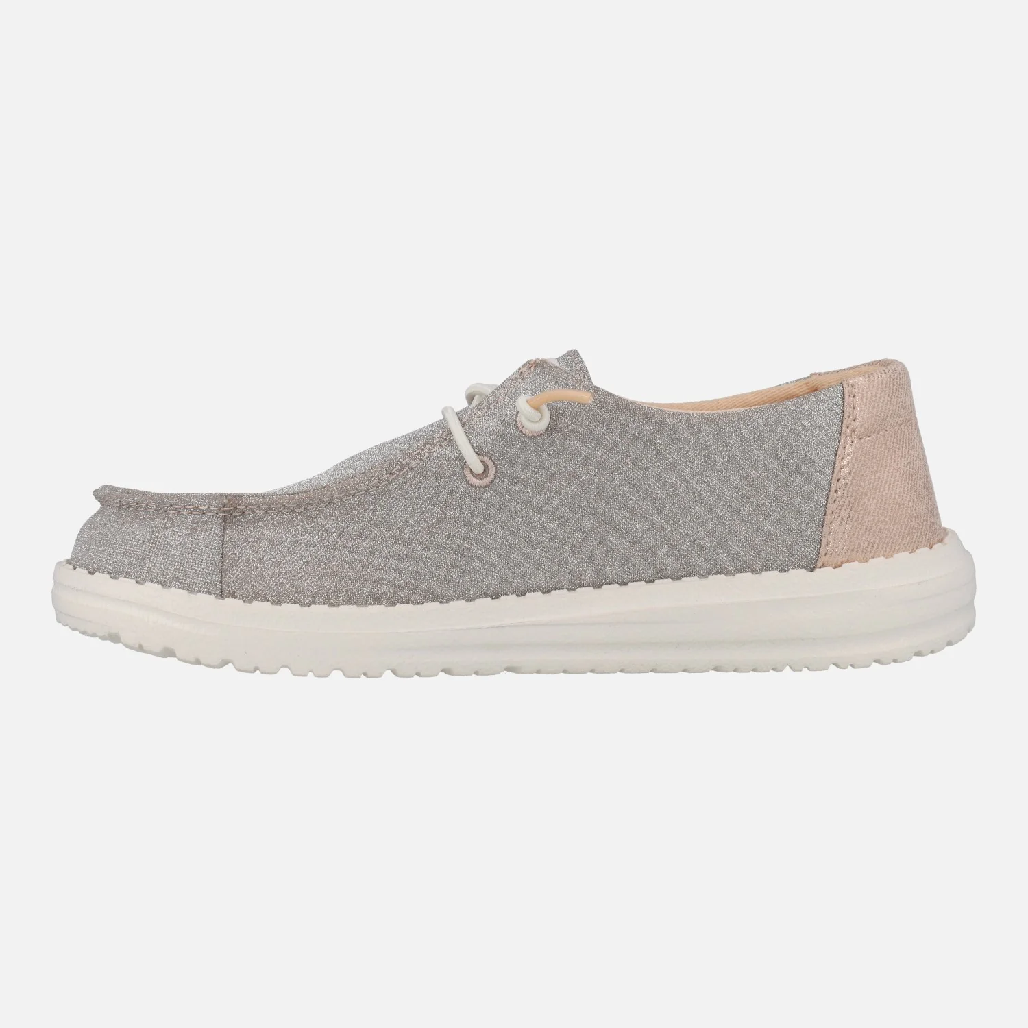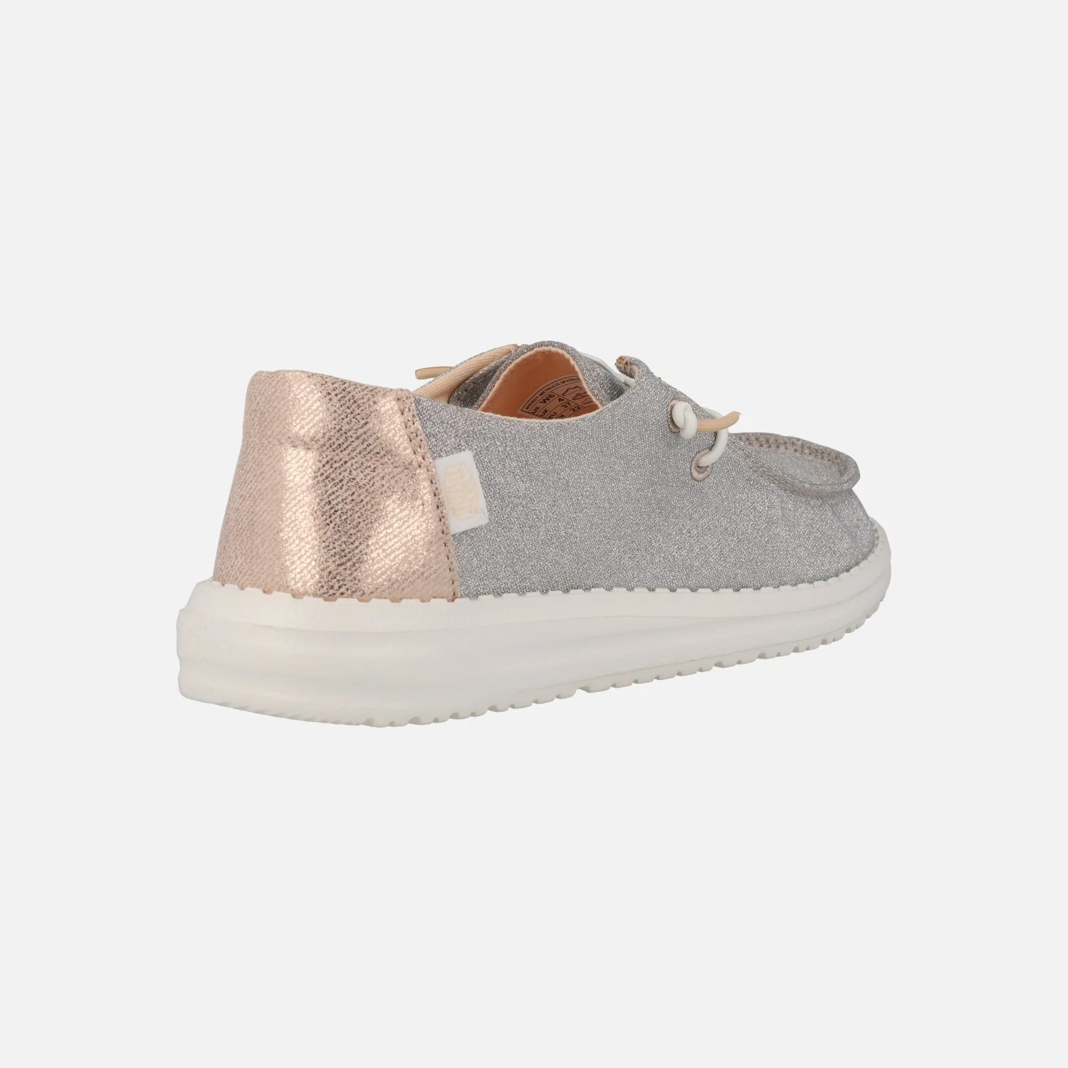 Zapatillas para mujer Hey Dude Wendy Metallic sparkle HD41082, disponibles en dos combinaciones: en rose gold (rosa) y en charcoal (gris). Elaboradas en tejido brillante, con cordones elásticos. Interior textil con plantillas de espuma extraíbles. Piso de EVA, muy ligero y flexible, con 3 cms de altura trasera.