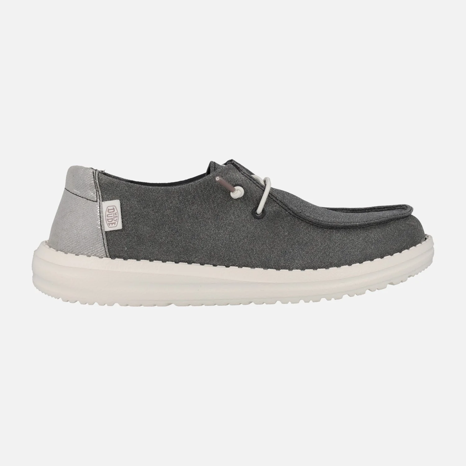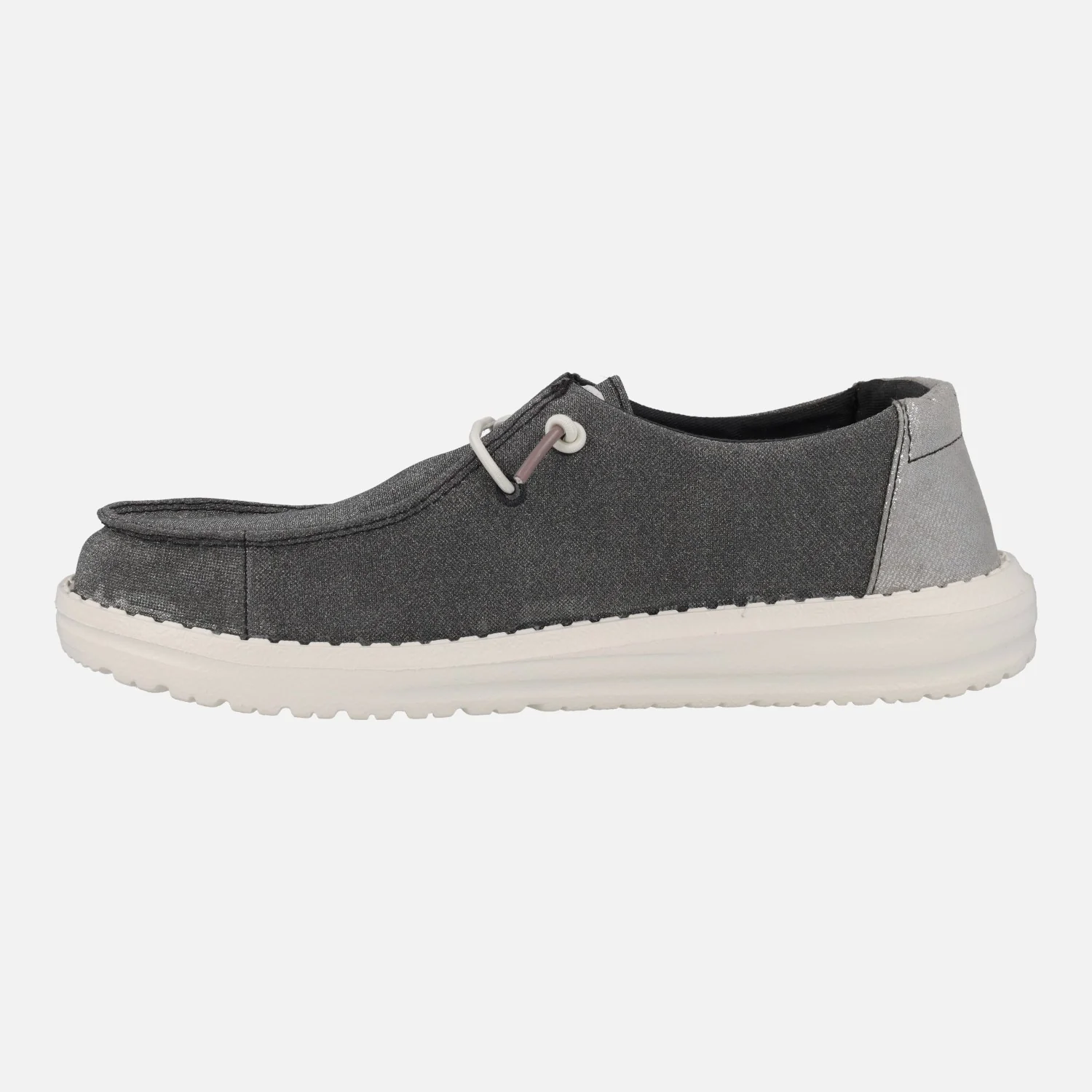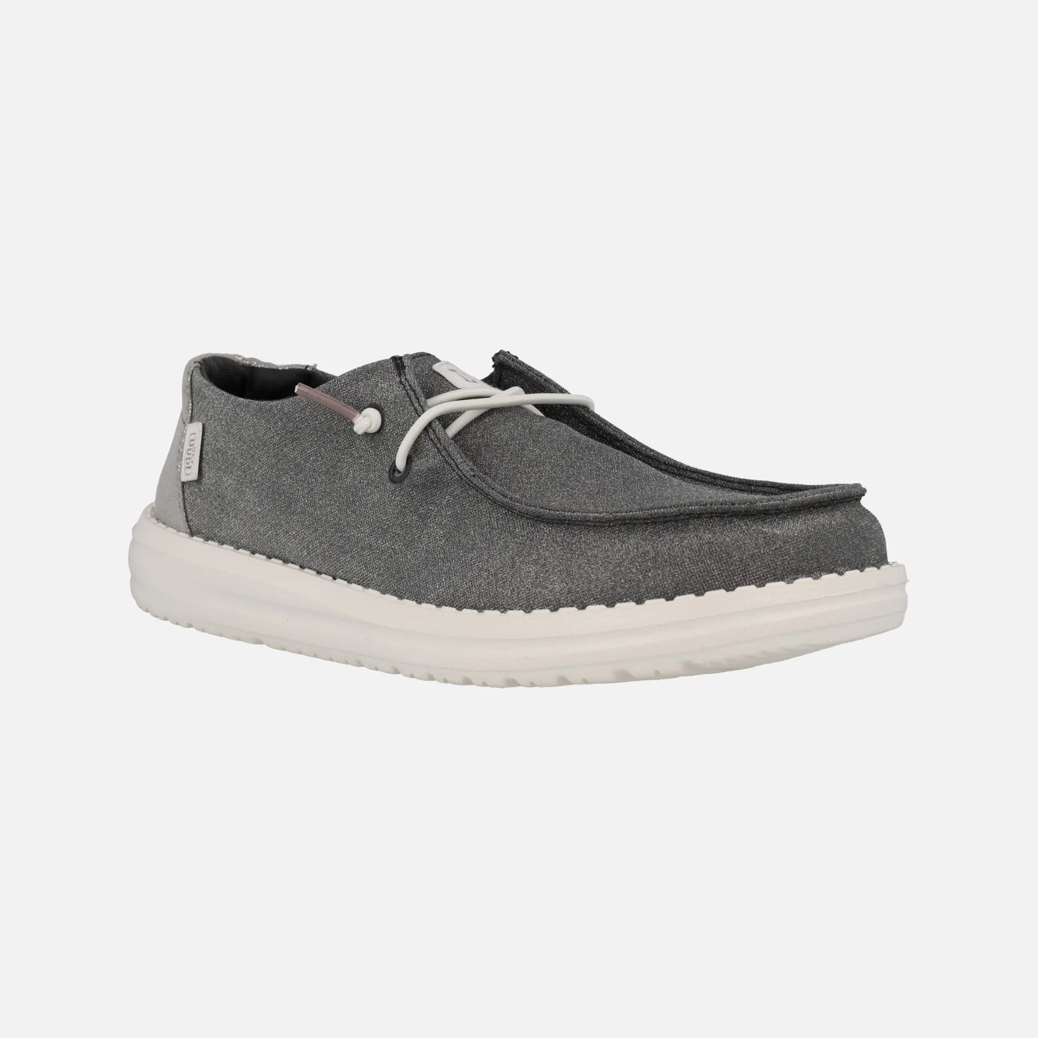 Zapatillas para mujer Hey Dude Wendy Metallic sparkle HD41082, disponibles en dos combinaciones: en rose gold (rosa) y en charcoal (gris). Elaboradas en tejido brillante, con cordones elásticos. Interior textil con plantillas de espuma extraíbles. Piso de EVA, muy ligero y flexible, con 3 cms de altura trasera.