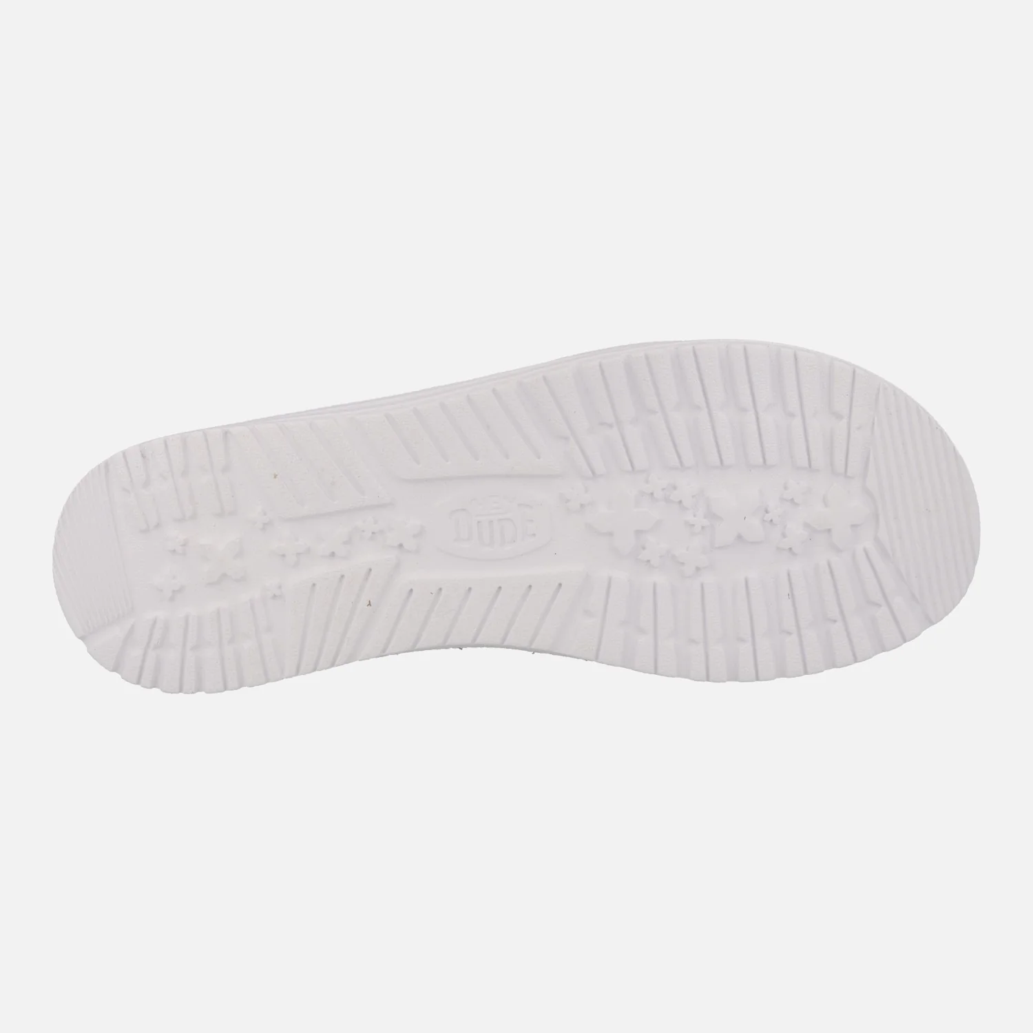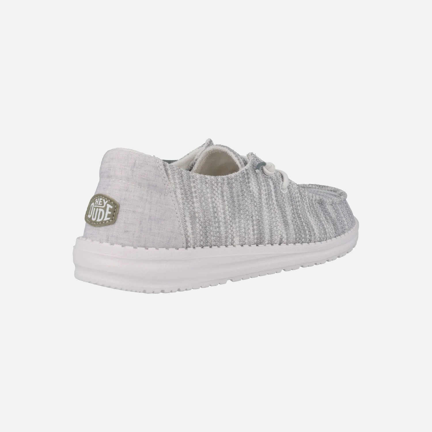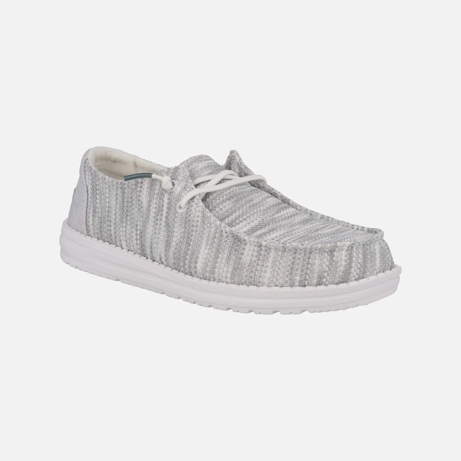 Zapatillas casual para mujer de la marca Hey dude, modelo Wendy Sox Glacier Grey HD40078-1HD. Zapatillas elaboradas en tejido jaspeado gris y blanco con cordones elásticos. Talón reforzado en tejido gris. Forro textil de algodón, plantillas de espuma viscoelástica forradas en piel y extraíbles. Suela ligera de goma EVA de 3 cms de altura.