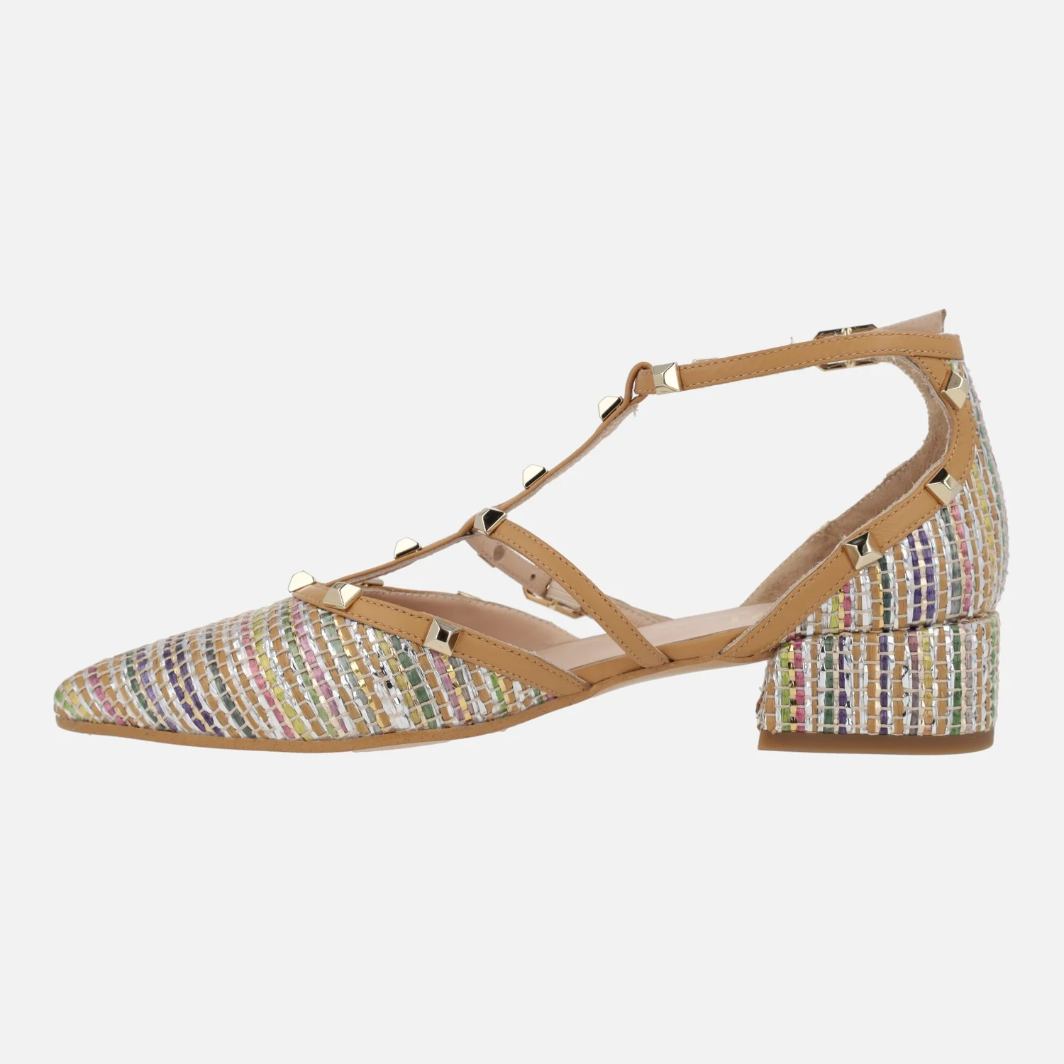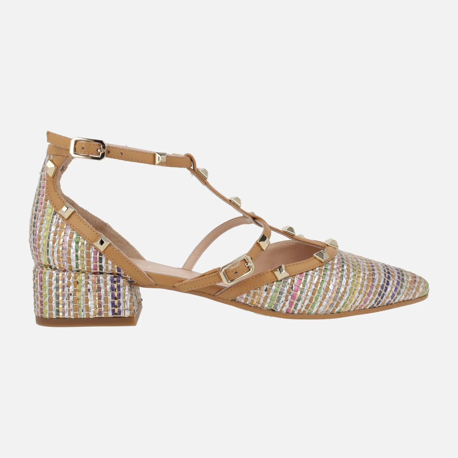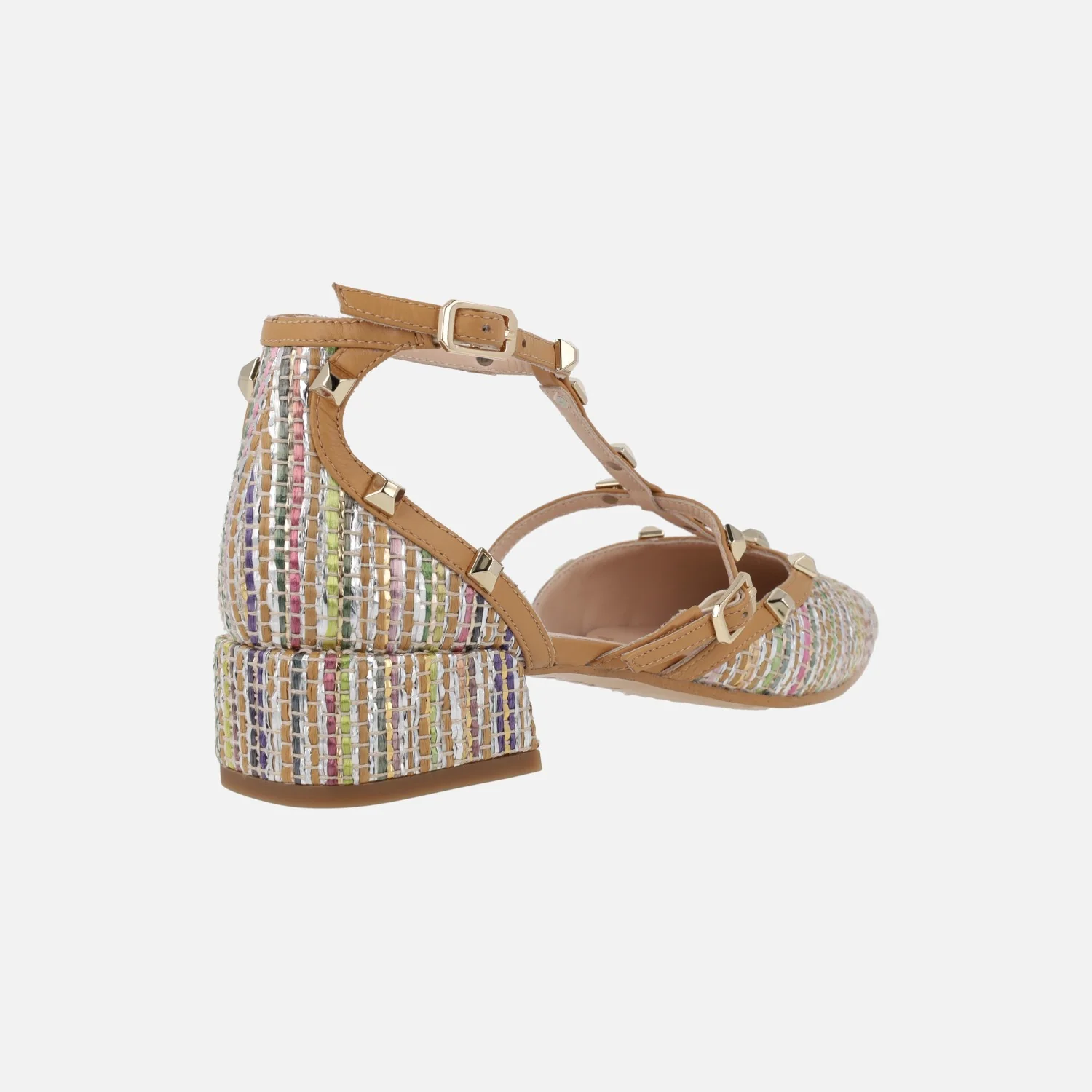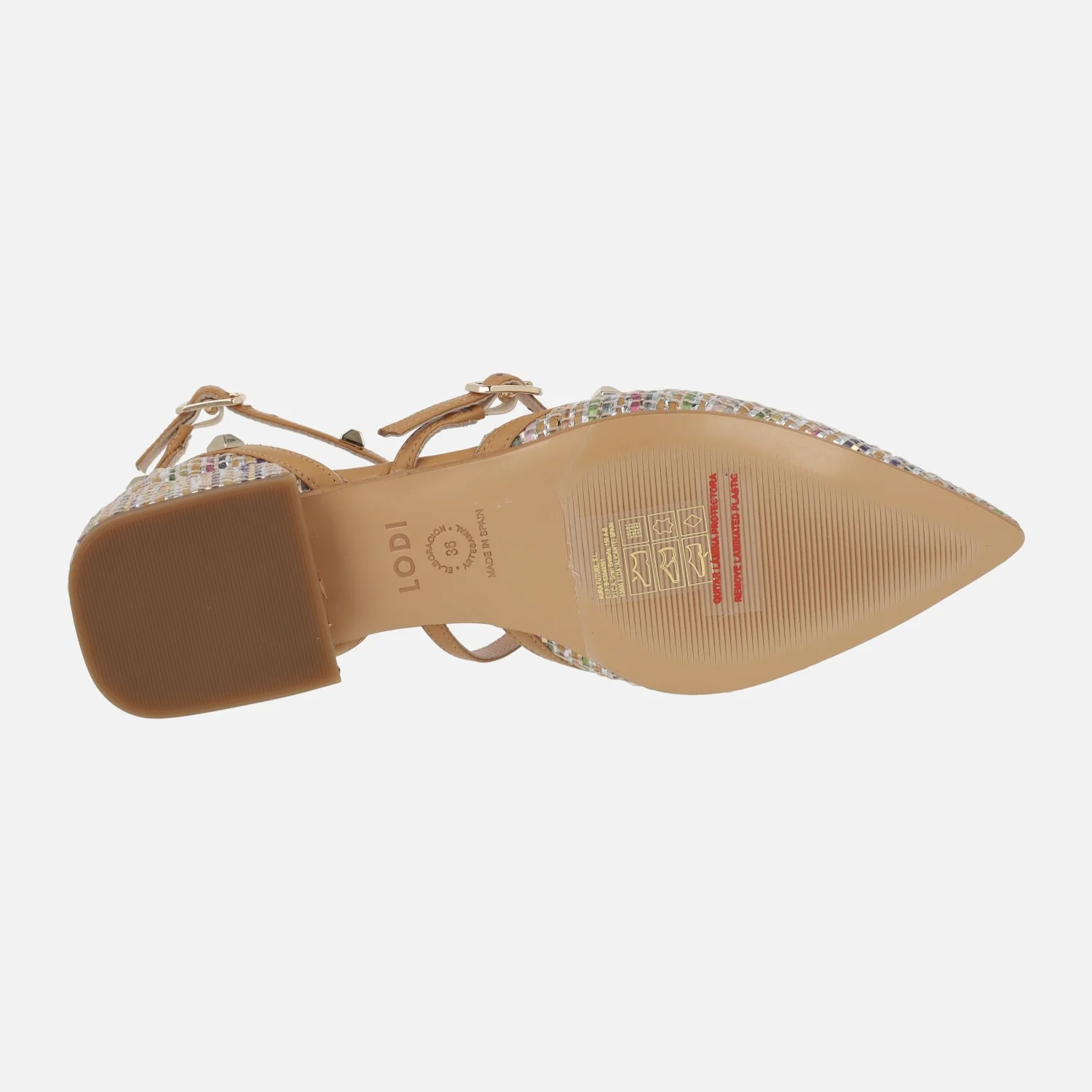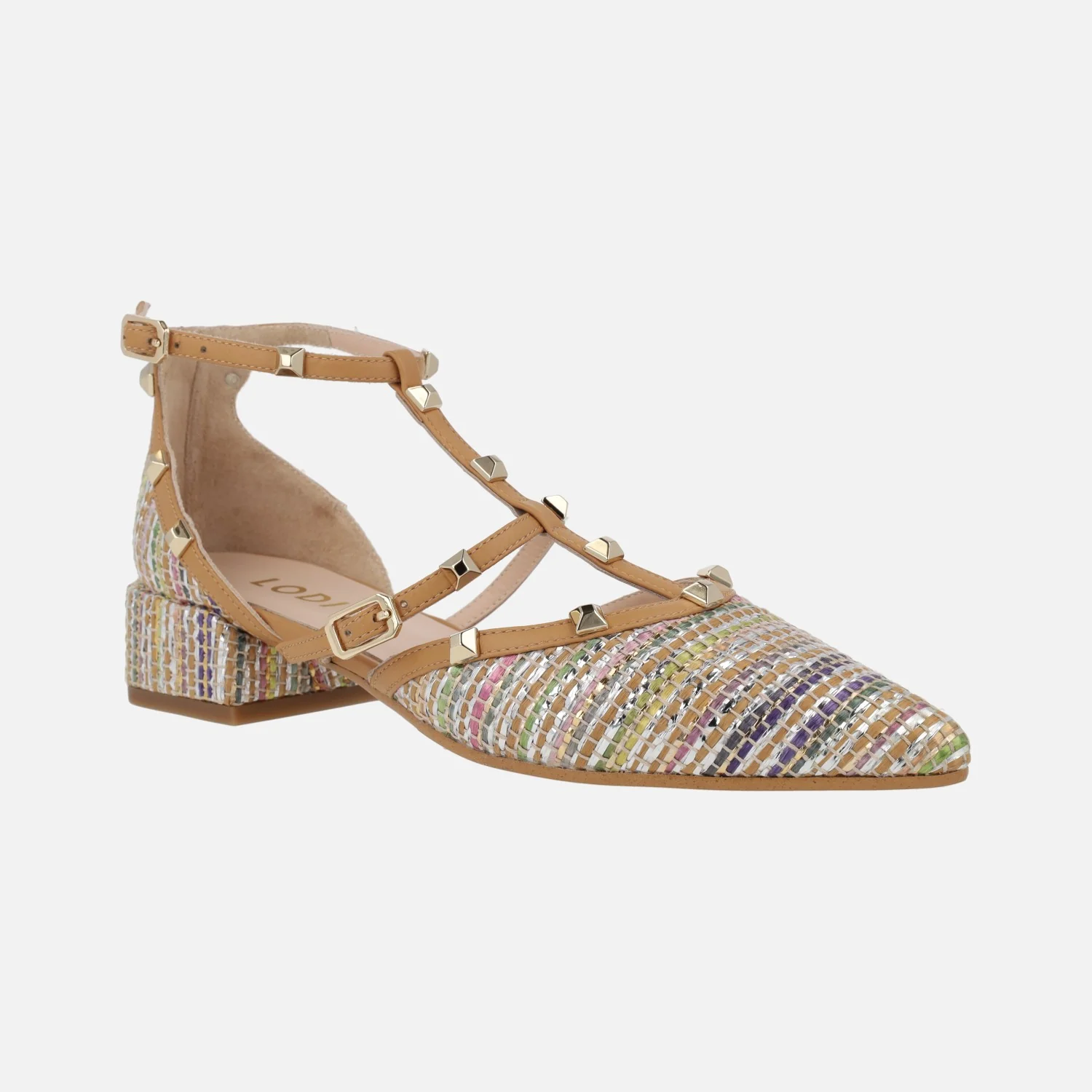 Preciosos zapatos para mujer de la marca Lodi, modelo Amur-te Roma multi. Zapatos de tacón bajito, elaborados en tejido efecto rafia multicolor, con varias tiras en piel camel cubiertas de tachas doradas. Cierre de hebilla. Abiertos por los lados, con interiores de piel, planta newgel, muy confortable. Tacones de 3,5 cms de altura. Made in Spain.
