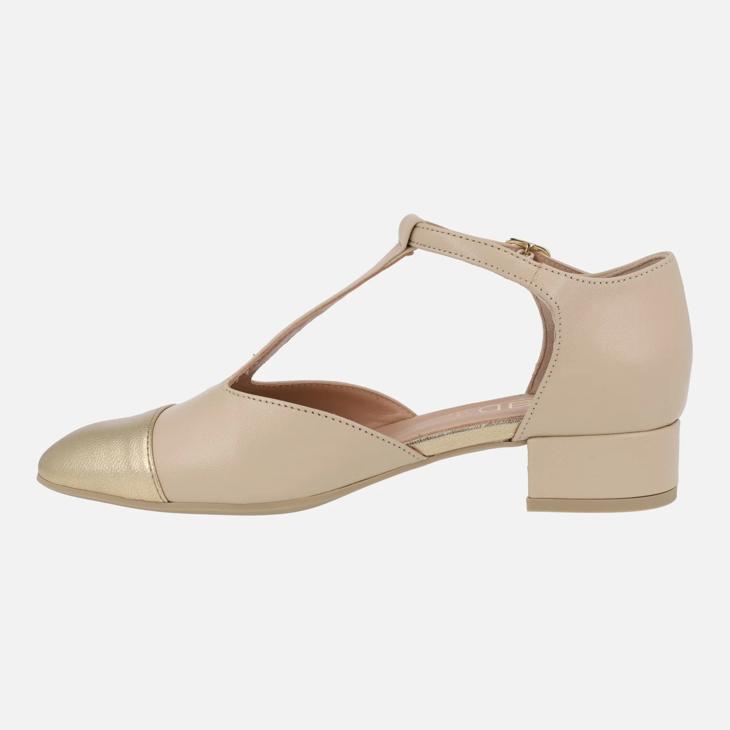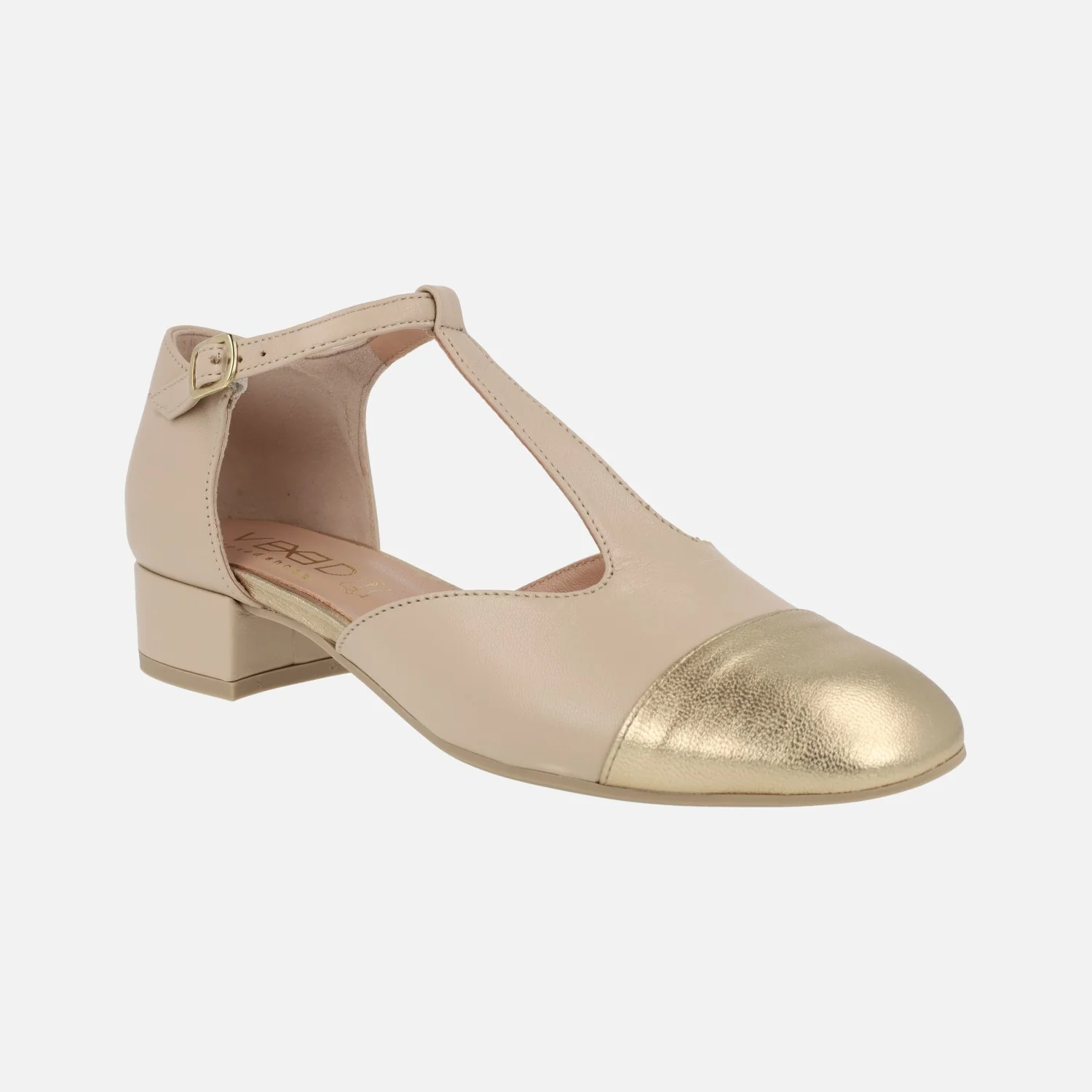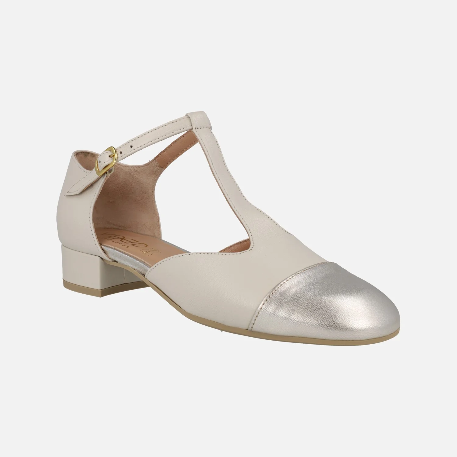 Zapatos para mujer de la marca española Vexed, modelo Deni. Estan fabricados en piel, con la puntera en metalizado. Llevan aberturas laterales y tira en el empeine que cierra con hebilla. El forro y las plantillas son de piel. El piso es de goma, con lo que se consigue que sea mas flexible. El tacón tiene una altura de 3 cms. y va forrado en piel.