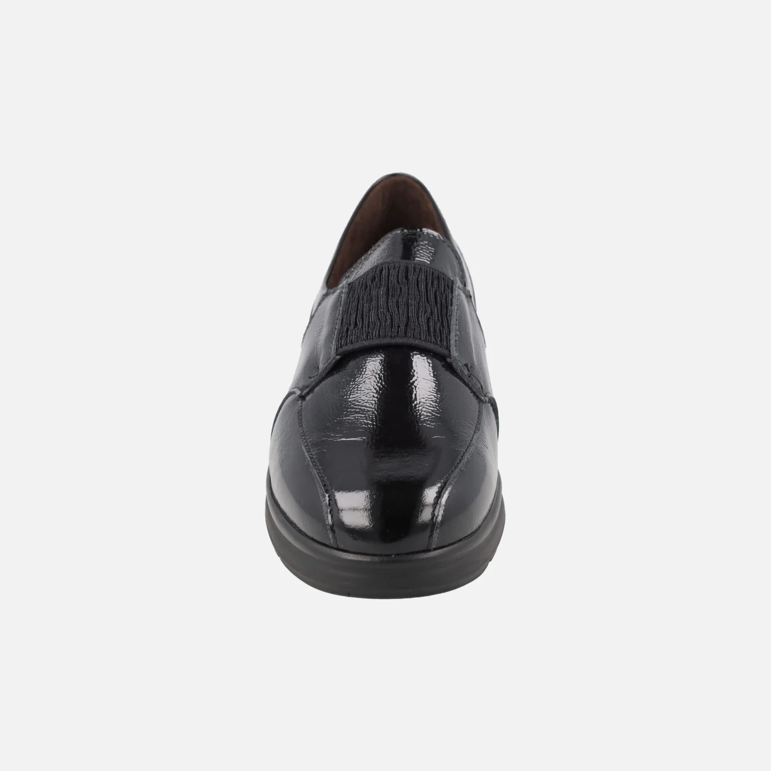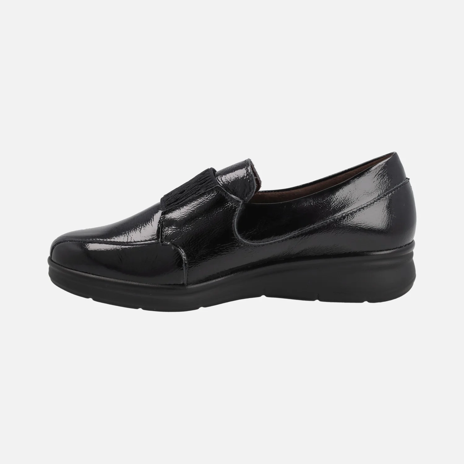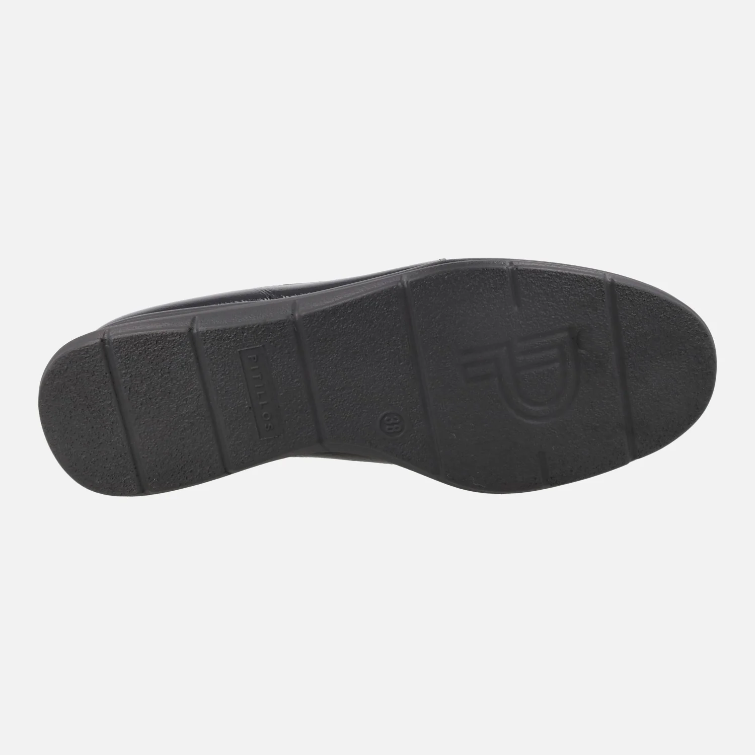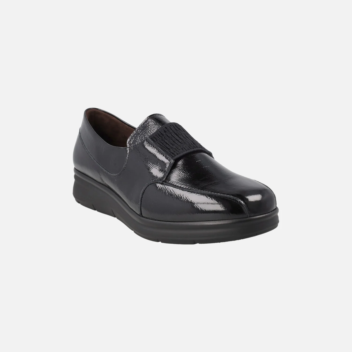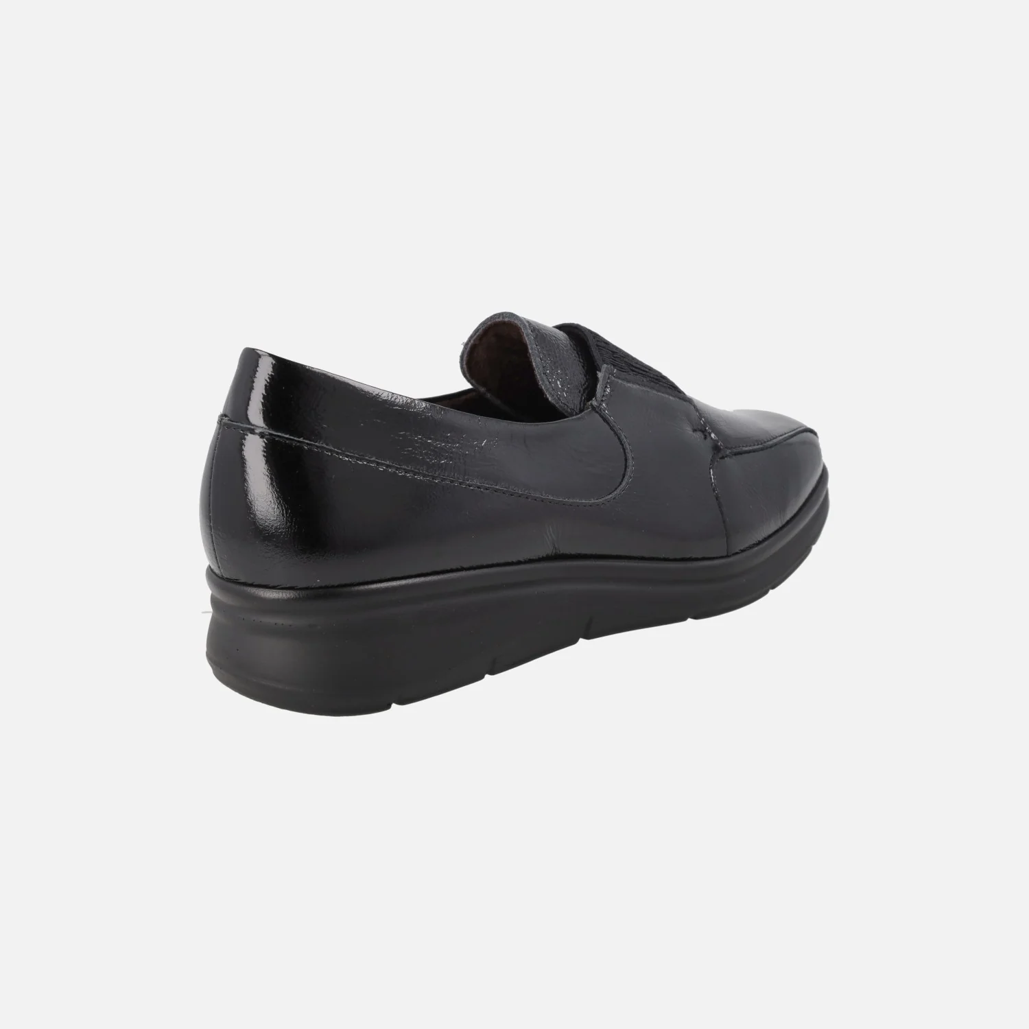 Mocasines confort para mujer de la marca Pitillos modelo 10705 Negro. Mocasines confort elaborados en charol negro, con banda elástica al empeine, para mejor calce y ajuste. Interior textil, con plantillas extraíbles. Piso sintético, con 3,5 cm de altura trasera y 1,5 cm en la parte delantera.