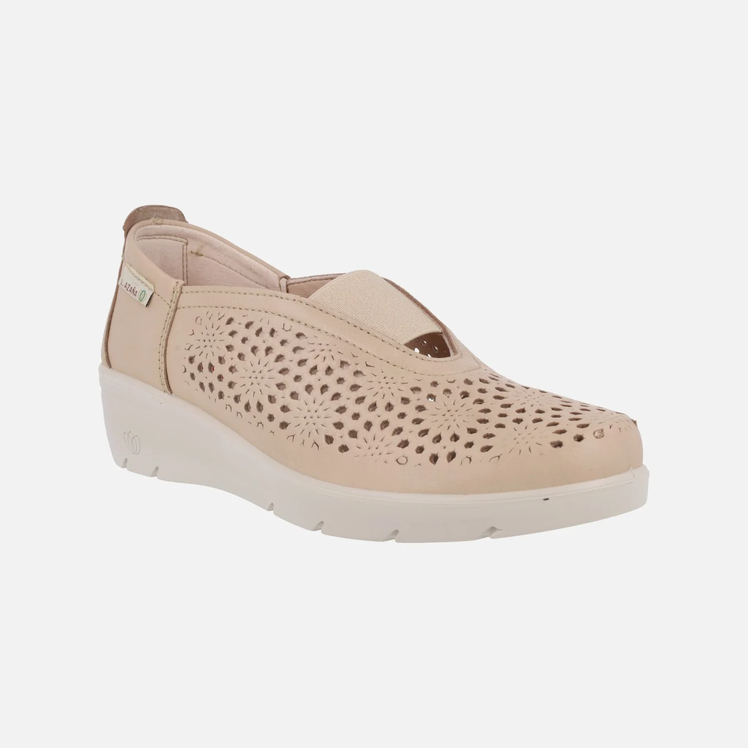 Zapatos confort para mujer de la marca Laura Azaña modelo LA26812NA-Girasol en piel napa beige. Zapatos de piel con dibujos troquelados y elástico al empeine para mejor sujeción. Interiores textil. Piso de goma, de 4 cms de altura trasera (1,5 cms parte delantera). Made in Spain.