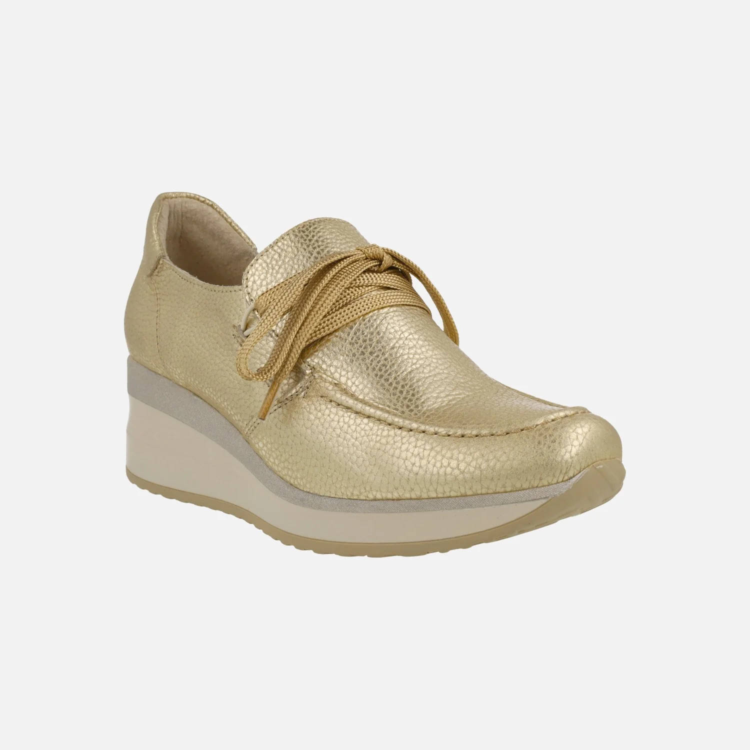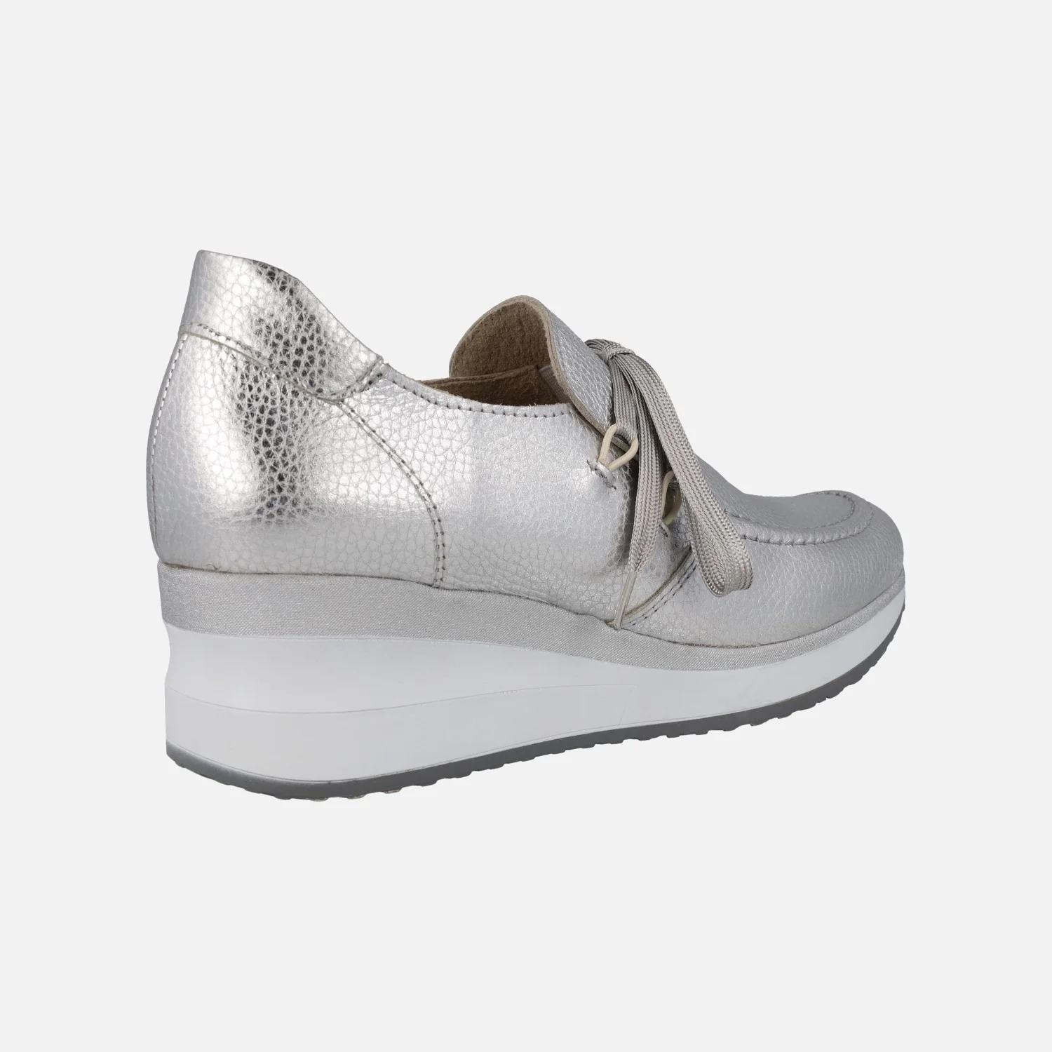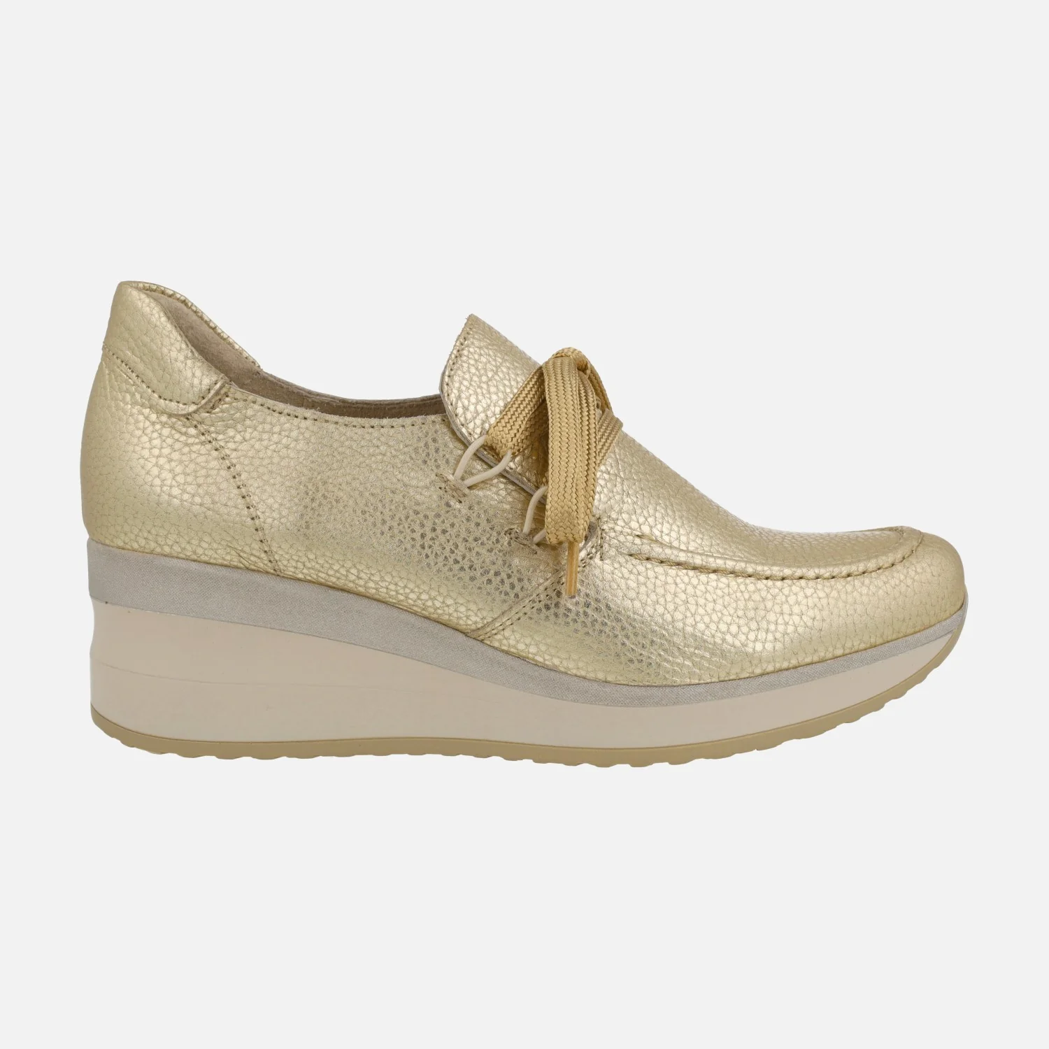 Zapatos confort de la marca Lince modelo 52151, disponibles en color plata y en color oro. Zapatos de piel metalizada, con cierre de cordones. Interiores forrados de piel. Cuña de goma, con 5 cm de altura trasera (2 cm parte delantera).