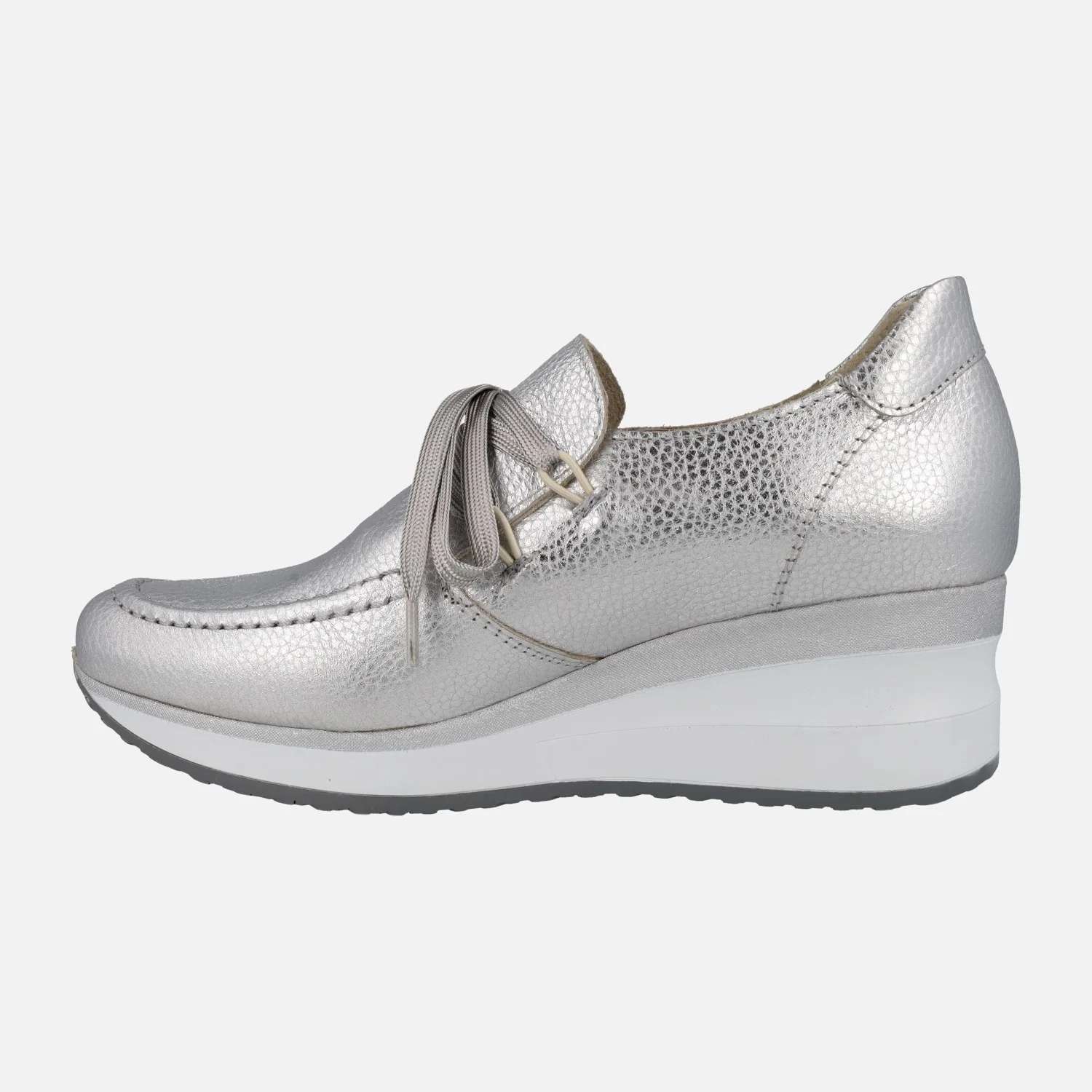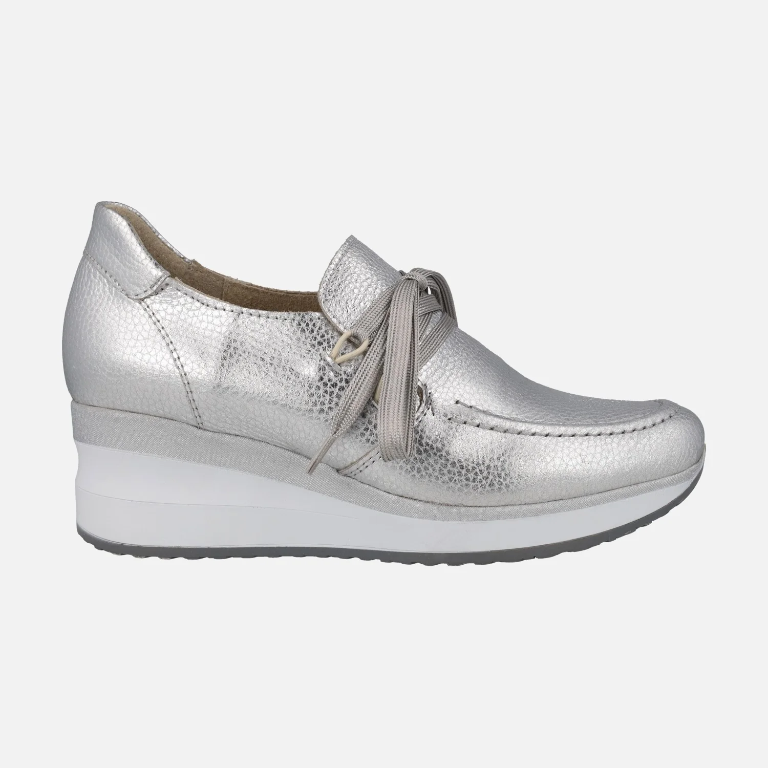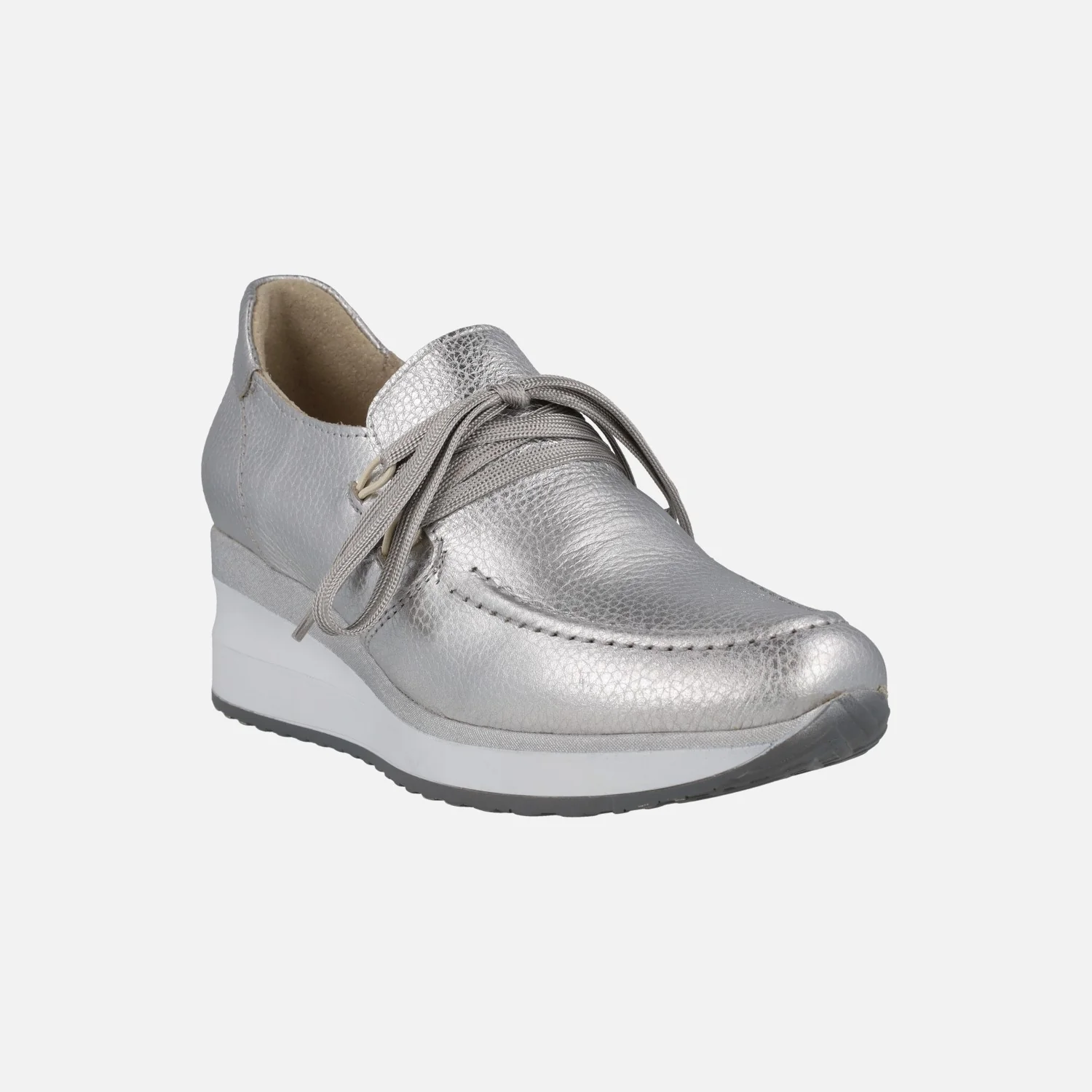 Zapatos confort de la marca Lince modelo 52151, disponibles en color plata y en color oro. Zapatos de piel metalizada, con cierre de cordones. Interiores forrados de piel. Cuña de goma, con 5 cm de altura trasera (2 cm parte delantera).