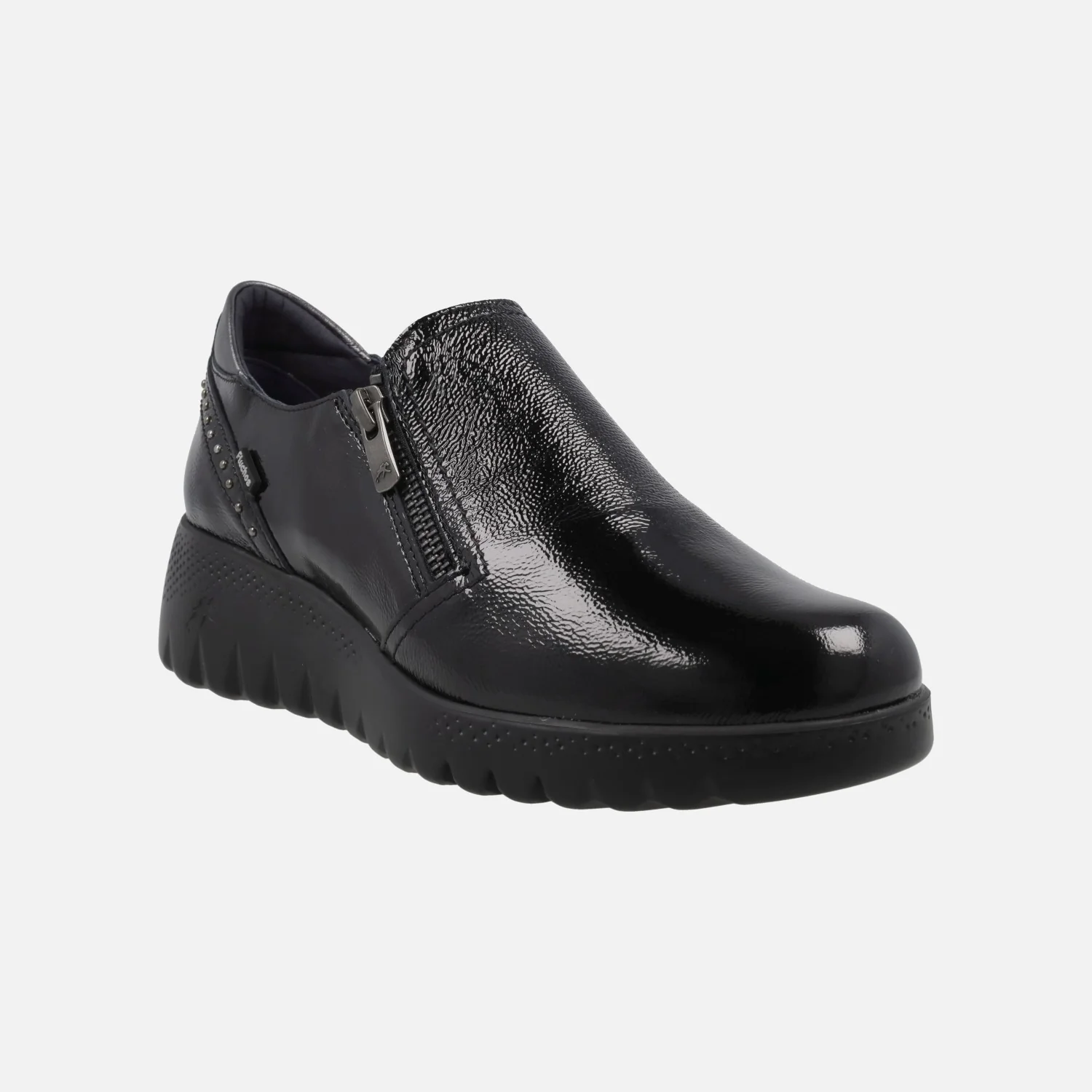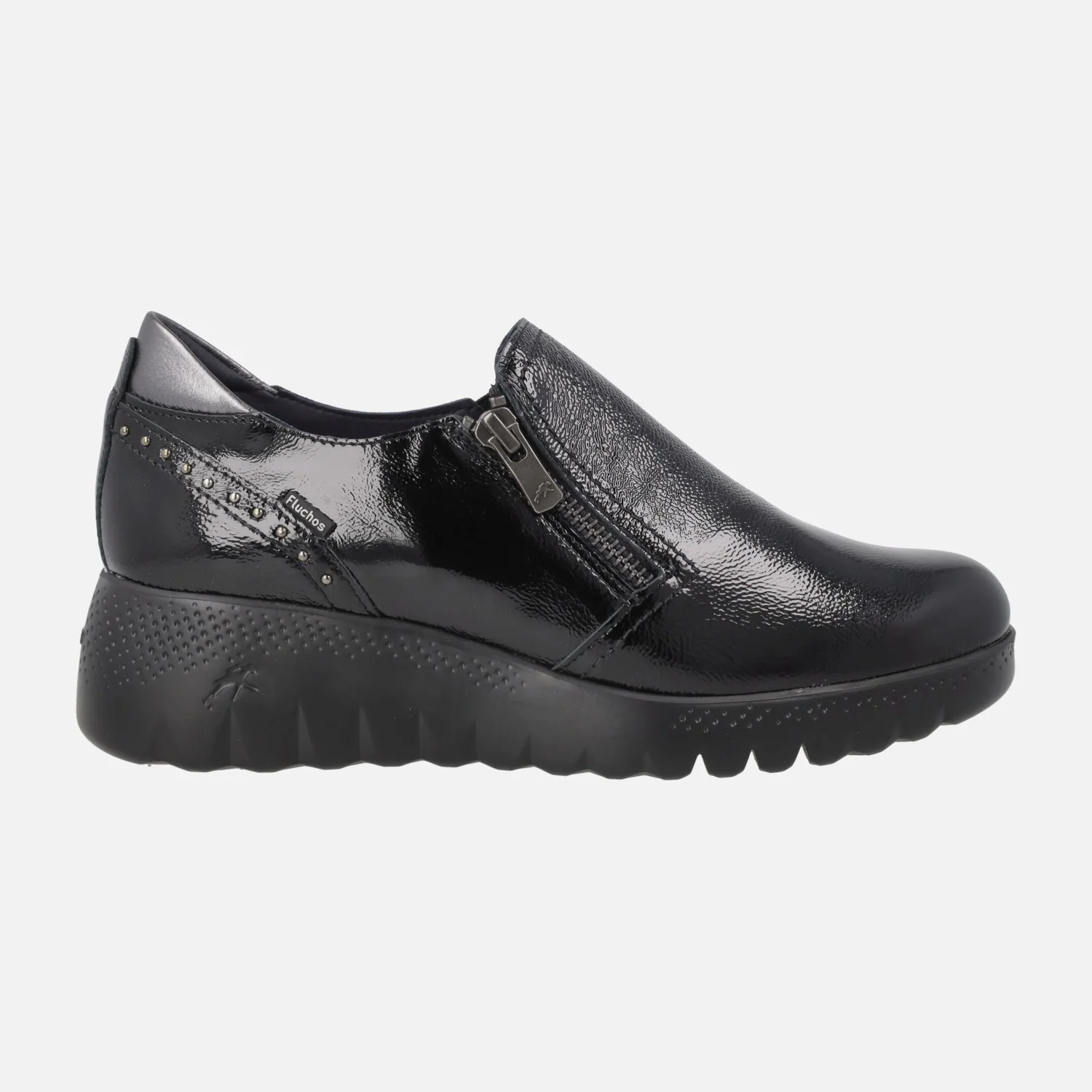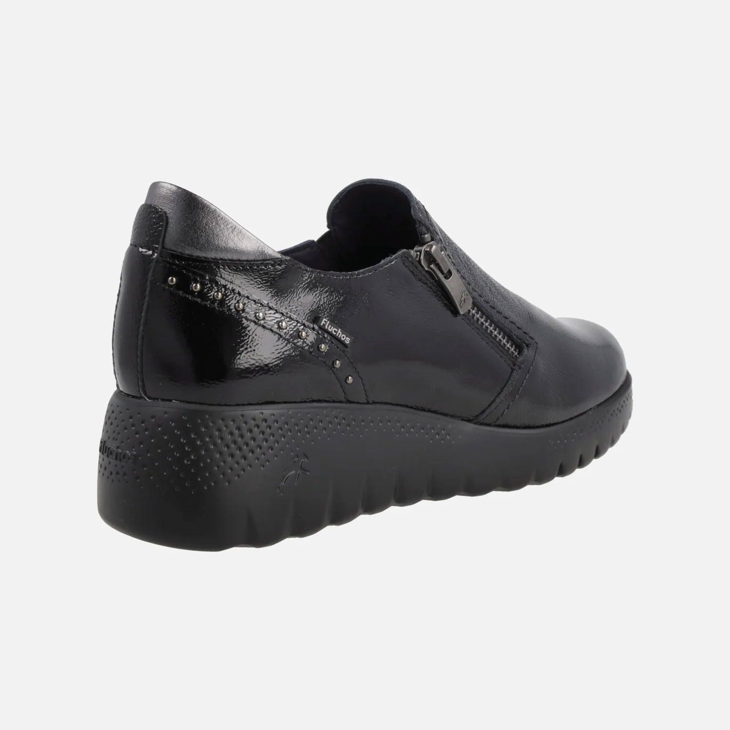 Zapatos confort para mujer de la marca Fluchos, modelo LIVE F2099 Naplack Negro. Zapatos de estilo deportivo, elaborados en piel charol color negro con pieza en metalizado plata en el talón. Cierre de cremallera en el lado exterior y pieza elástica en el lado interior para un mejor calce. Detalle de tachas plateadas en la parte de atrás. Interior textil con plantillas extraíbles. Piso sintético de 4,5 cm de altura trasera (2 cm parte delantera).
