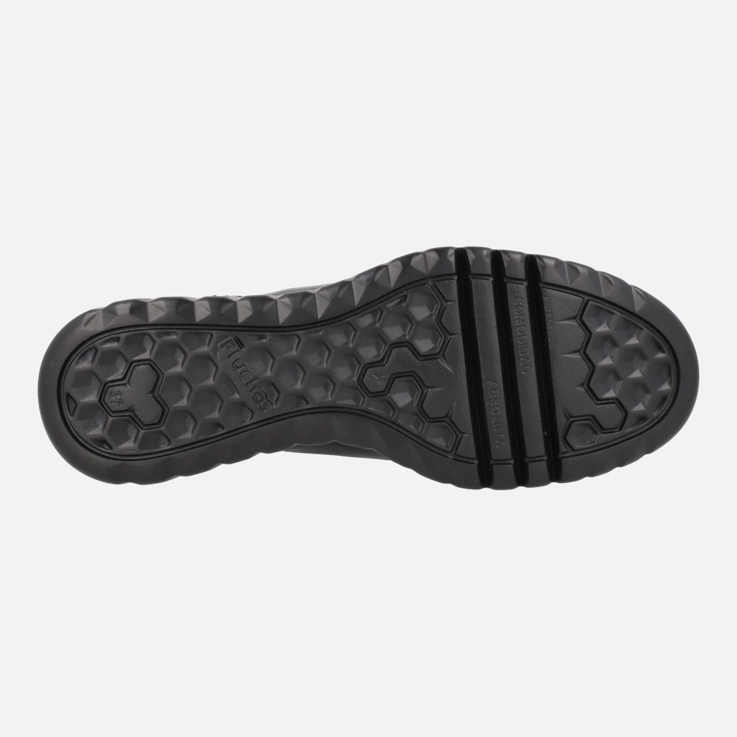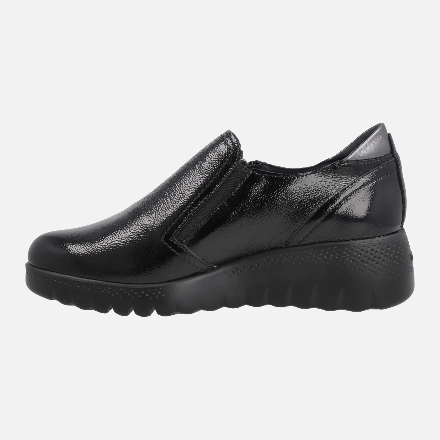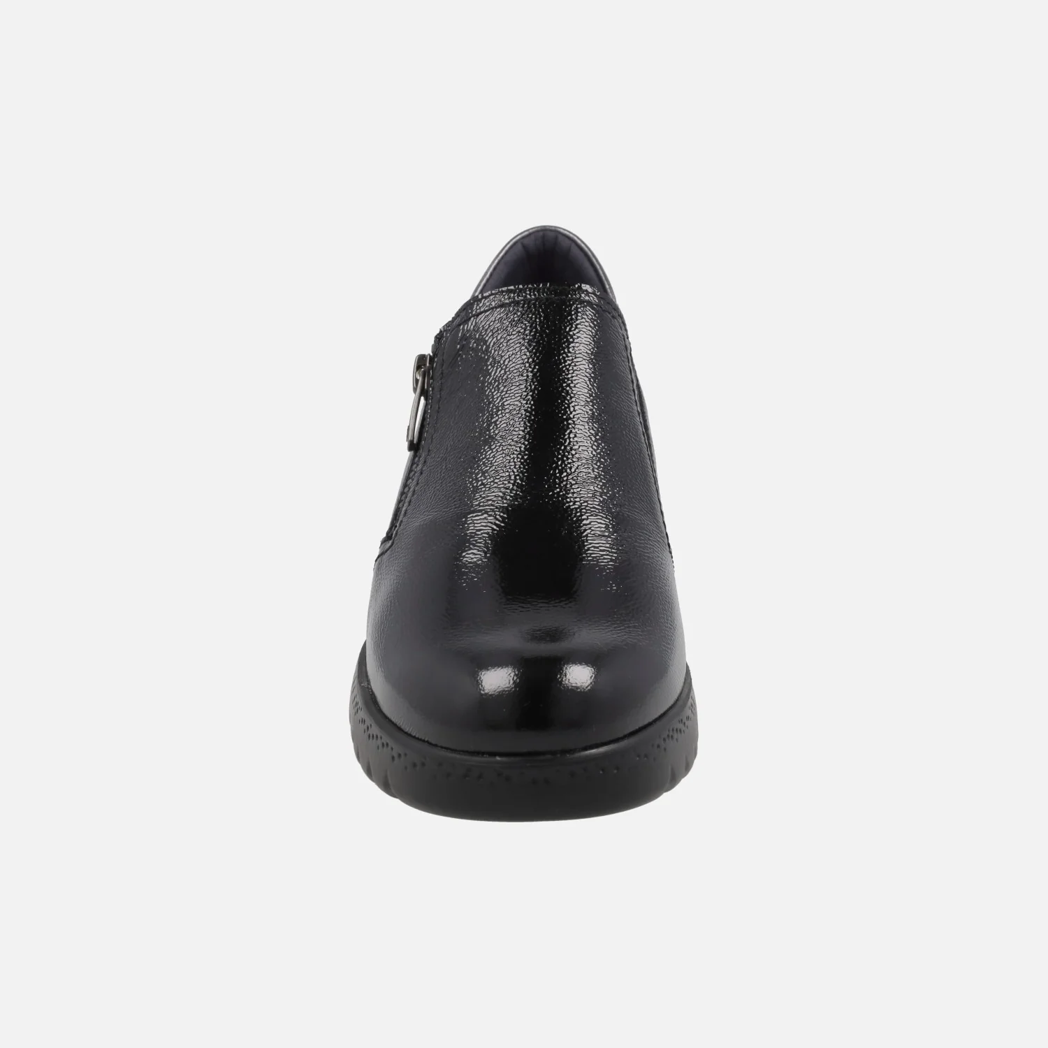 Zapatos confort para mujer de la marca Fluchos, modelo LIVE F2099 Naplack Negro. Zapatos de estilo deportivo, elaborados en piel charol color negro con pieza en metalizado plata en el talón. Cierre de cremallera en el lado exterior y pieza elástica en el lado interior para un mejor calce. Detalle de tachas plateadas en la parte de atrás. Interior textil con plantillas extraíbles. Piso sintético de 4,5 cm de altura trasera (2 cm parte delantera).