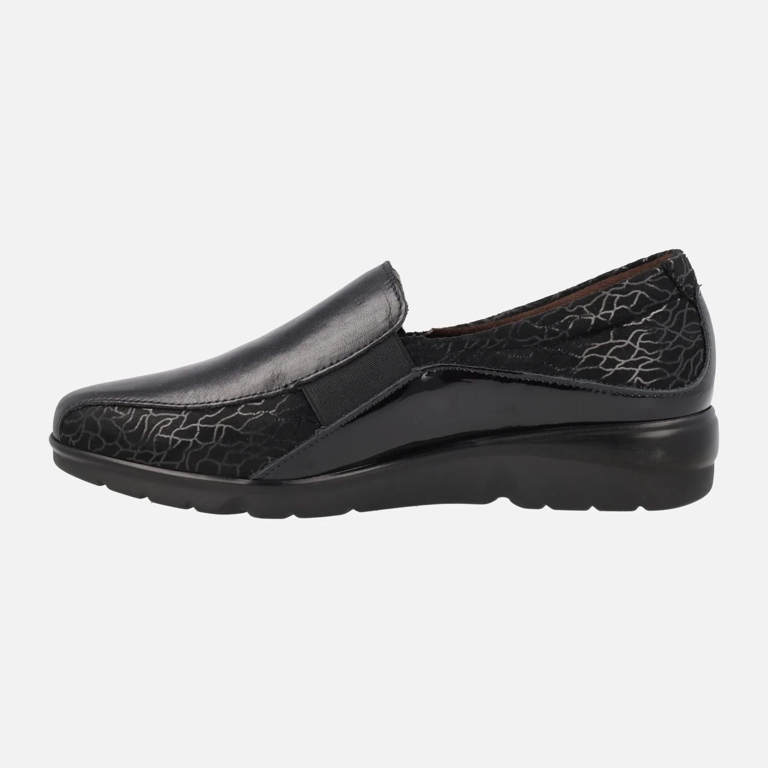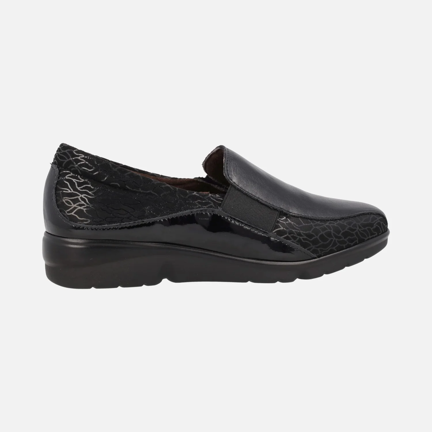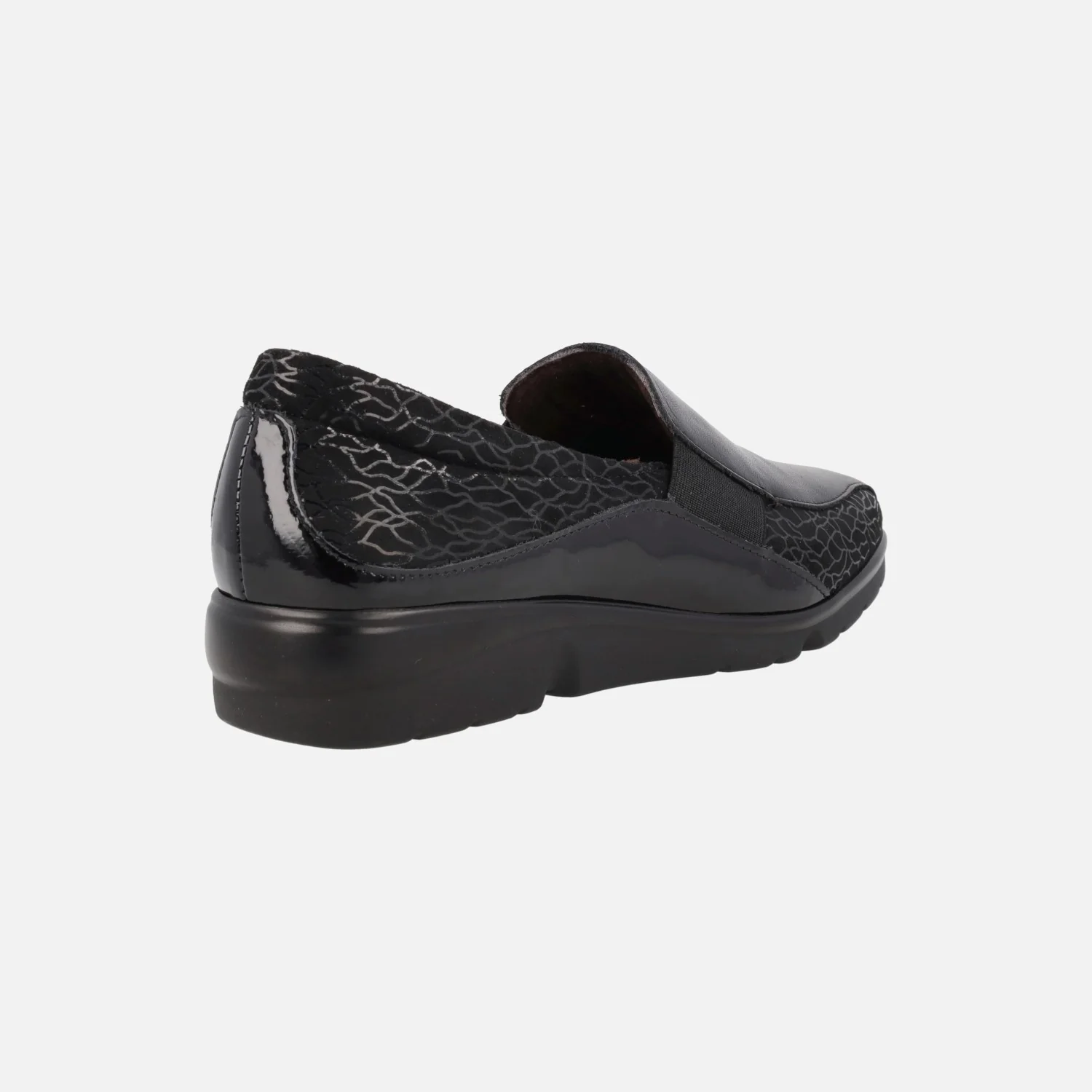 Mocasines confort para mujer de la marca Pitillos, modelo 1000 negro. Zapatos confort elaborados en piel negra combinada con tejido estampado negro. Elásticos laterales para mejor calce y sujeción. Interior textil, con plantillas extraíbles. Piso flexible de goma, con 3,5 cms de altura.