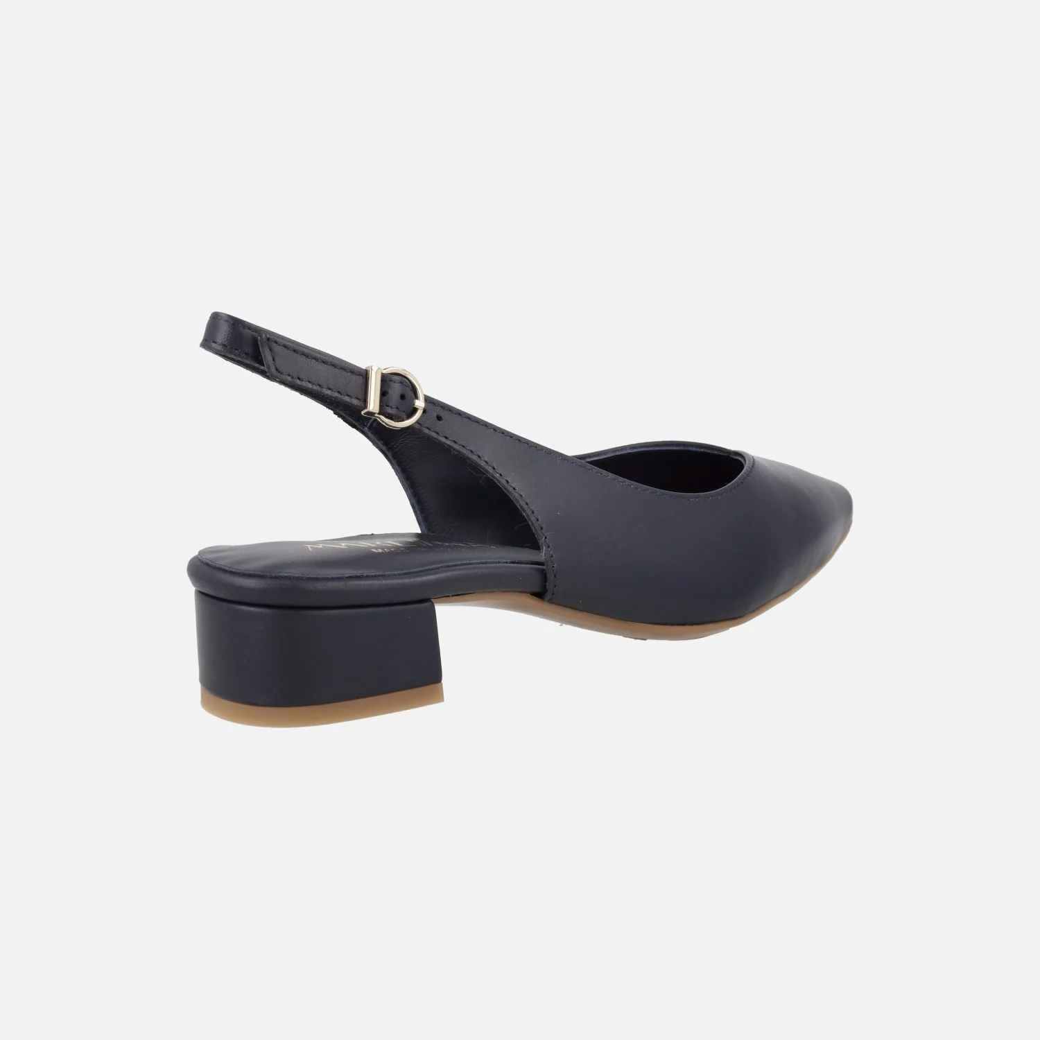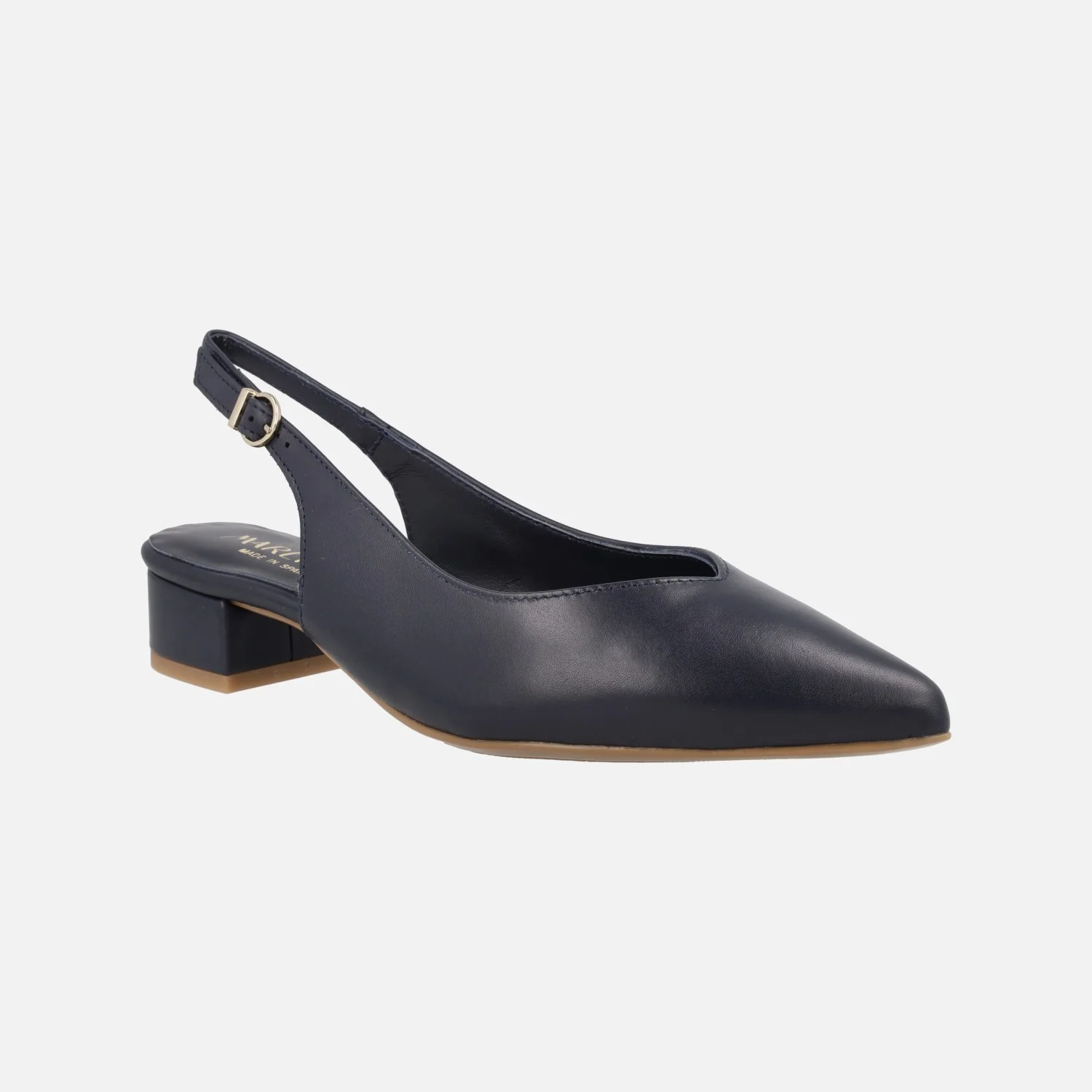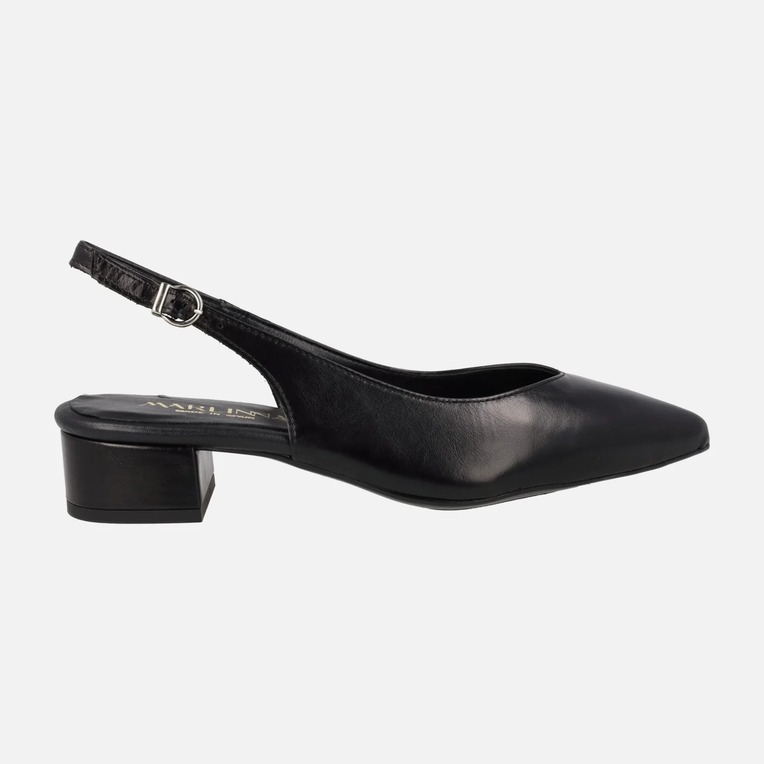 Salones destalonados para mujer de la marca Lince modelo 42856, disponibles en negro, azul marino y camel. Salones de piel destalonados, con tira al talón y cierre de hebilla. Horma ligeramente afilada. Forro y planta de piel. Tacones de 4 cms de altura.