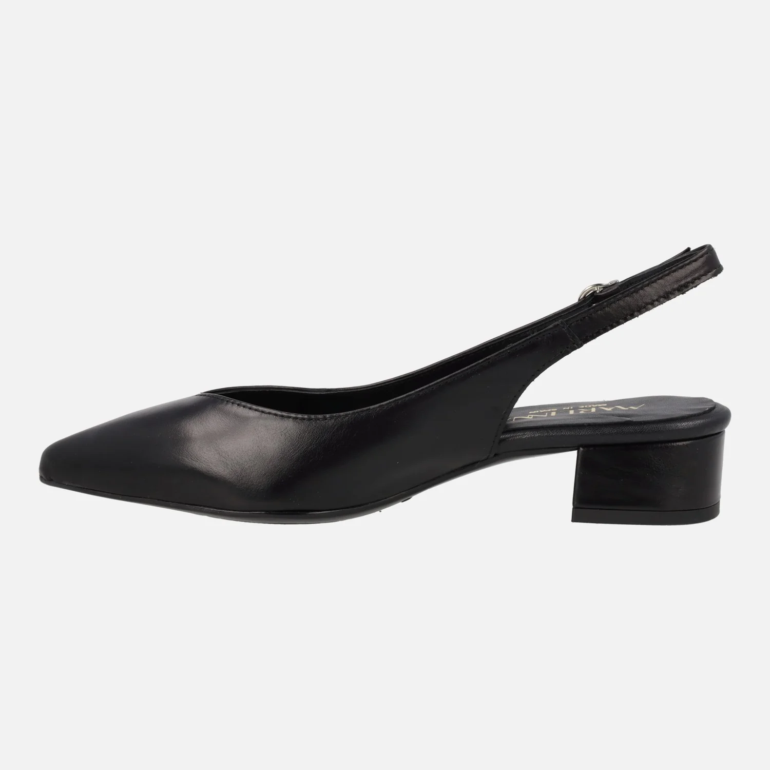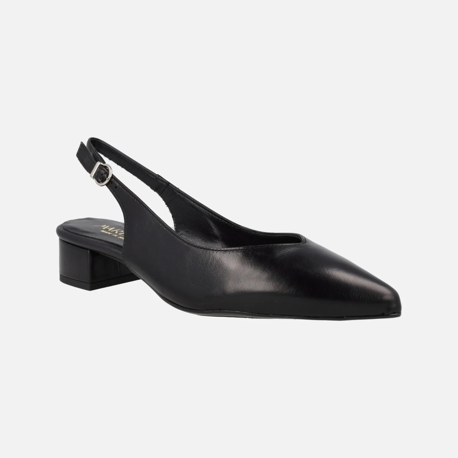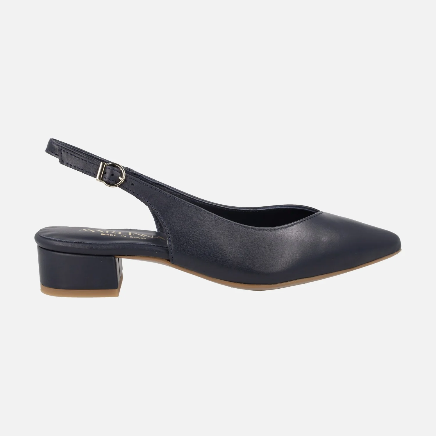 Salones destalonados para mujer de la marca Lince modelo 42856, disponibles en negro, azul marino y camel. Salones de piel destalonados, con tira al talón y cierre de hebilla. Horma ligeramente afilada. Forro y planta de piel. Tacones de 4 cms de altura.
