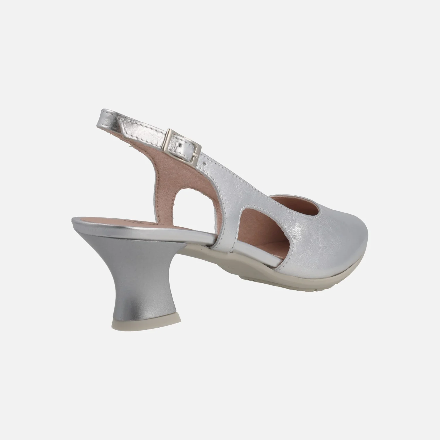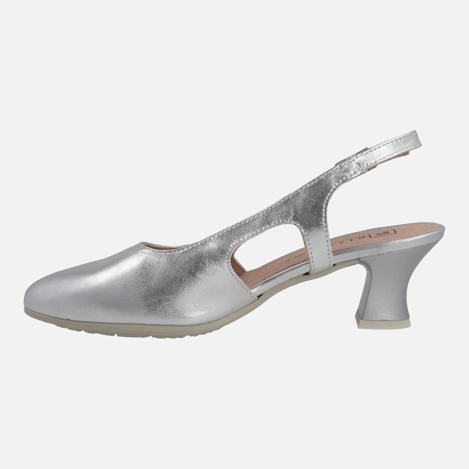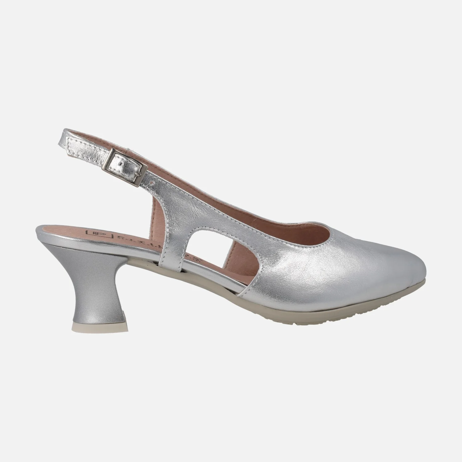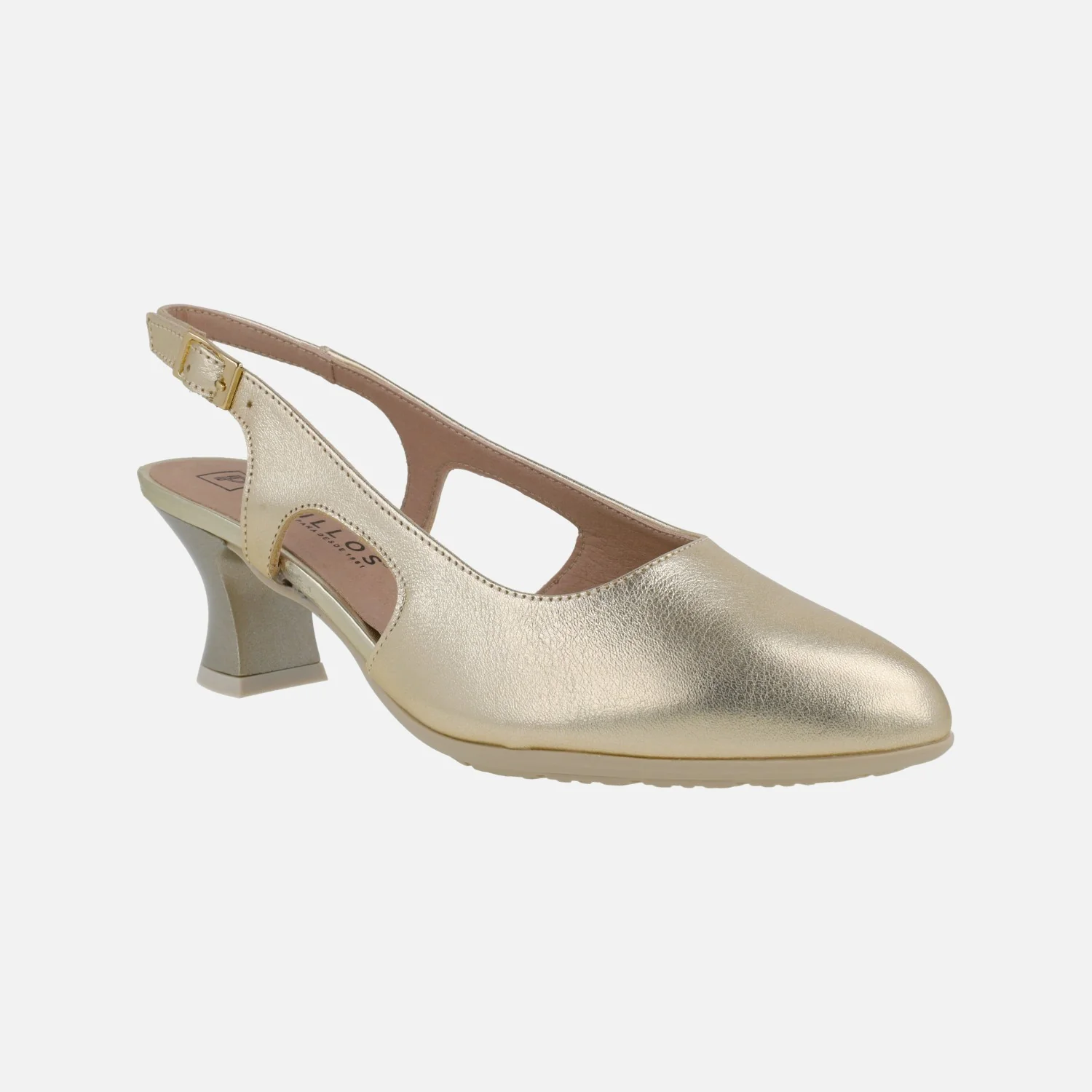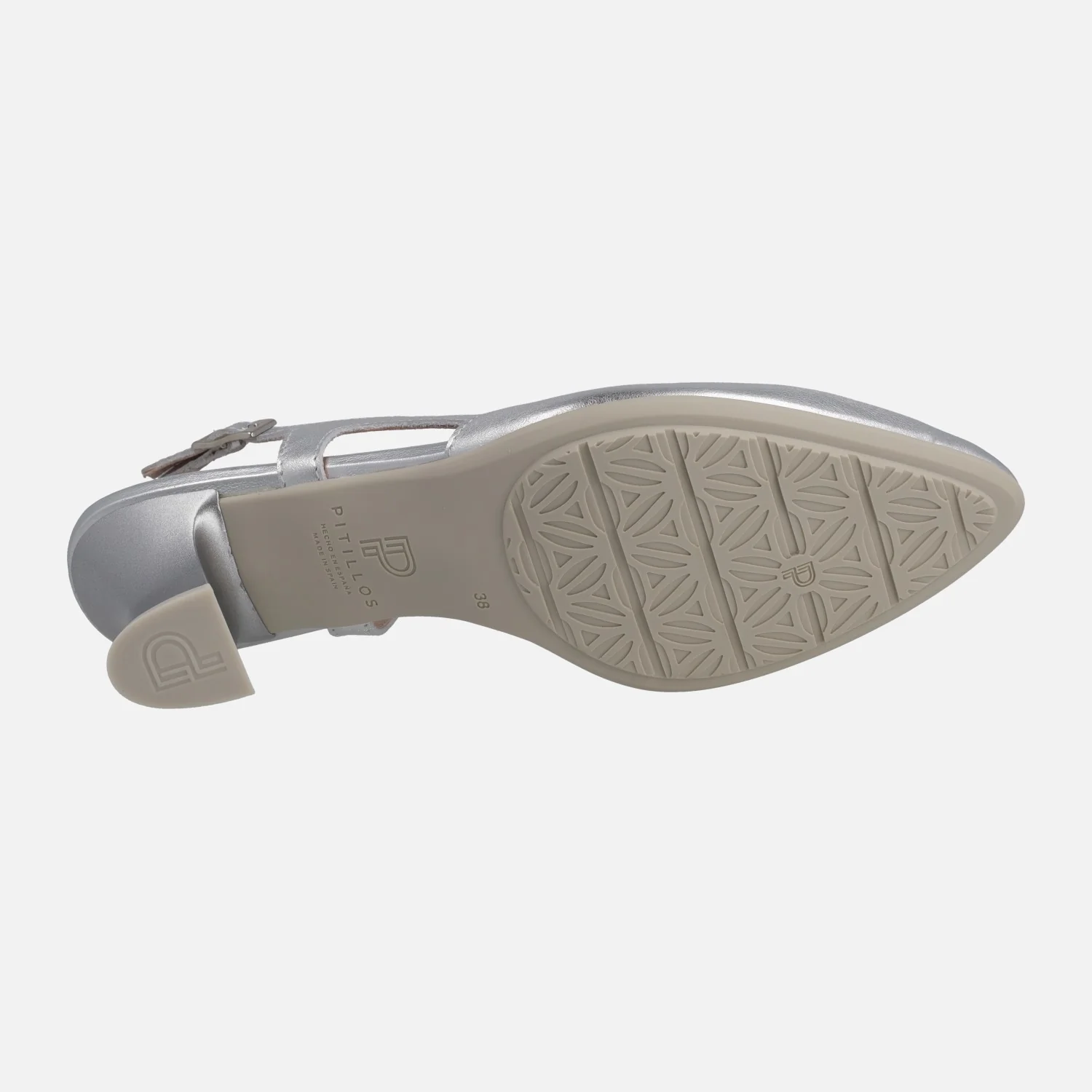 Salones destalonados elaborados en pieles metalizadas de la marca Pitillos modelo 10513, disponibles en plata, oro y azul marino. Salones de piel con tira al talón y cierre de hebilla regulable. Interiores en combinado de tejido y sintéticos. Suela sintética con tacones de 6 cms de altura.