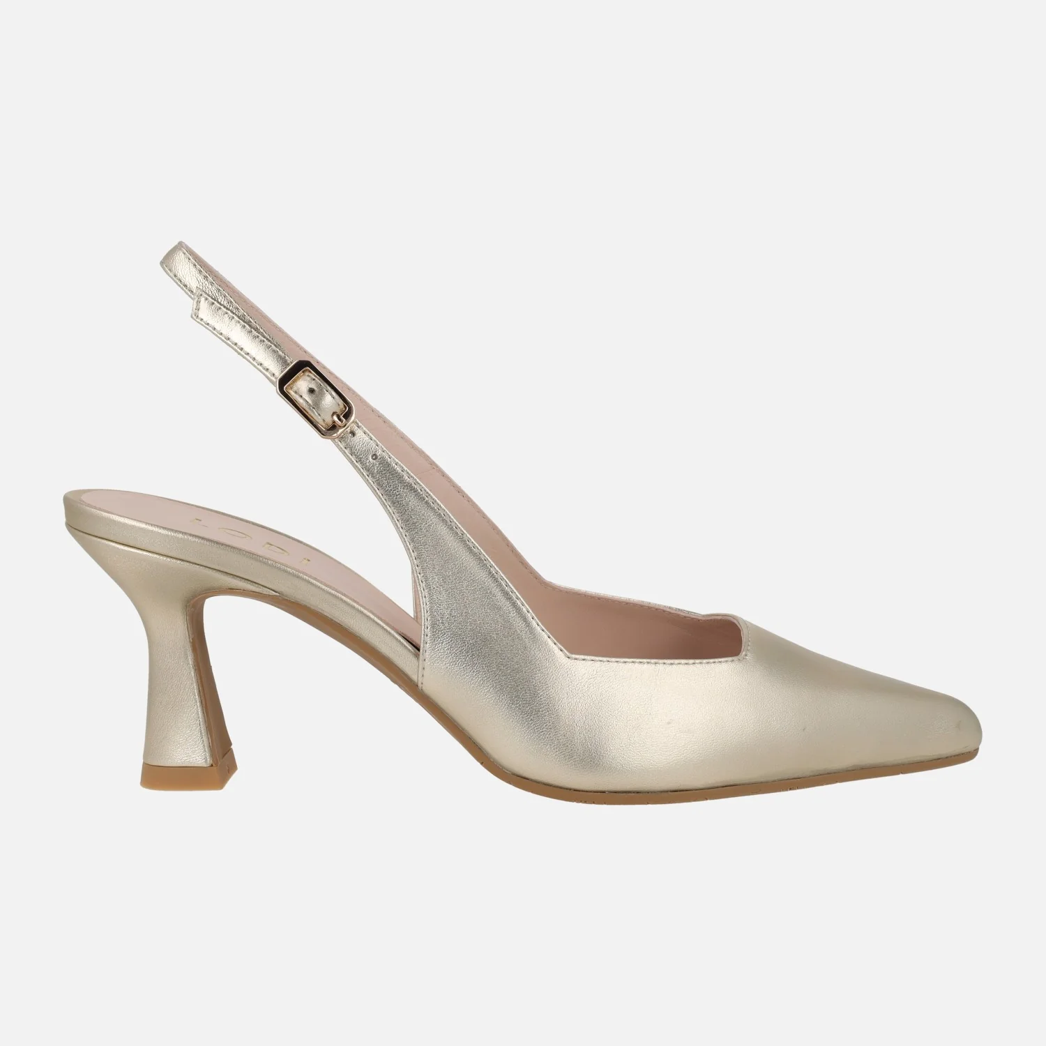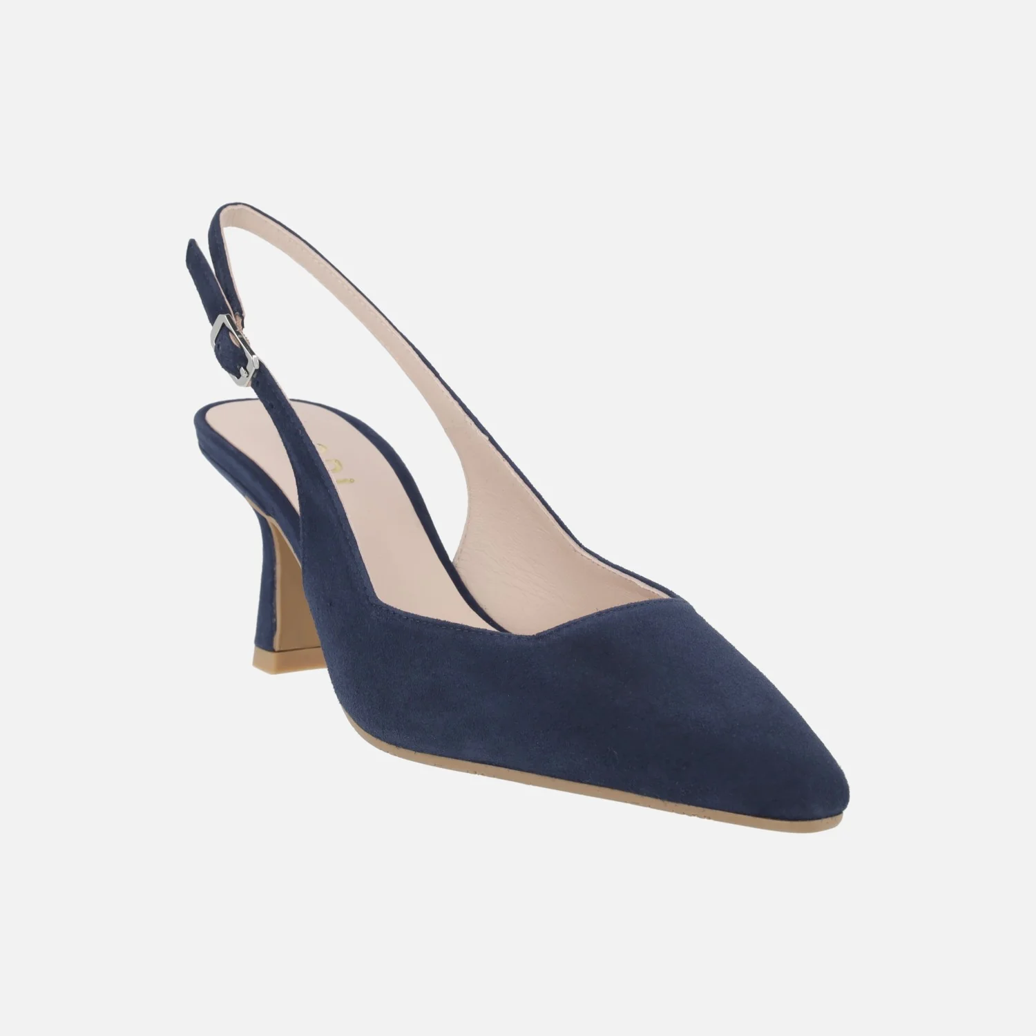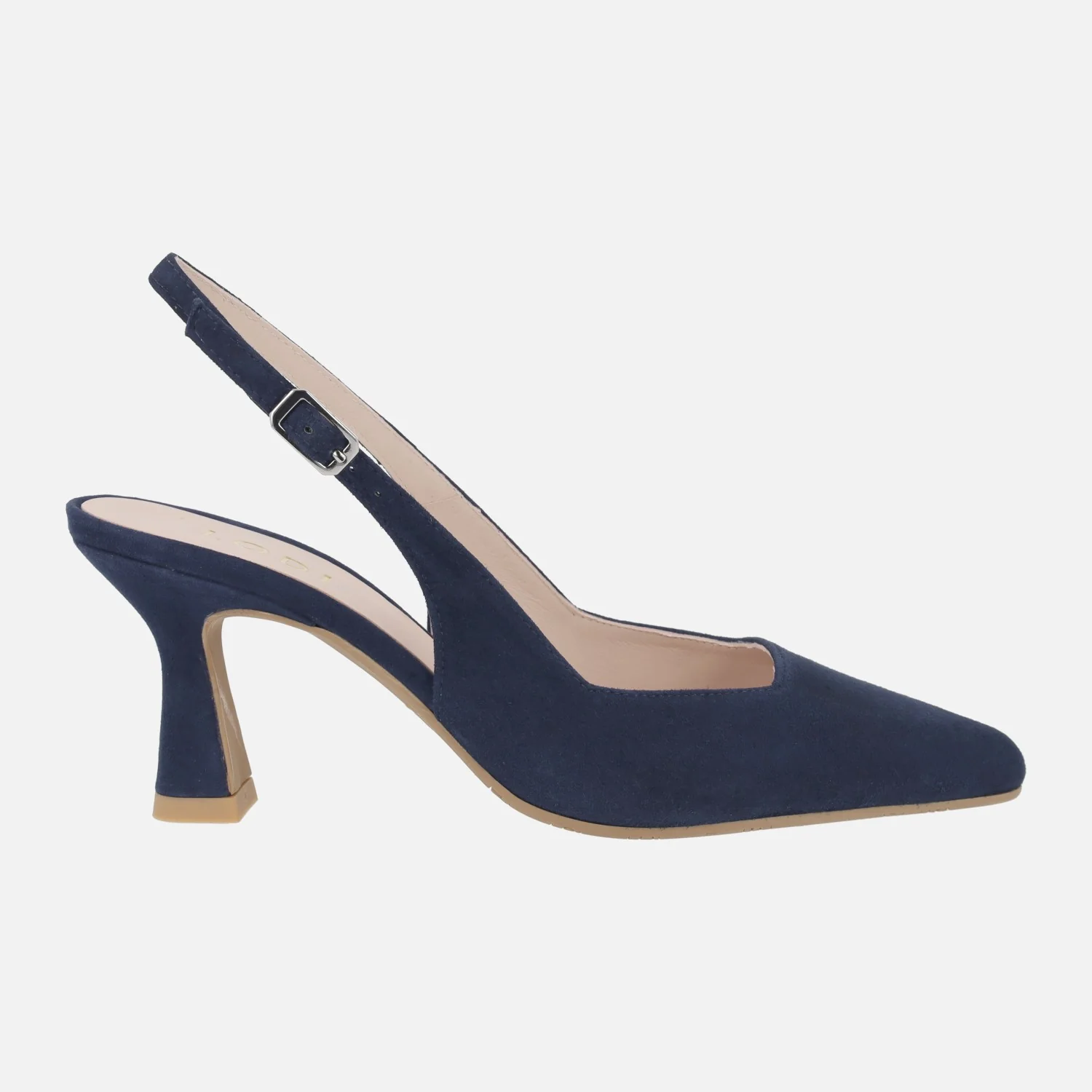 Elegantes zapatos corte salón para mujer de la marca Lodi, modelo Gelines-X. Zapatos destalonados, elaborados en ante oceano (azul marino) o en piel metalizada oro (cosmos cava) con tira al talón y cierre de hebilla. Puntera afilada, escote cuadrado. Interiores de piel, planta new gel. Tacones de aproximadamente 8 cms de altura, forrados. Made in Spain.