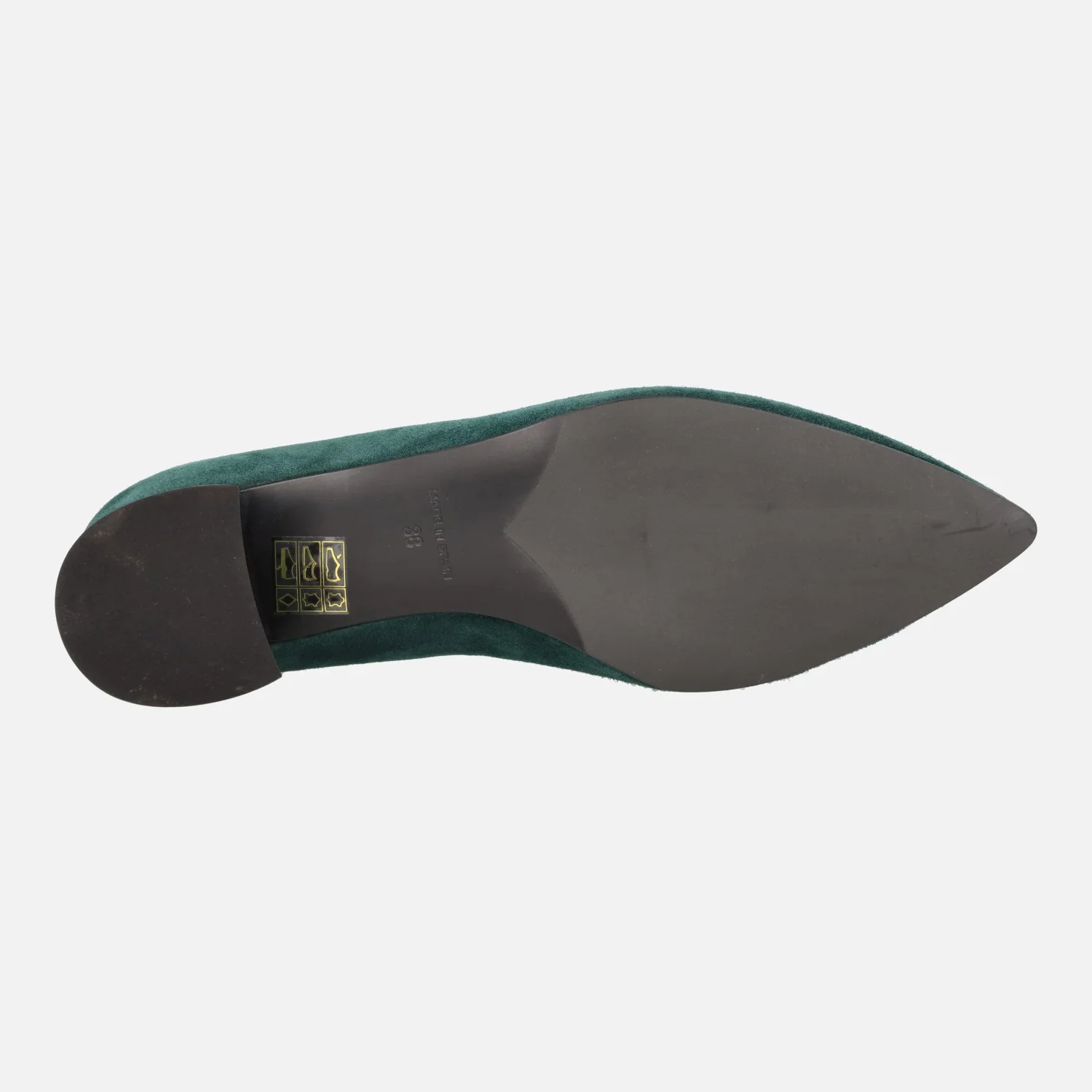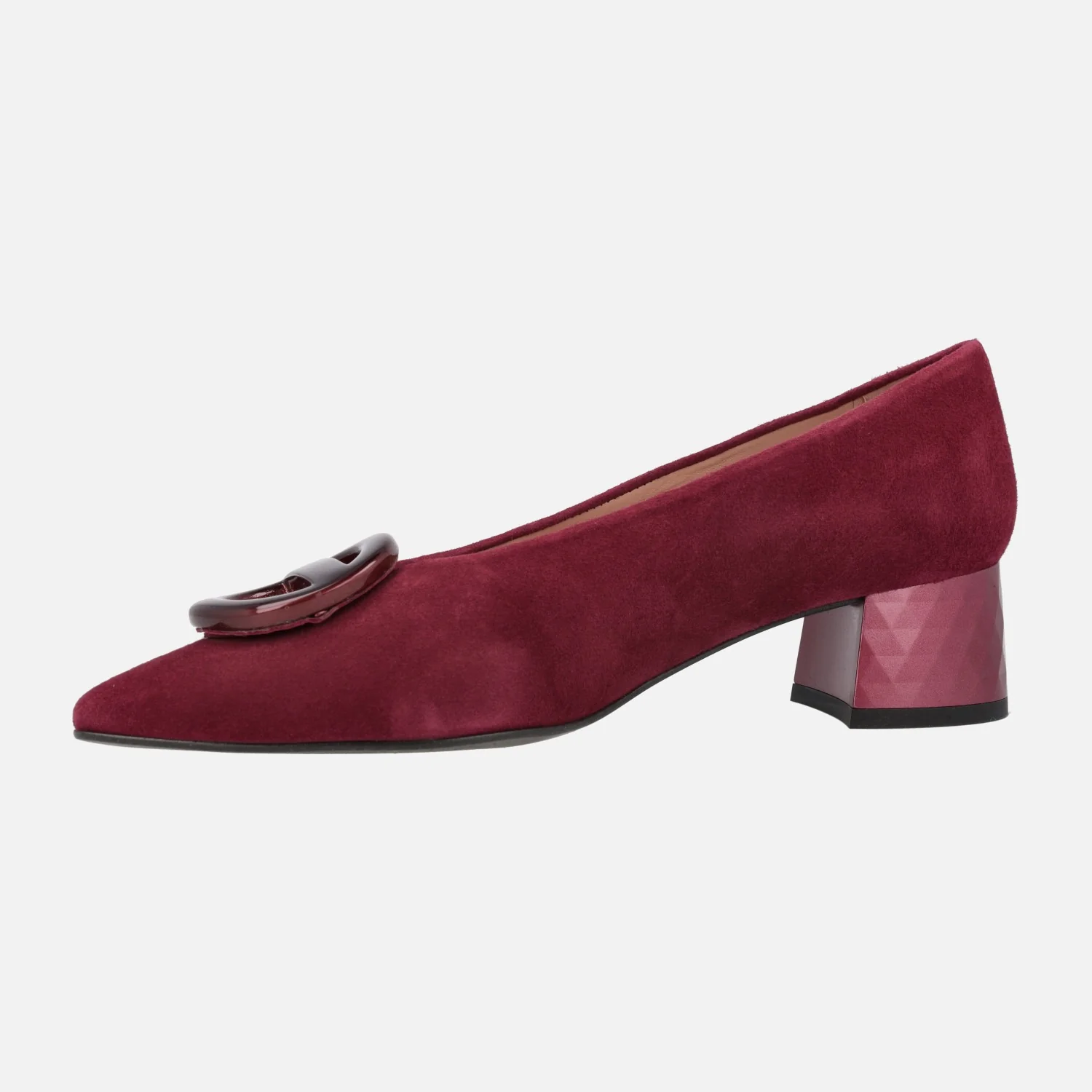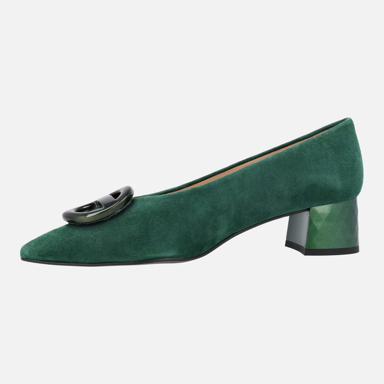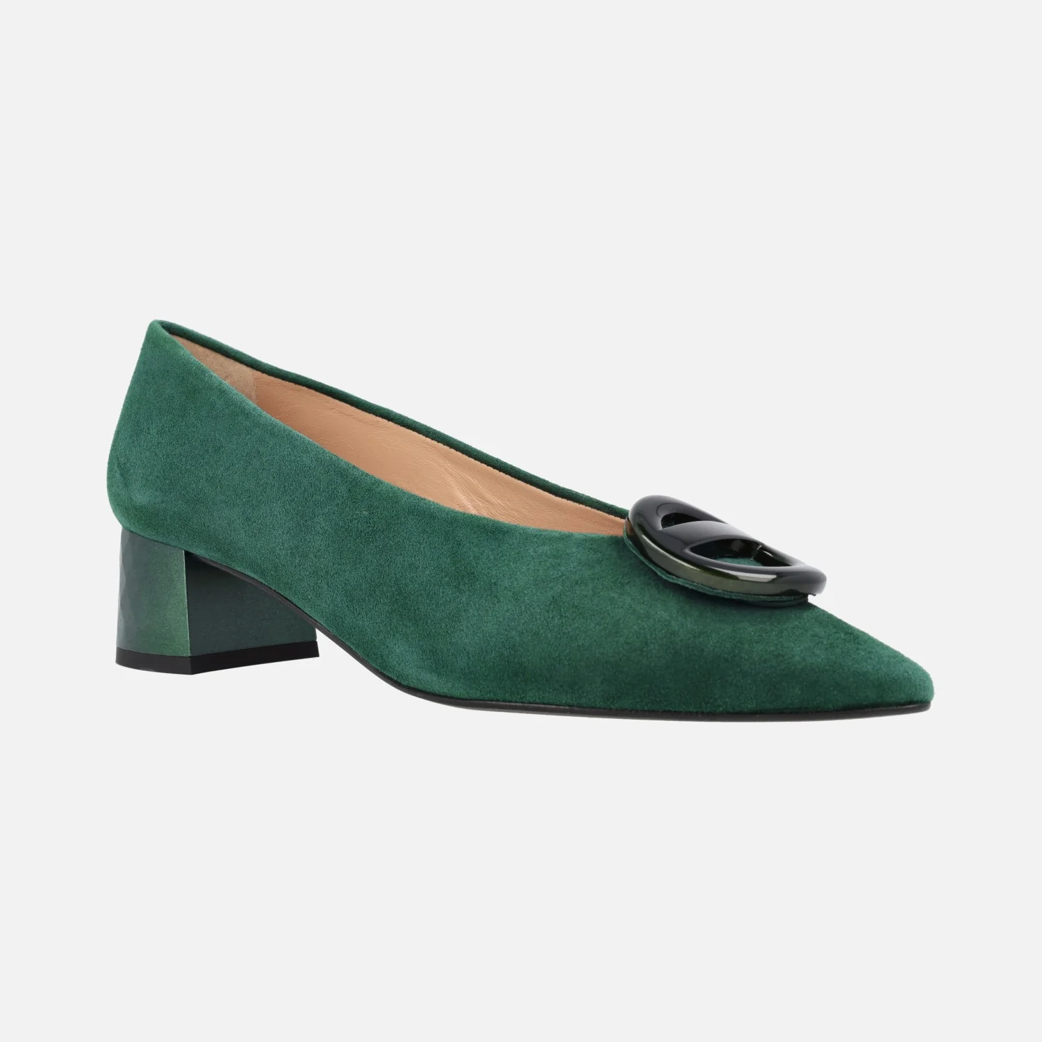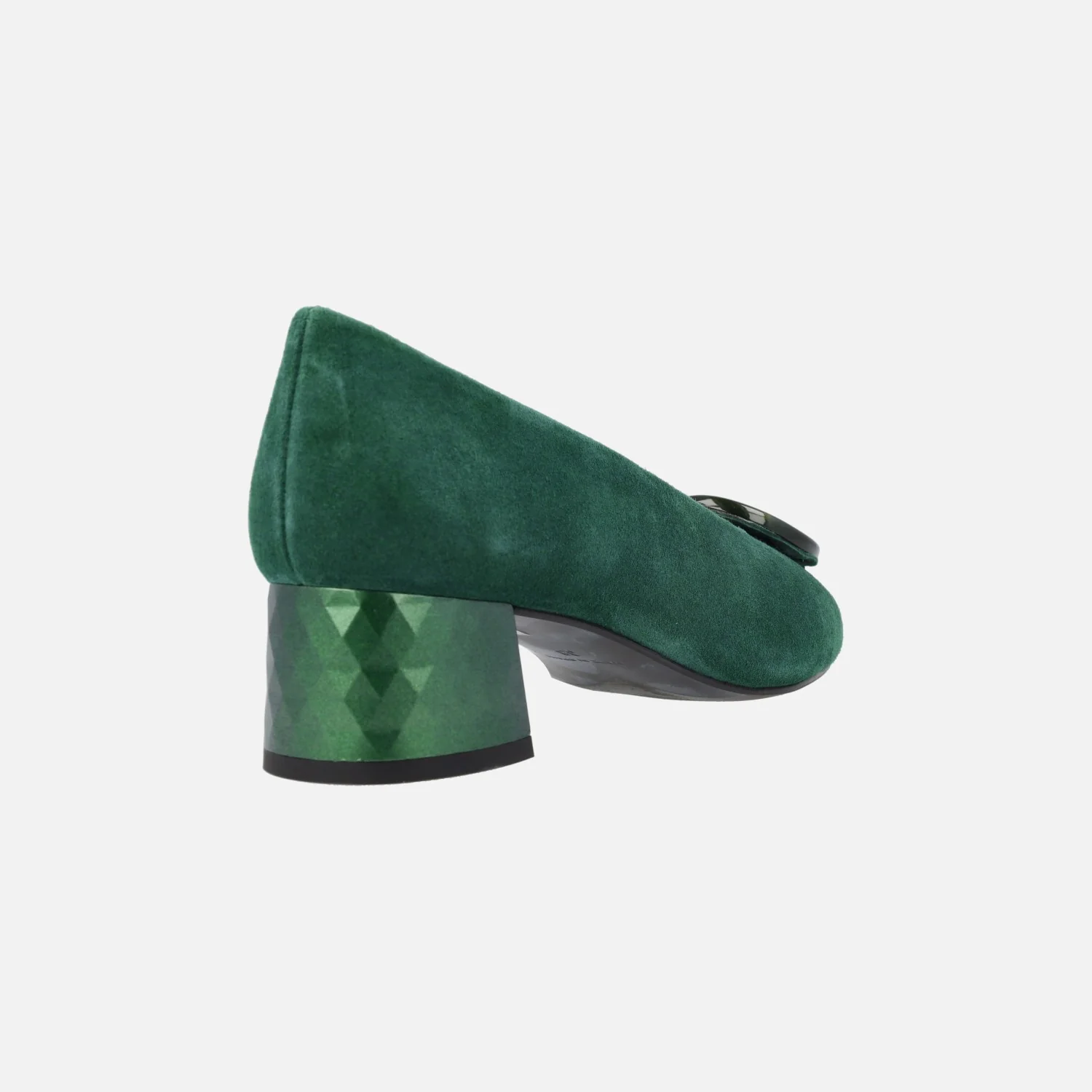 Preciosos zapatos de tacón bajo de la marca española Escalzia, modelo Iga. Zapatos de ante, disponibles en verde, burdeos y negro, con elegantes tacones efecto prisma, metalizados y un adorno circular de pasta en la pala. Interiores forrados de piel. Altura de tacones 4,5 cms. Made in Spain.